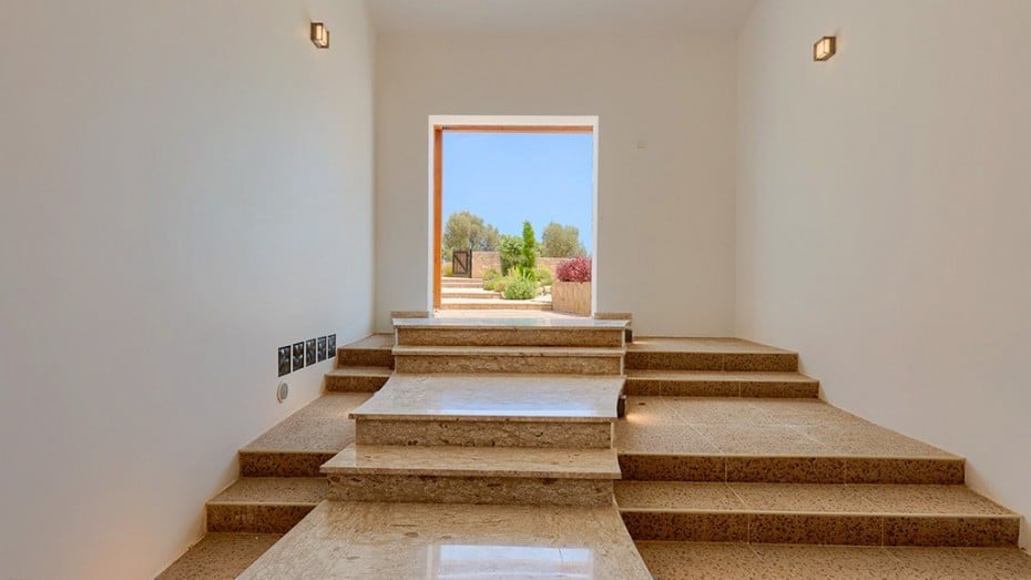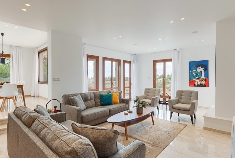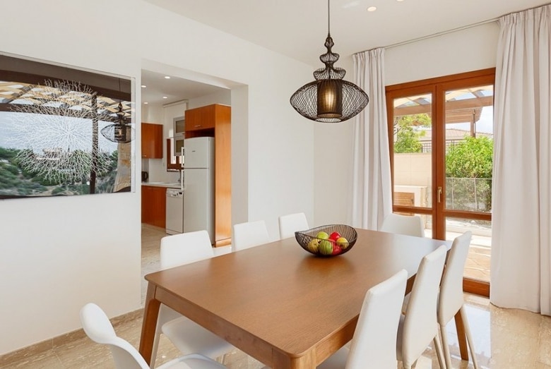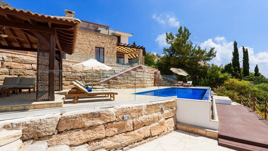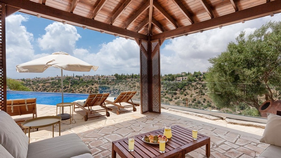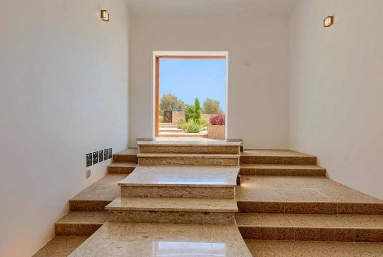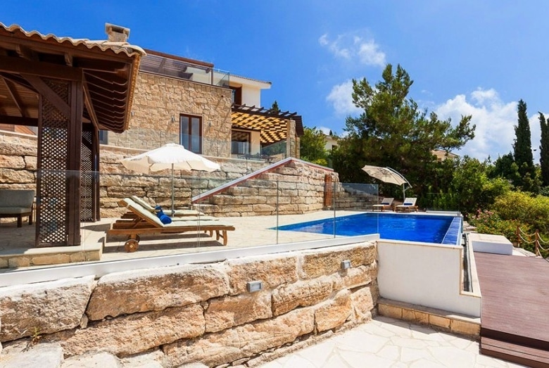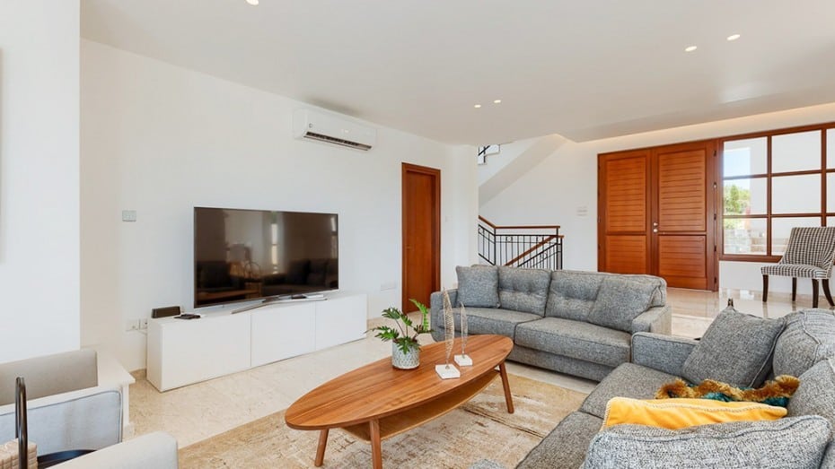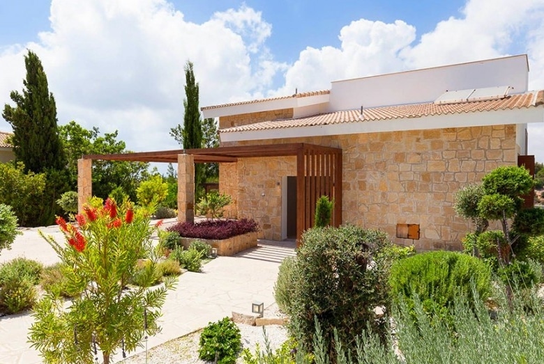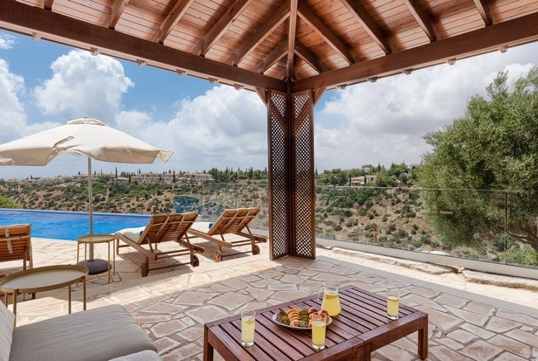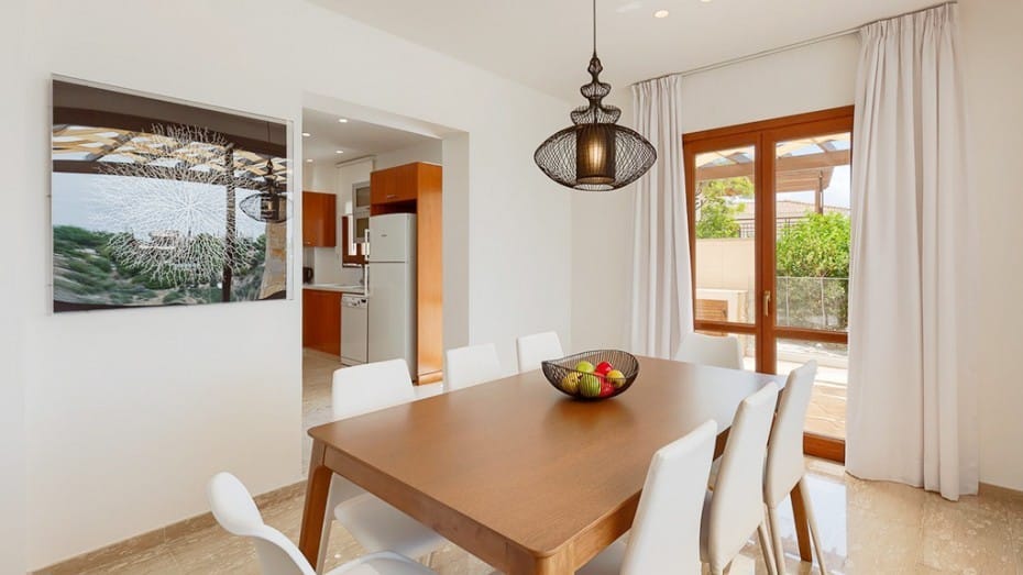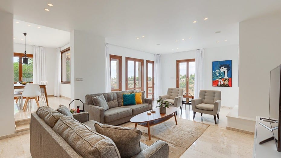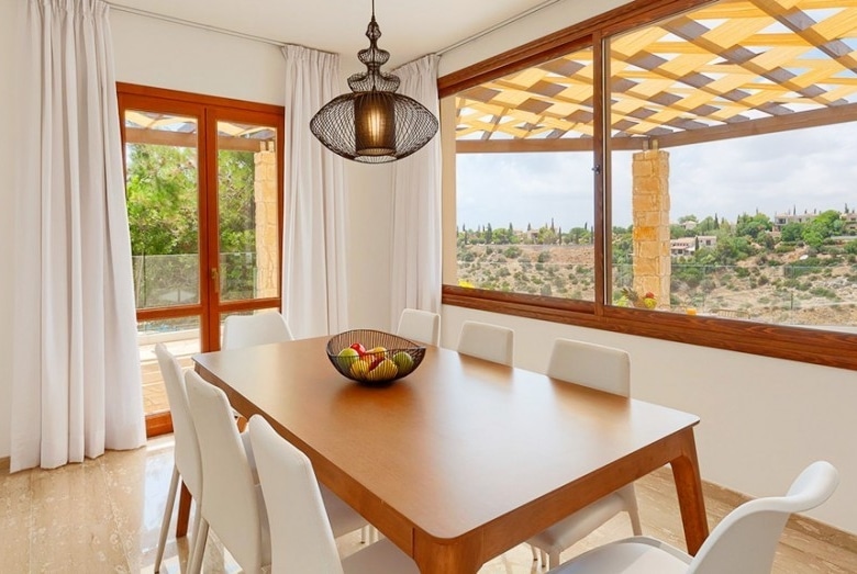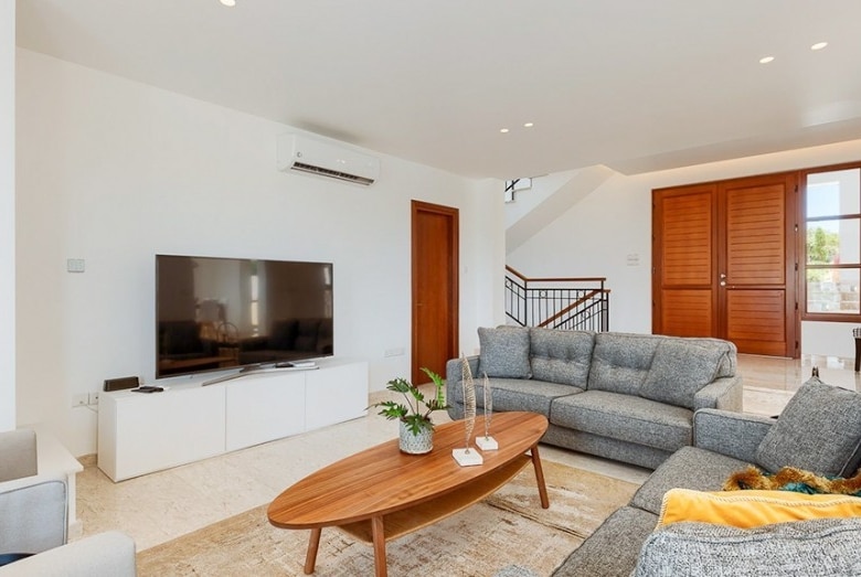 This delightful property is a newly completed detached villa on the East Plateau at Aphrodite Hills. The villa has four bedrooms and five bath/shower rooms and with so many additional features would make an extremely popular rental property. The villa, which is on a tiered plot, over looks the central ravine of the Resort with sea and sunset views to the side. The property has a generous front garden and ample parking for several cars with sensor lighting.