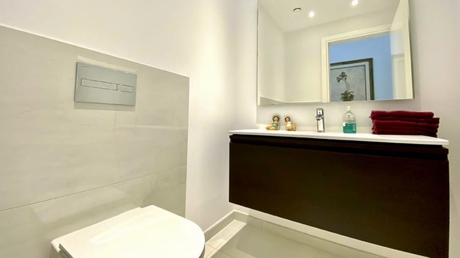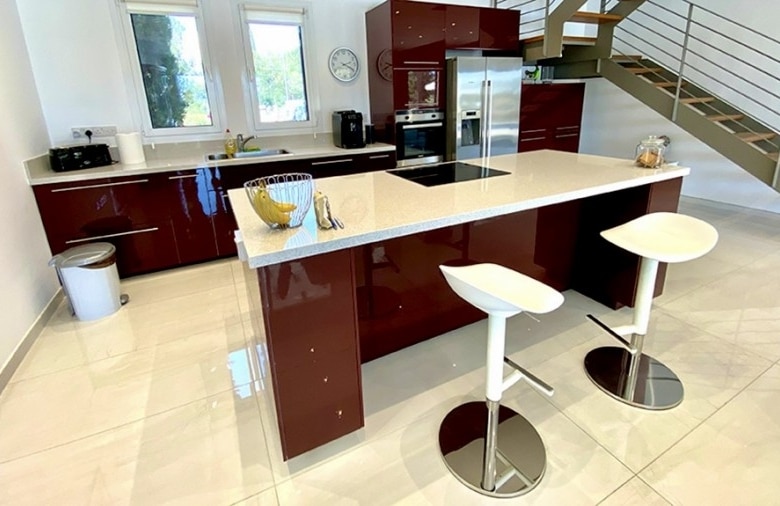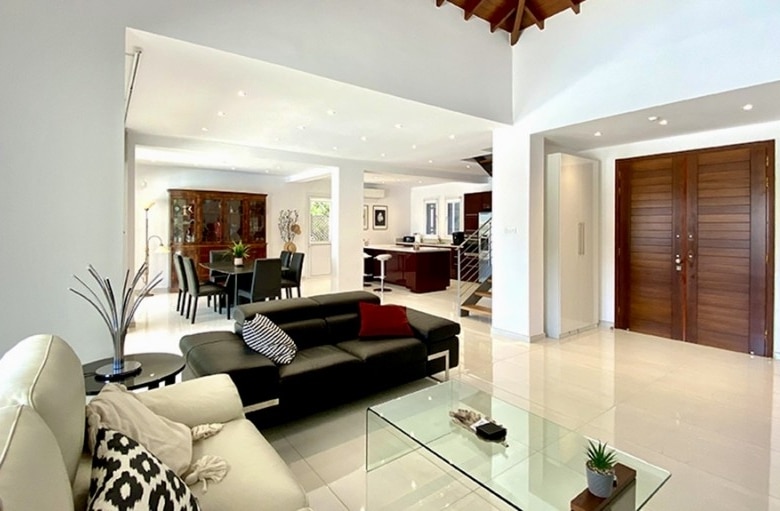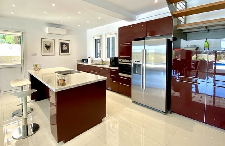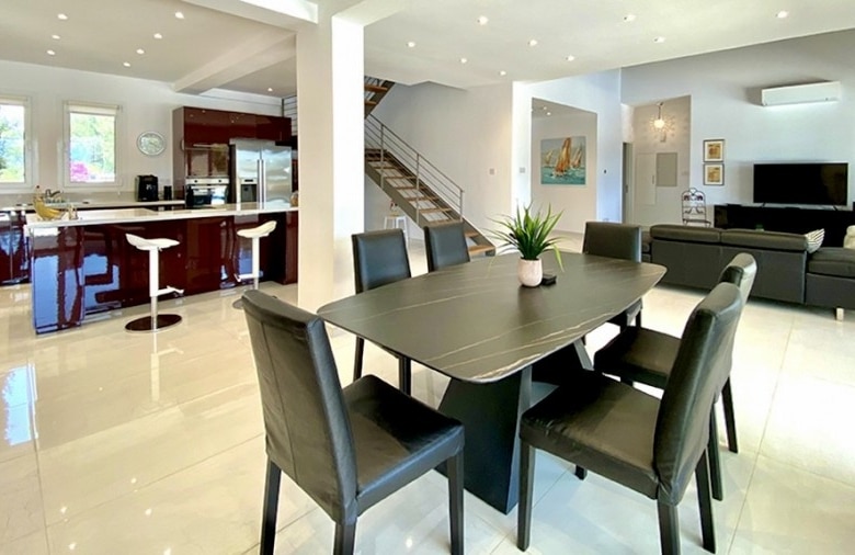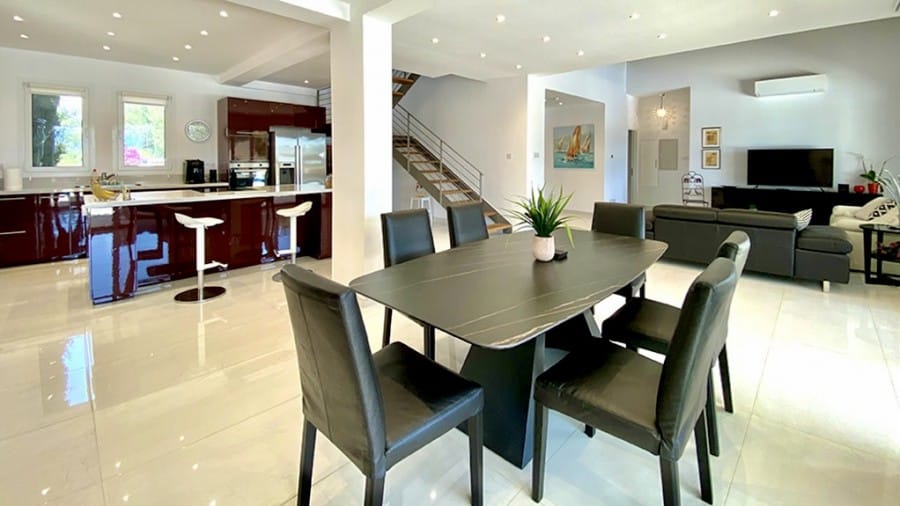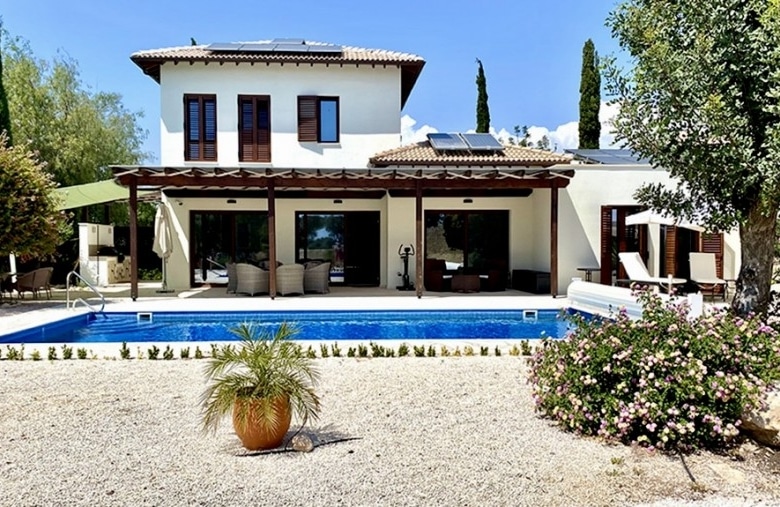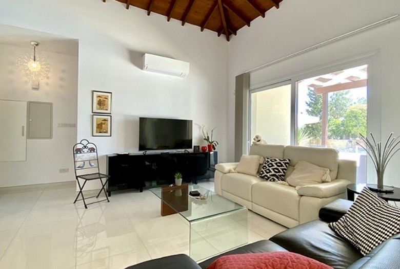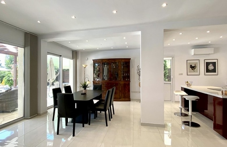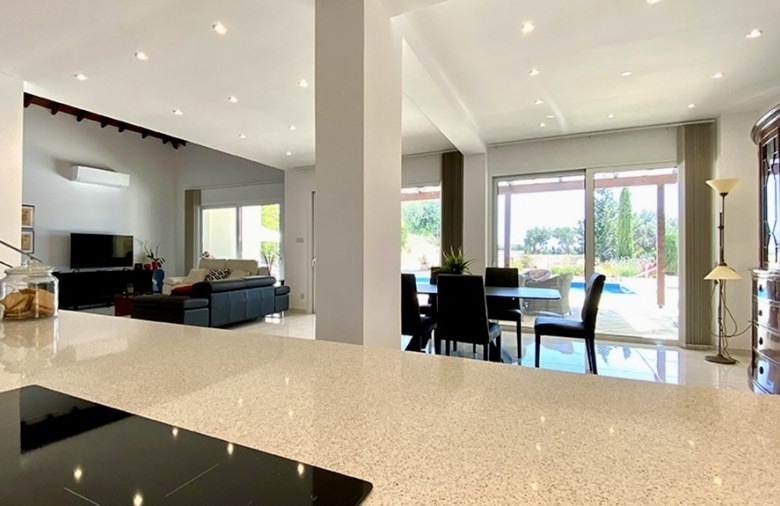 We are delighted to bring to the market for the first time a recently totally renovated 4 bedroom frontline golf villa. The works were completed in 2020, when the villa was stripped down to its bare structure and enlarged and reconstructed with replacement pipework, sanitary installations and electric wiring. Underfloor heating was installed throughout the villa together with a photovoltaic panel installation producing 12000kwh per annum. Maintenance free aluminium doors and windows with fly screens were fitted throughout the villa and the building was completely insulated in order to meet the latest EU energy and environmental ecological standards. The air conditioning units are all of the latest inverter type as is the Fairchild heat exchanger for heating the swimming pool. The swimming pool has a solid electric cover and uses the latest ioniser technology to soften the water and reduce chlorine consumption. The domestic water is also softened. The original Thalia designed bungalow was enlarged to form an internal size of 212 sqm on a plot of 1580 sqm with 45 sqm of covered terrace together with a removable pergola for extra shading. All planning approvals were completed and approved by the relevant authorities.