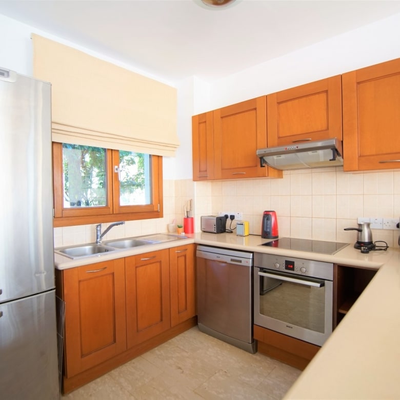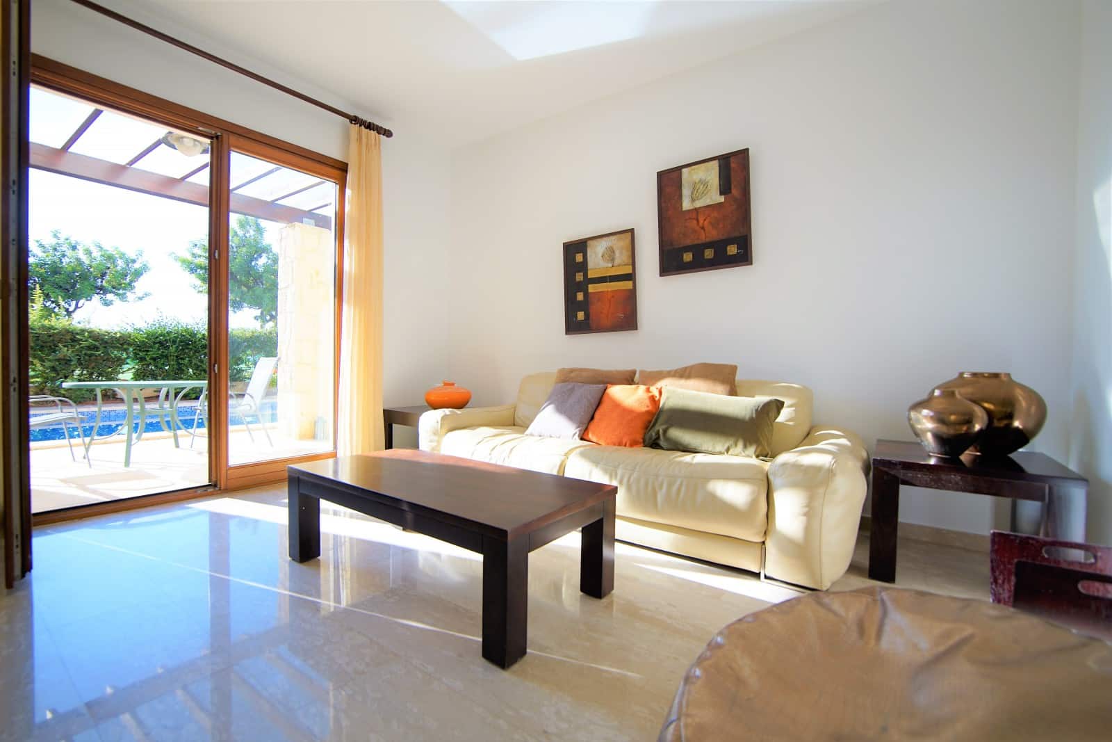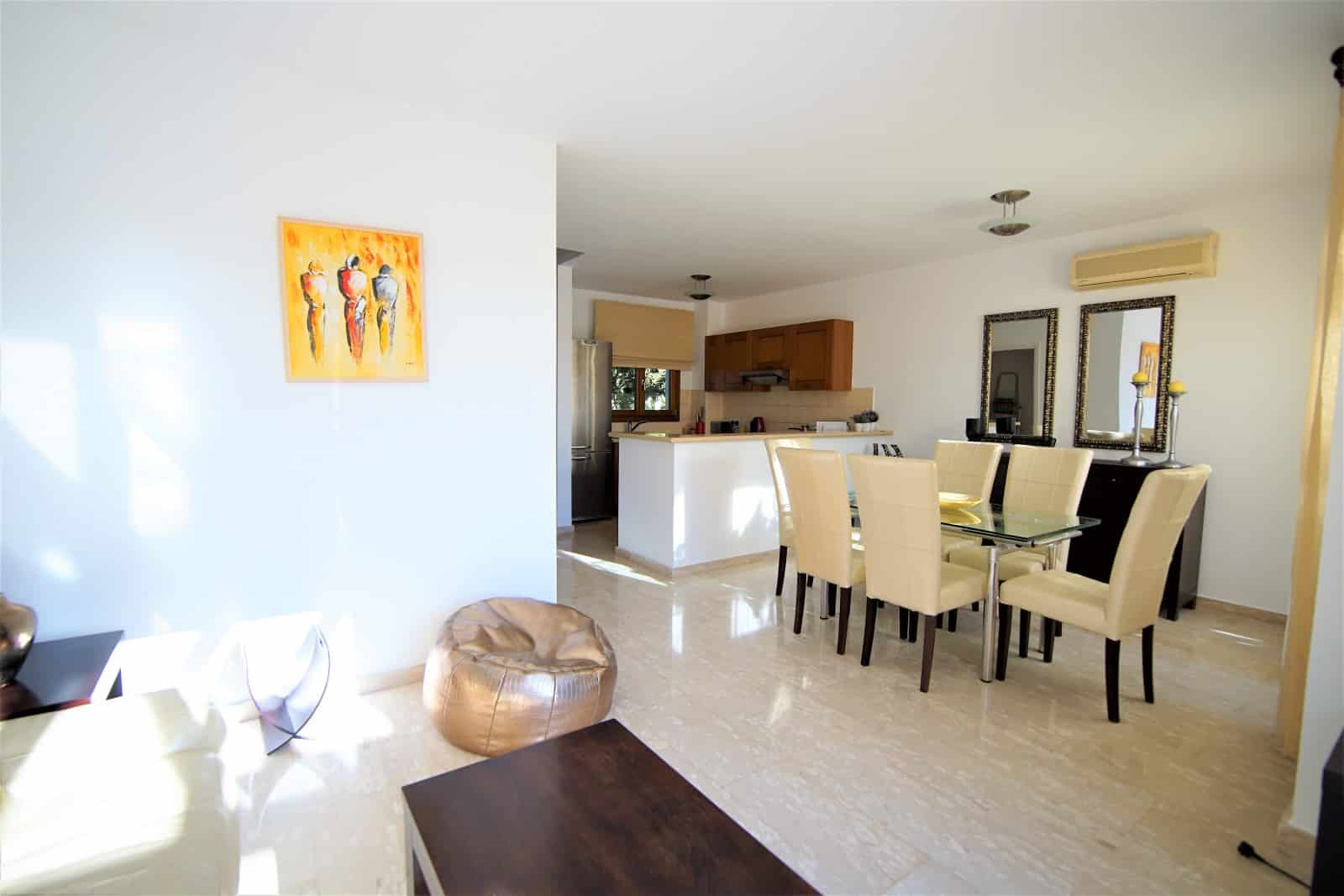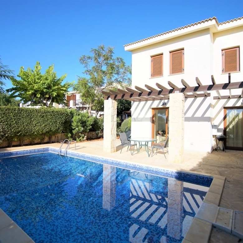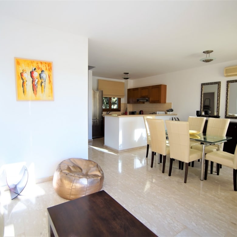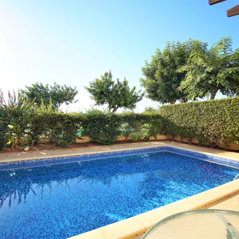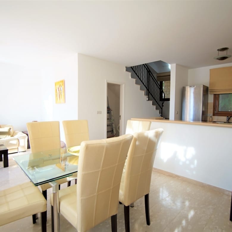 Amazing 3 bedroom Junior Villa located in the very popular Hestiades Greens area with a front and rear garden and private swimming pool with great views of the gold course from the pool terrace and the first floor windows. From the road, a lockable gate and footpath lead to the front door which opens into the hall area with steps leading down to the kitchen, living and dining area. There are hardwood patio doors leading from the dining and the living areas out to the pool terrace and garden where there is ample room for a patio dining table and chairs.