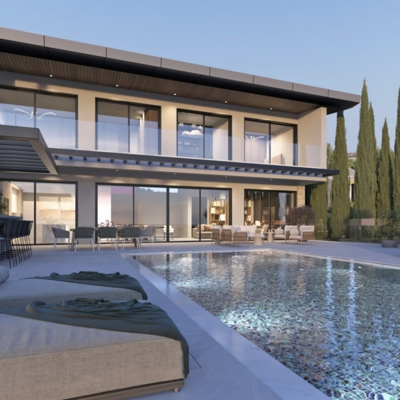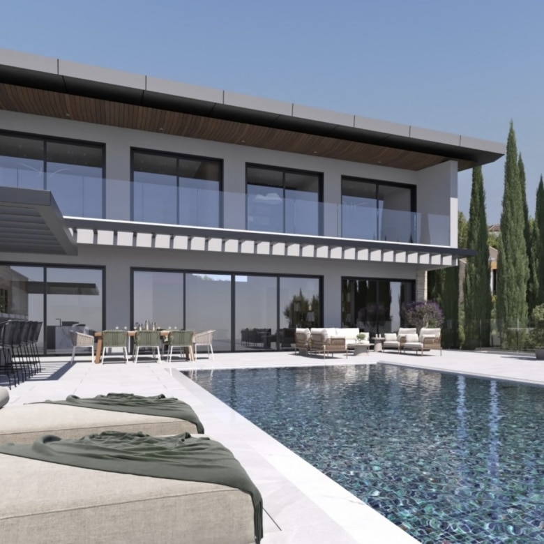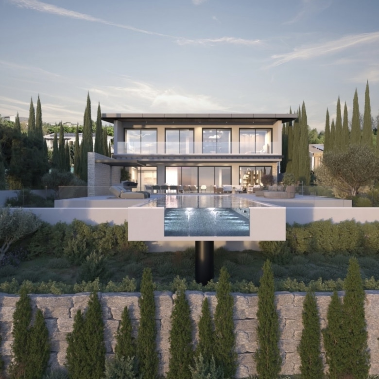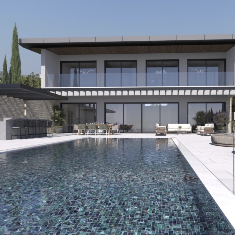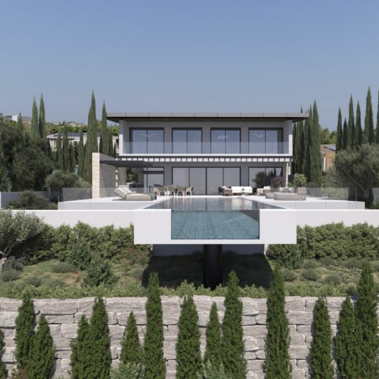 This property represents one of the last opportunities to purchase a new state of the art luxury villa on the front line of Aphrodite Hills. It is currently in construction with completion around 12 months away. It will be built with the emphasis on high ceilings and opan plan living with light filled areas maximized by the abundance of glass. It will be furnished with the Roberto Cavalli brand throughout offering wooden floors and high end fittings. All of the bedrooms will have their own en suites and dressing rooms with a large gym and sauna as well as an internal lift and car lift to the basement parking area. Externally the infinity style swimming pool will measure 15m x 5m with a spacious entertainment terrace. Additional Features: Roberto Cavalli Furniture, Security Alarm System, Private Parking, Car Lift, Gym, Sauna, Large BBQ Area, Lift, Large Swimming Pool. Custom made Italian wardrobes and internal doors 3.2 m height. Underfloor heating in all floors. VRV LG AC units in bedrooms, bathrooms and living room/dining areas, Long modern plasma type fireplace dressed with onyx with light. Electric aluminum patio doors with 8 mm + 8 mm low E glass (energy saving). Thermal brick perimetrically on external walls. Villa walls and roof dressed with 8 cm polystyrene for thermal protection. Italian tiling or equal in bathrooms with mosaic combination and Grohe mixers and accessories in bathrooms as well.