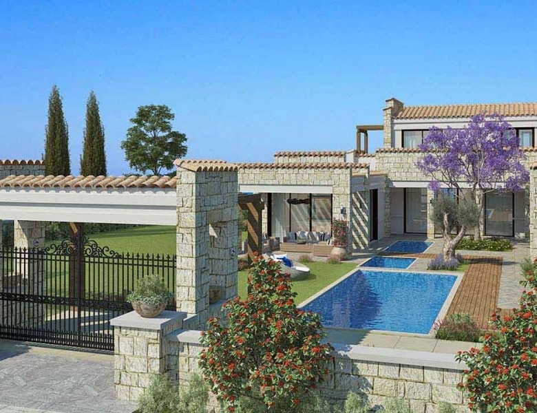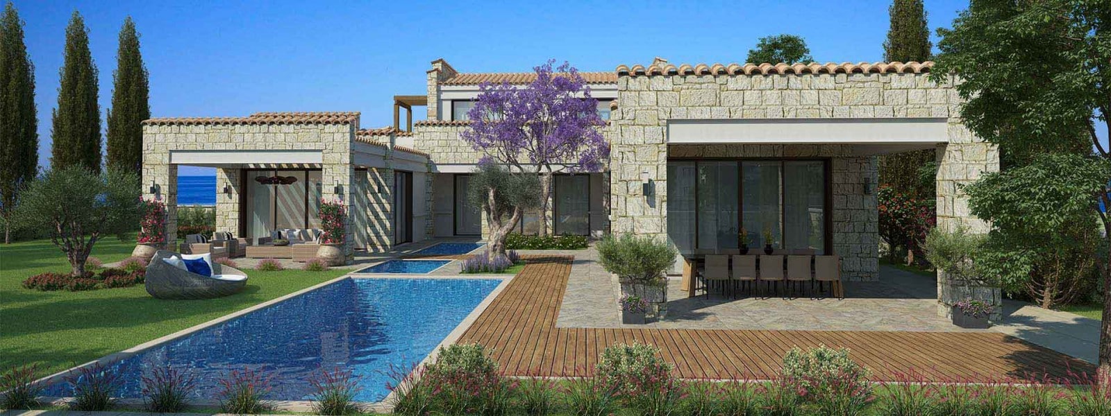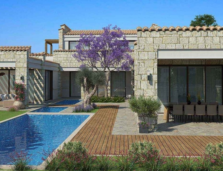 An exclusive 3-bedroom villa for sale located in a very well sought-after area just outside Paphos. The design of the villa has been inspired by a perfect fusion of contemporary and Mediterranean architecture, using traditional materials such as stone, clay roof tiles, and wood in clean lines and large open spaces. The villa is designed on a large plot and enjoys a private swimming pool, spacious interiors, and large terraces while having beautiful sea views of the Mediterranean.