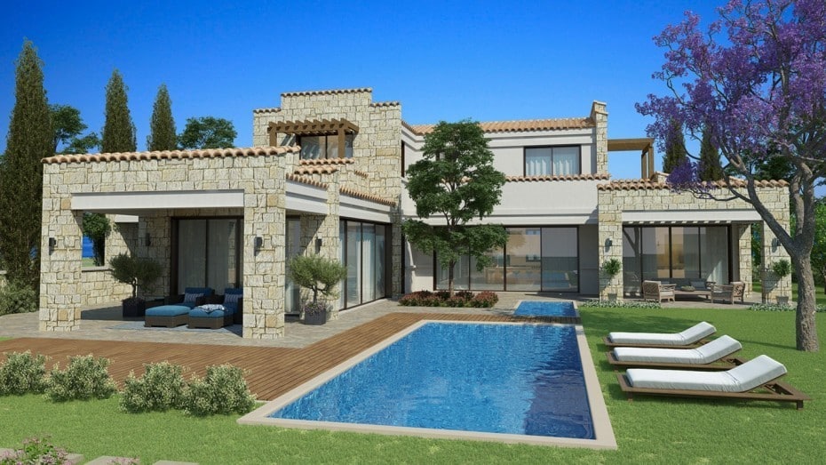 An exclusive 3-bedroom villa for sale located in a very well sought-after area just outside Paphos. The design of the villa has been inspired by a perfect fusion of contemporary and Mediterranean architecture, using traditional materials such as stone, clay roof tiles, and wood in clean lines and large open spaces. The villa is designed on a large plot and enjoys a private swimming pool, spacious interiors, and large terraces while having beautiful sea views of the Mediterranean.