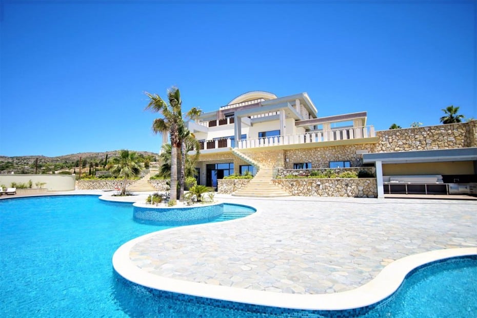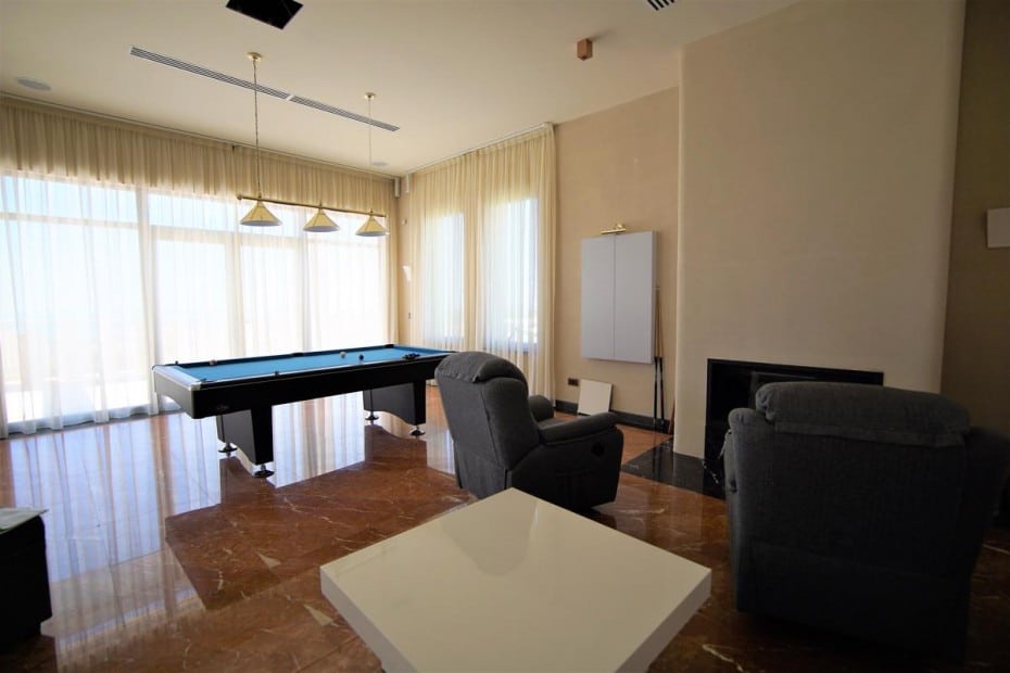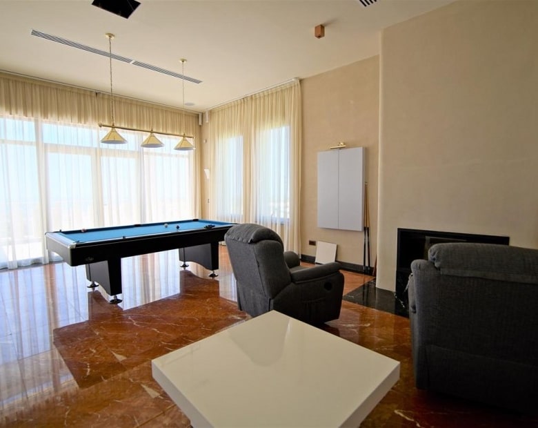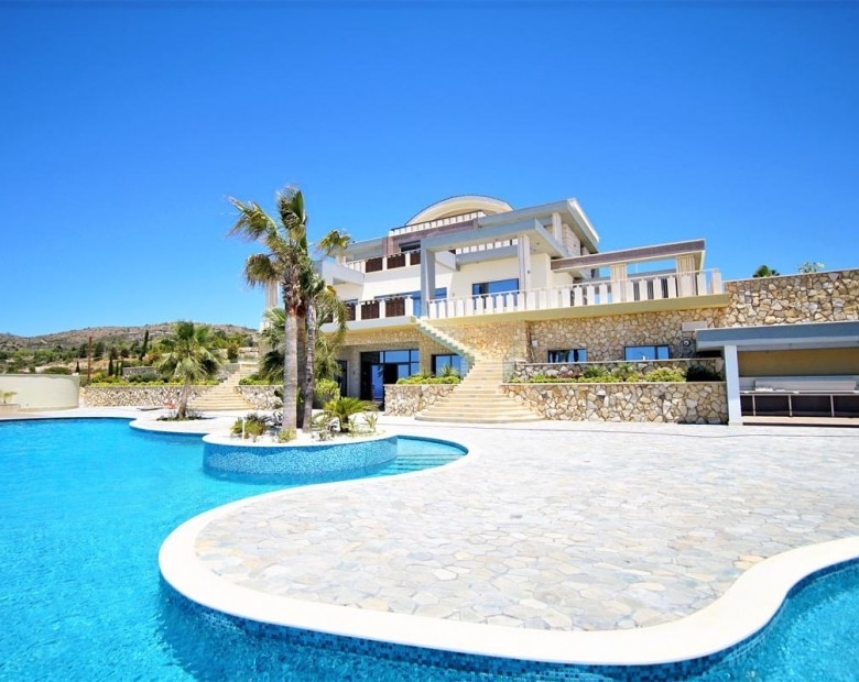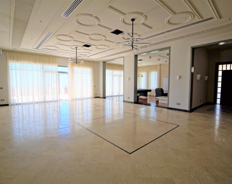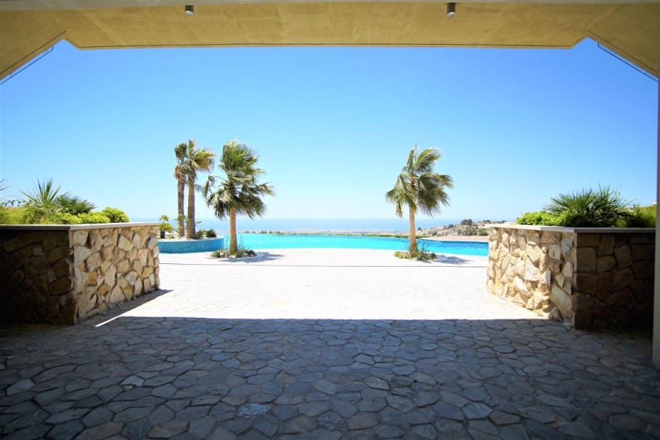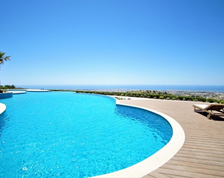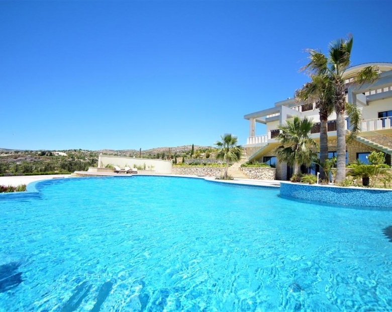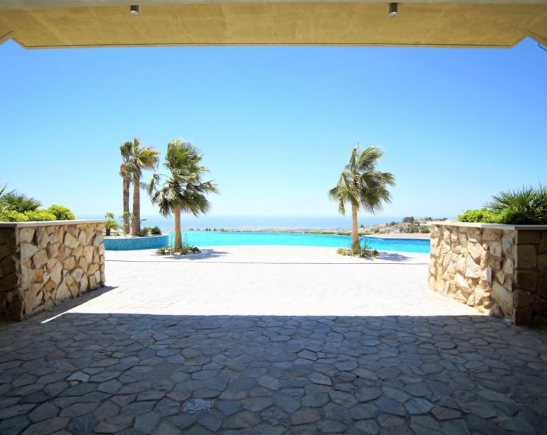 Luxury villa with a fantastic panorama of the sea and the city is located in the mountainous part of the suburbs of Paphos, only 5 5-minute drive to the International School of Paphos. Exceptional property with 260-degree views of the coastline of Paphos. Property consist of 8 bedrooms, cinema room, games room spa area with sauna, shower and lounge and massage room, gym, Billiard – mantel, wine cellar, 2 kitchens, Pati Hall with bar (100 m.sq.), Solarium with Jacuzzi, Garage on 3 a/m, parking zones for 20 a/m, rotunda in the walking area, solar collectors. Pool 560 litres (30m X 15m) with salt water, overflow, and massage beds.