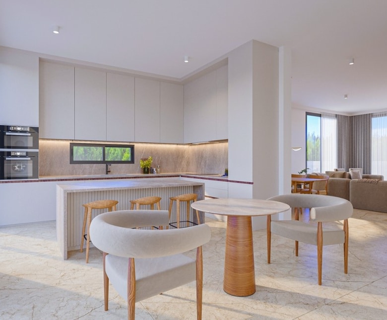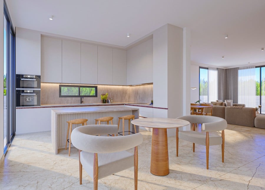 Located in a residential area just 500 meters from the International School of Pafos, these three-bedroom, three bathroom villas are perfect for permanent living. Situated within the designated Pafos Educational Area, there are seven schools within a four-minute drive, and Pafos General Hospital is only three minutes away. The project features 14 exceptionally spacious and stunning villas, each elegantly designed. All villas offer the added benefit of a spacious roof terrace equipped with a roof bar, perfect for enjoying the Cypriot outdoor lifestyle and maximizing the surrounding views. The price includes an alarm system, security cameras, an intercom, and a 3kW photovoltaic system, with provisions for an electric car charger. Also the project provides the option for added swimming pool.
