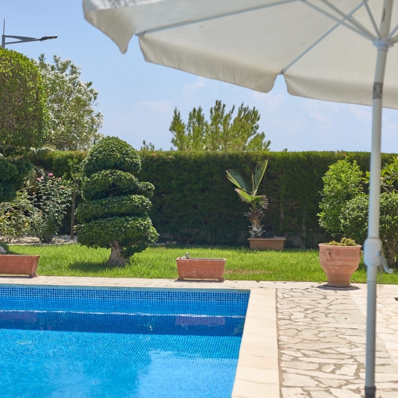finished landscape design of the site, with unique plant and citrus trees. An olive tree is growing on the plot which is about 100 years old. The garden is equipped with an automatic irrigation system.