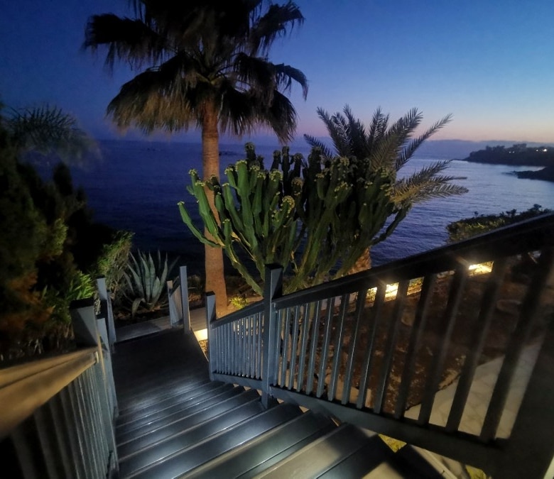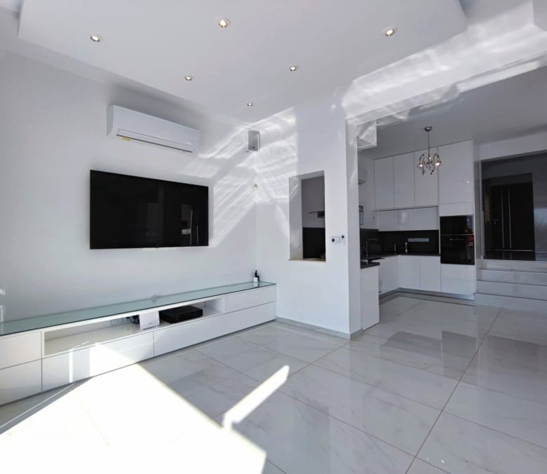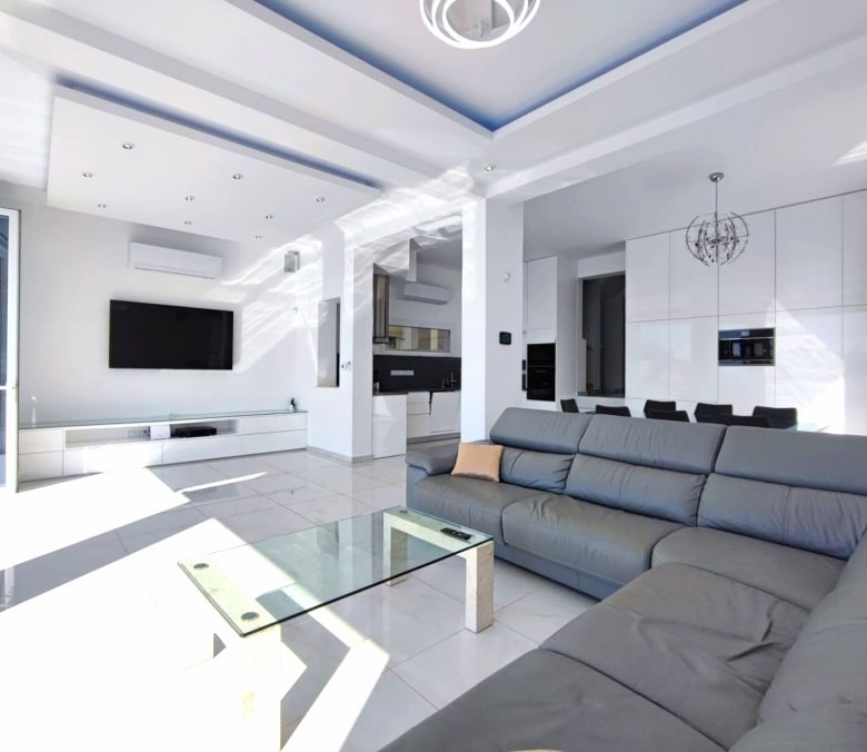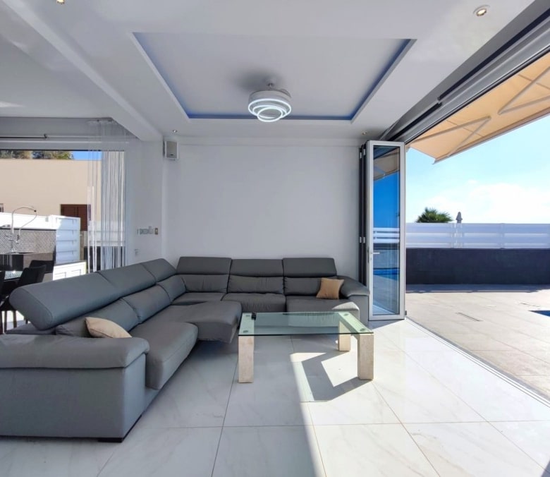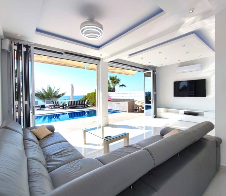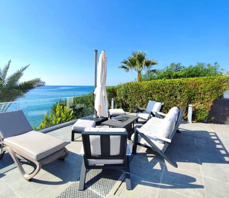 The villa offers a premium location with front-line access to the beach. Outdoor amenities include a private swimming pool, spacious verandas, and sun terraces, enhancing the experience of the Mediterranean setting. The open plan living room and kitchen contribute to the spacious and modern design of the house. Sliding doors open onto a large covered veranda, providing a seamless indoor-outdoor living experience. The top floor features bedrooms, including a master bedroom with an attached bathroom, and a massive terrace offering panoramic views.