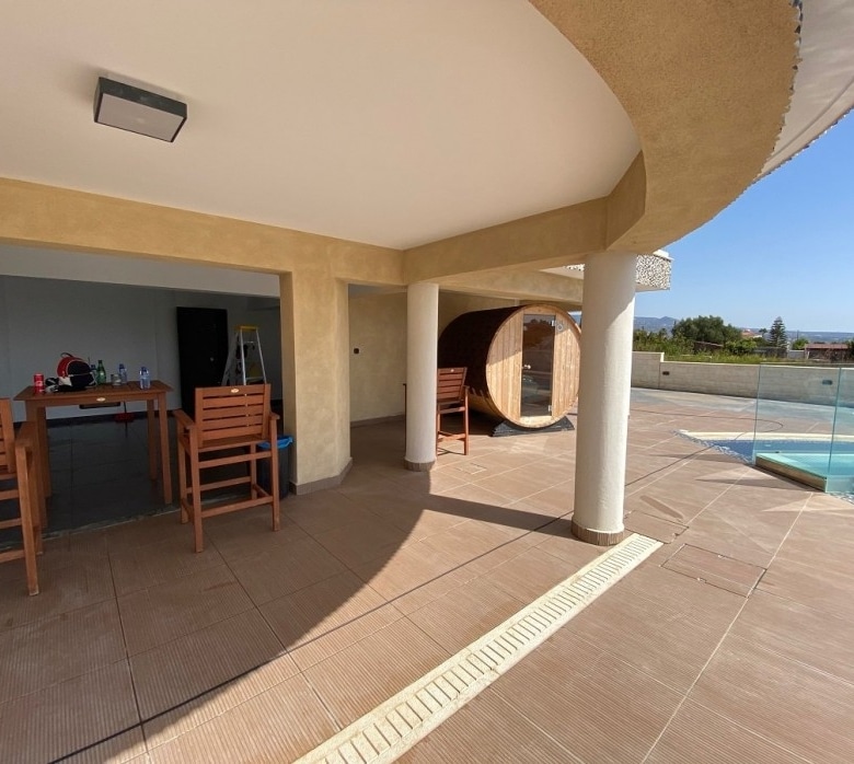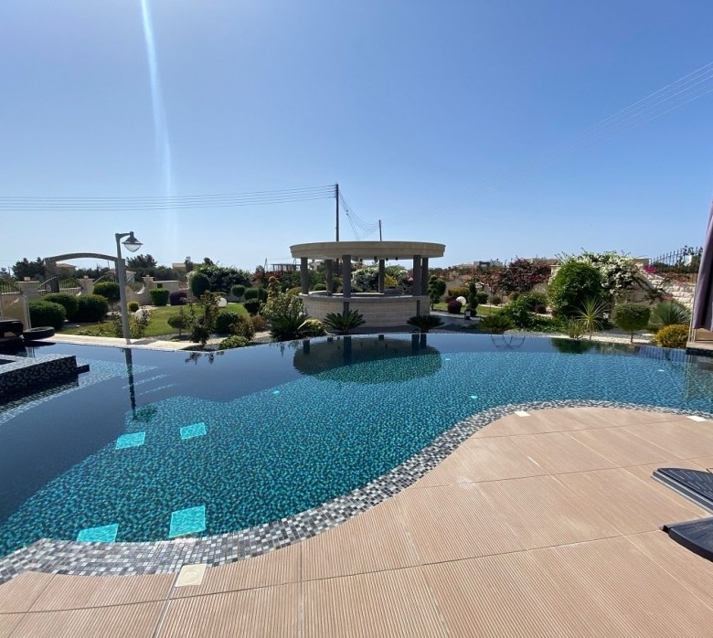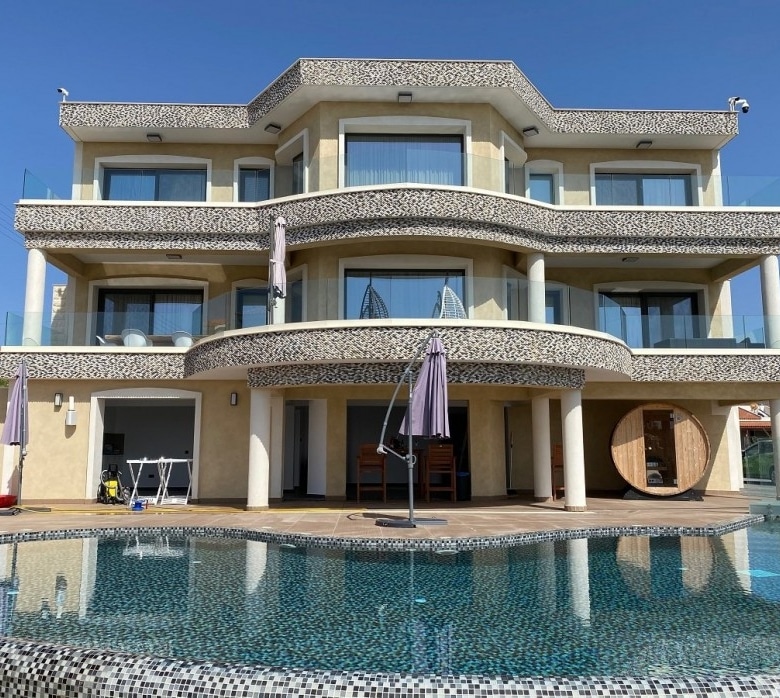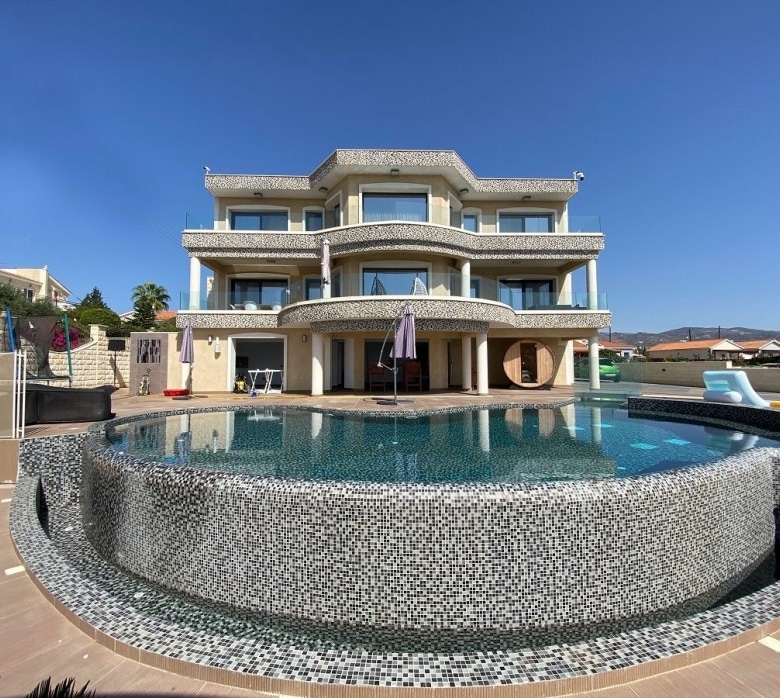 A Modern Luxury Three Bedroom Villa with Unobstructed Sea Views in the prestigious area of Sea Caves of Paphos. A lovely spacious detached three-bedroom detached house for sale located in a beautiful area of sea caves, located on a large plot. The house has its own swimming pool, surrounded by landscaped gardens, terraces, and recreation areas. There is a spacious open-plan living and dining area with an equipped kitchen. Cutting Edge smart home control everything in the house through your phone.