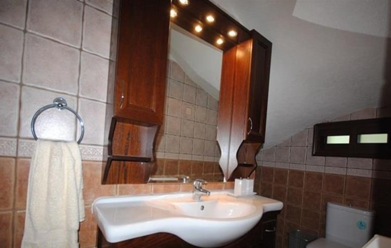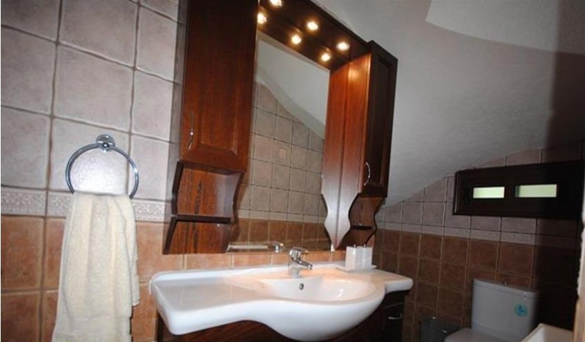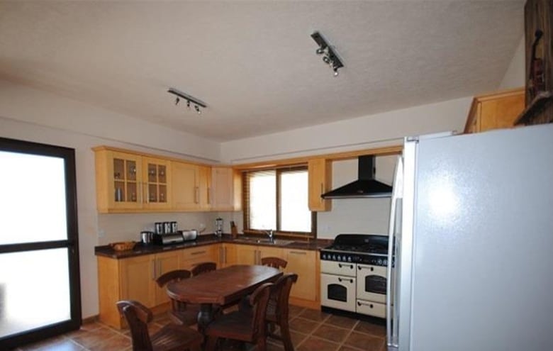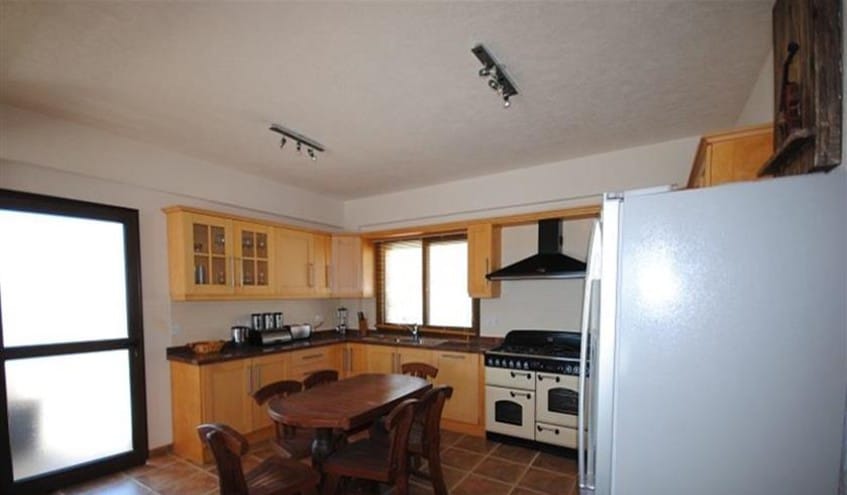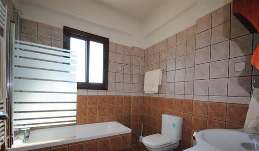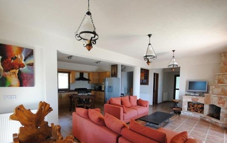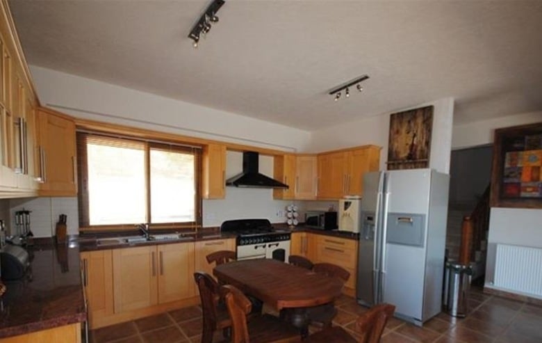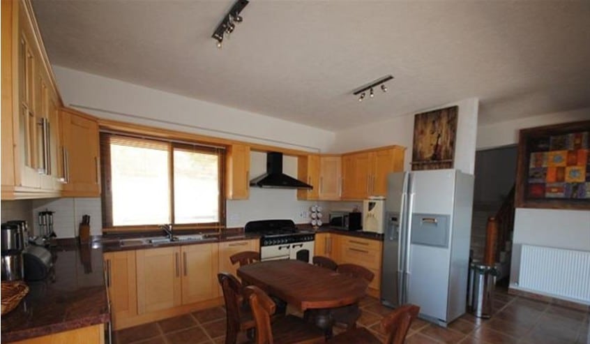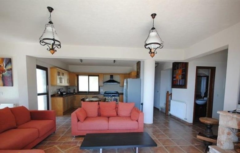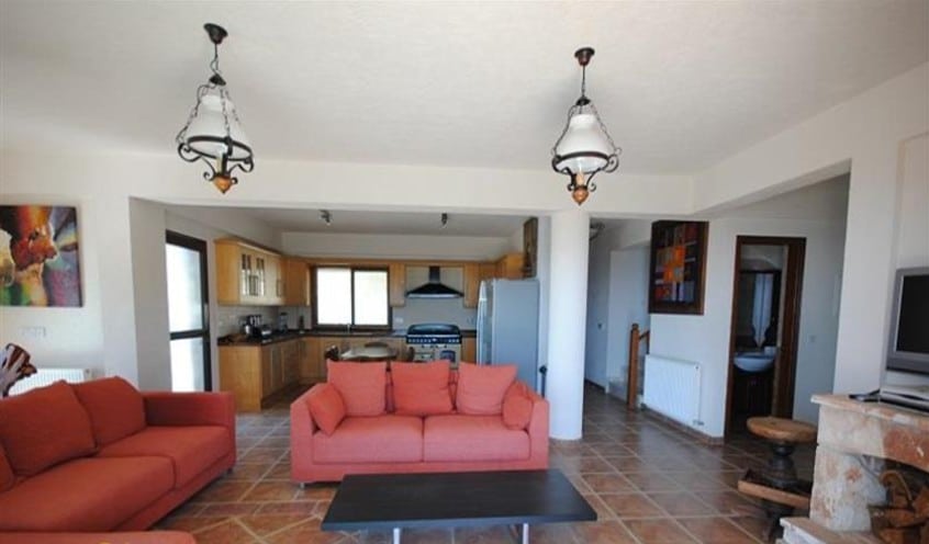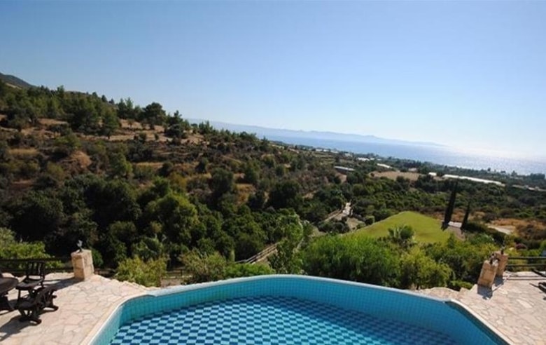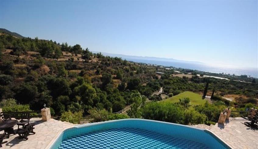 A unique county residence located high above Ayia Marina, a small but friendly village on the outskirts of Polis with picture perfect views over Paphos pine forest to the Chrysochous Bay. This stone built house has 3 bedrooms all ensuite and is on a plot of 7,900 sqm. There is an Infinity swimming pool with the most amazing views, stone buildings suitable for riding stables, etc and provision for two tennis courts. As you drive through the electric gateway to the massive driveway take a moment to fully appreciate the stunning location of this property, being next to the Paphos Pine Forest but having unique Panoramic views of the mountains and the sea beyond. The front door leads into the entrance hallway, and to the left are the guest toilets and downstairs bedroom. This is a spacious double bedroom with of patio doors leading out onto the pool area, built in wardrobes, a/c and ceiling fans and an ensuite bathroom. To the right of the front door is the is the open plan lounge / dining / kitchen area. Upstairs on the landing there is a kitchenette with sink, fridge and wine cooler and access to the remaining bedrooms and access to the veranda. The master bedroom has an ensuite bathroom with a corner Jacuzzi Bath. Patio doors lead out onto a large terrace of 48sqm where you can relax and watch the whole of the local countryside and the sea in the Chrysochou Bay. To complete the upstairs area is another double bedroom together with an ensuite bathroom. This bedroom has two balconies, one with views down to the sea and other towards the mountains. The plot is set over 2 areas – the upper area where the house is has an 12 x 5 m infinity pool and maintenance gardens, car port, large covered outside kitchen, bar and BBQ area, as well as a Utility room for storage and washing machines. Below the house is a large grassed area which can easily accommodate two tennis courts, and below this at the bottom of the property, is an area presently designed as stables for horses. These stables are stone built and on a large separate plot. these stables could easily be converted into art studios etc or used as a separate office area. There is a separate entrance to this area, through double iron gates.