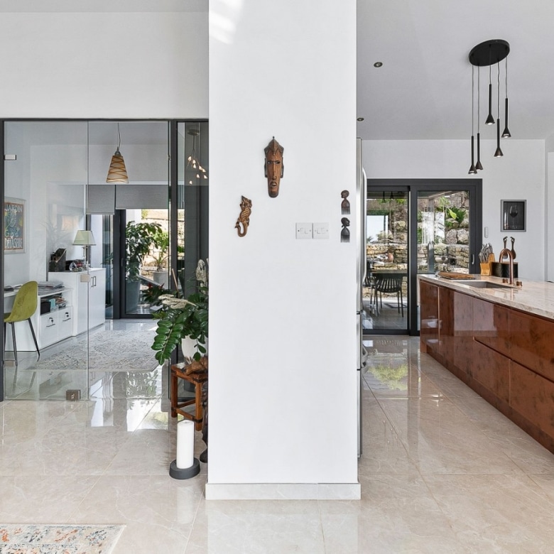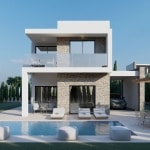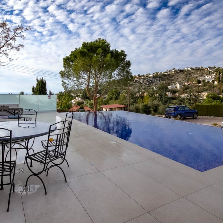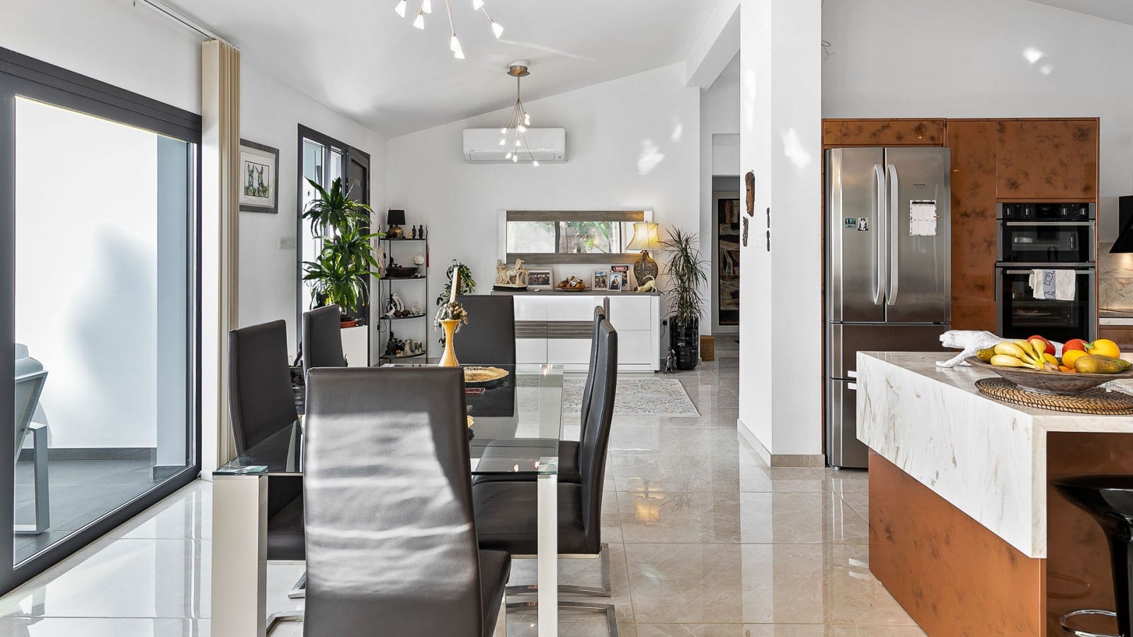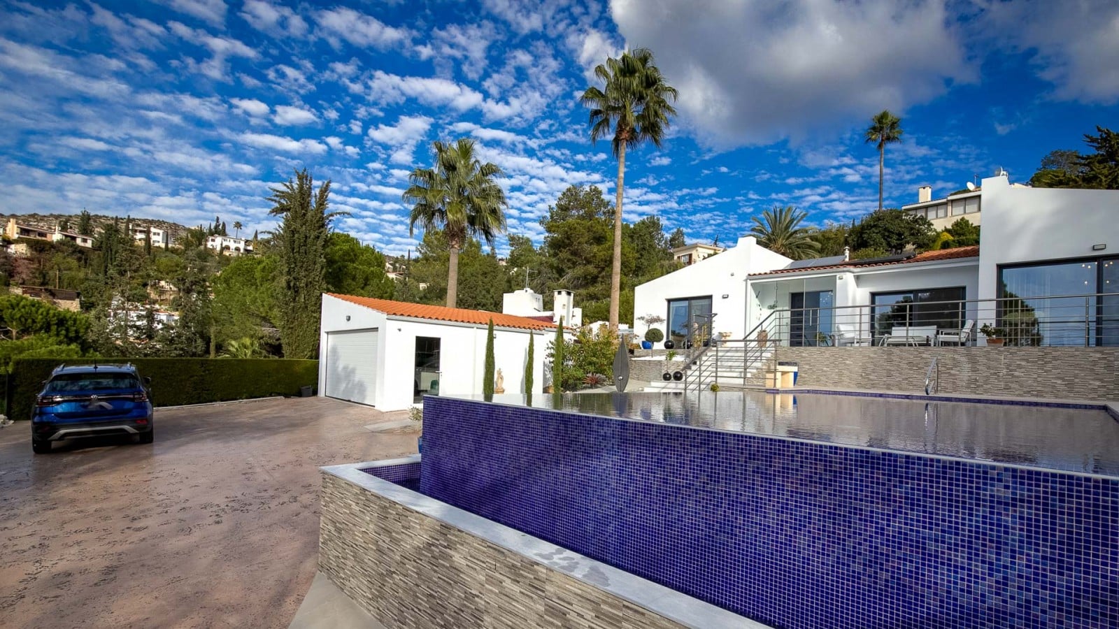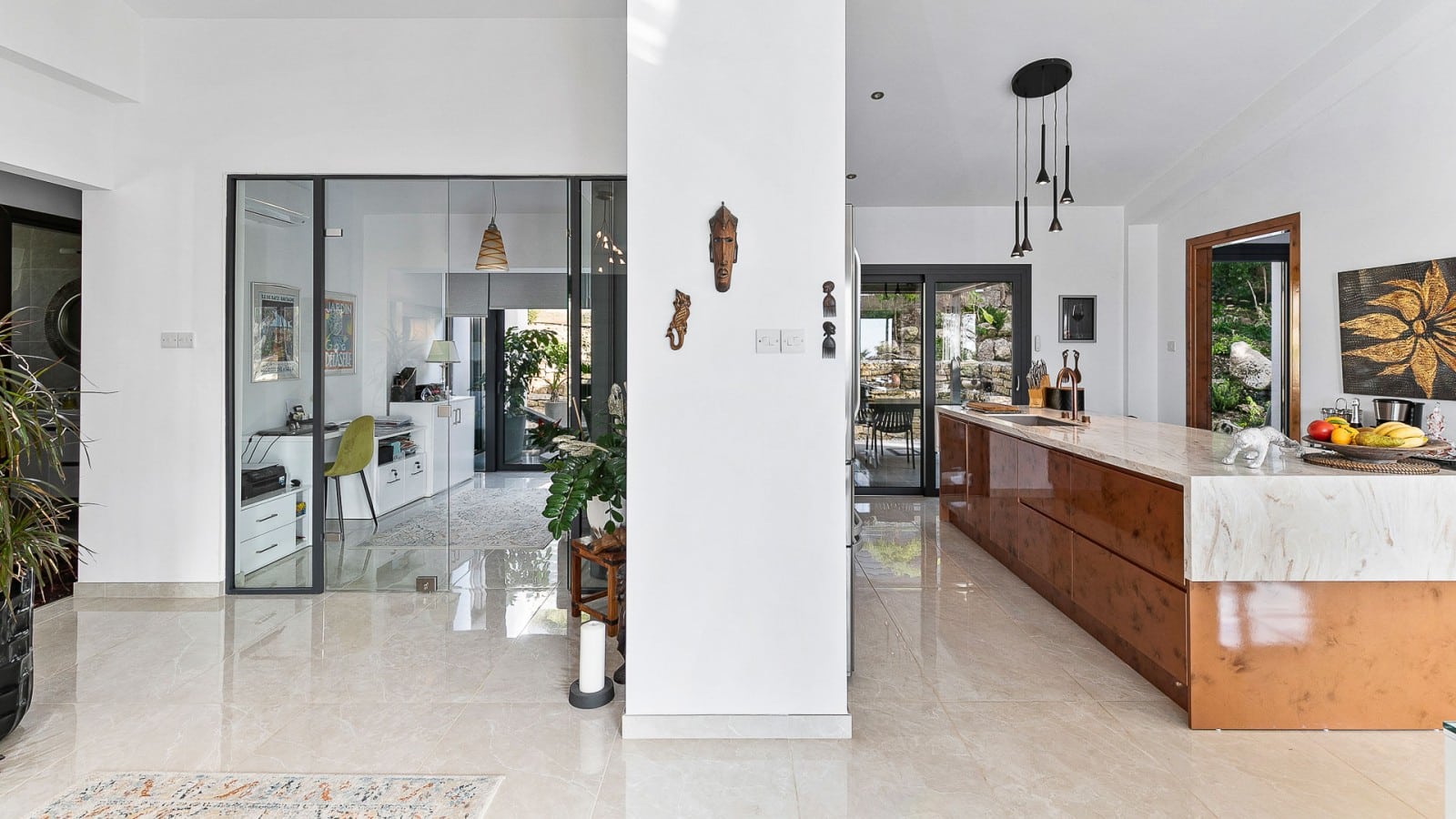 Situated in the prestigious Kamares Village in Tala, Paphos, this property epitomizes luxury, innovation, and impeccable design. Crafted by semi-retired developers with decades of expertise, no detail has been overlooked in the construction and styling of this residence. The property sits gracefully on an expansive plot, offering impressive curb appeal. A sweeping driveway leads to a double garage, while the elevated position of the home provides privacy and panoramic views. Adjacent to the driveway is the mosaic-tiled, heated, infinity, saltwater pool, designed and installed by one of Cyprus’ premier pool specialists just two years ago. The pool terrace offers breathtaking vistas over a lush, tree-lined valley to the shimmering Mediterranean Sea. Upon entering the home, you are welcomed by a light-filled glass hallway that transitions seamlessly into the spacious entrance area. The triple-aspect living room is a sanctuary of style and comfort, featuring expansive patio doors with state-of-the-art insulation technology to maintain year-round temperature control. For cooler evenings, a chic wood-burning stove adds warmth and ambiance. The adjacent dining area flows effortlessly into the state-of-the-art kitchen, a true chef’s dream. A stunning cappuccino marble island takes centre stage, complimented on one side by bespoke high-gloss cabinetry and fitted with premium appliances. A large utility room ensures that functionality matches the aesthetic appeal, offering abundant storage, great workspace and appliances washing, tumble dryer and dishwasher. The home’s thoughtful layout includes a third bedroom or office space, designed with a glass feature wall that allows natural light to cascade through the home. This space is ideal for remote work or creative pursuits. The two main bedrooms are equally impressive, each offering its own unique appeal. The master bedroom enjoys direct access to the front terrace and is serviced by a beautifully appointed luxurious shower room. The second bedroom opens onto the back garden and benefits from the use of the family bathroom with freestanding bath and handpicked tiles. Both bedrooms boast high ceilings, fitted wardrobes, and meticulous attention to design details.