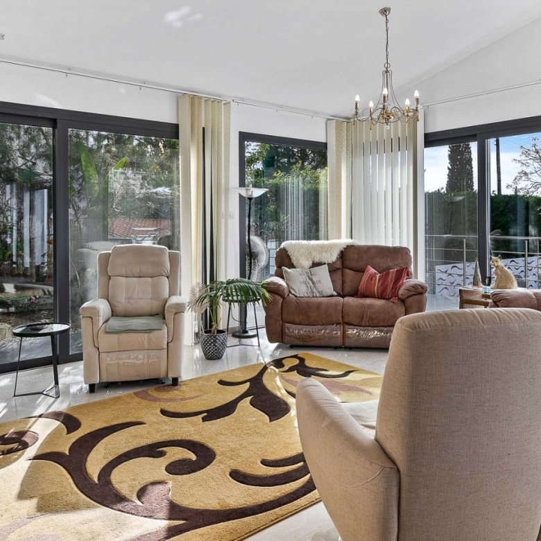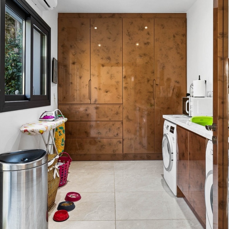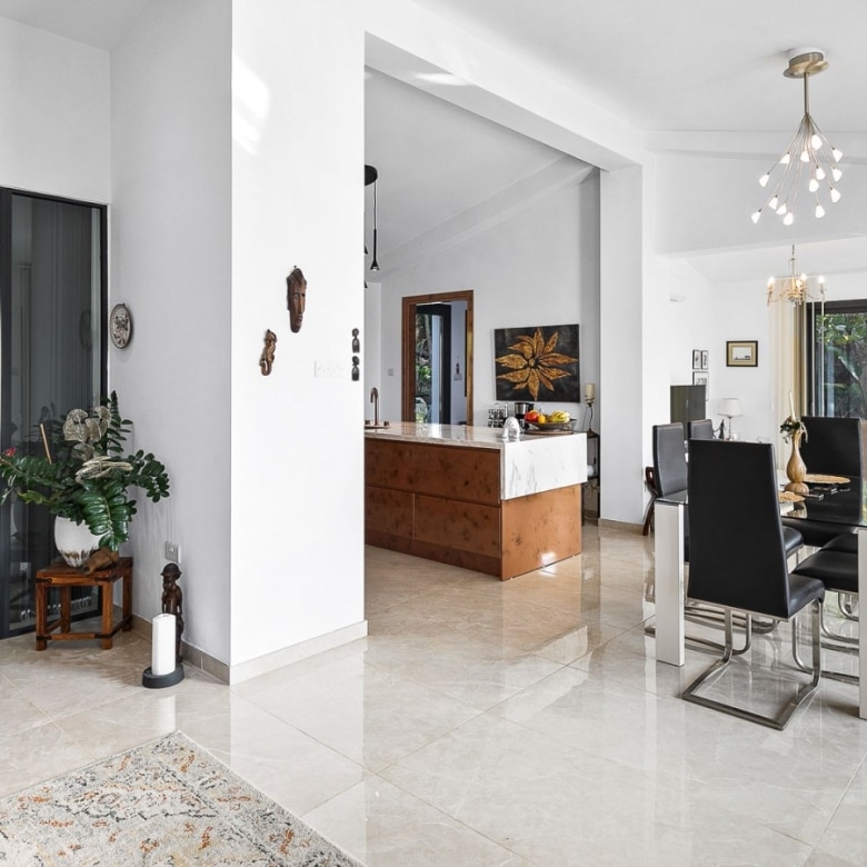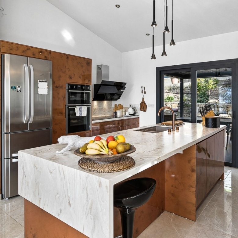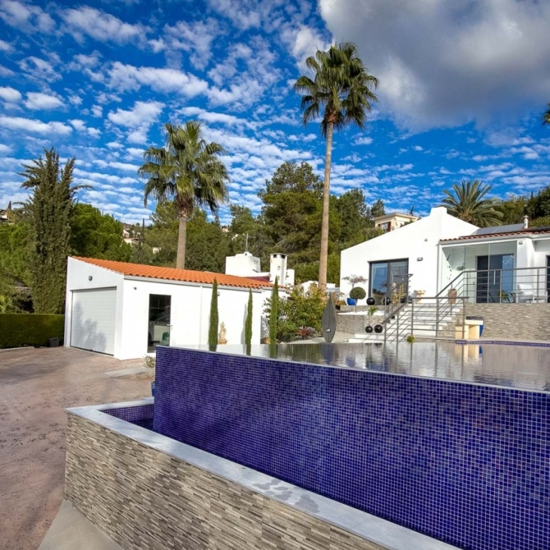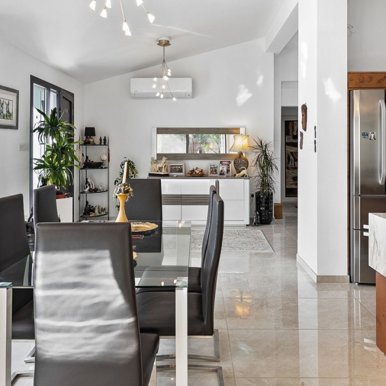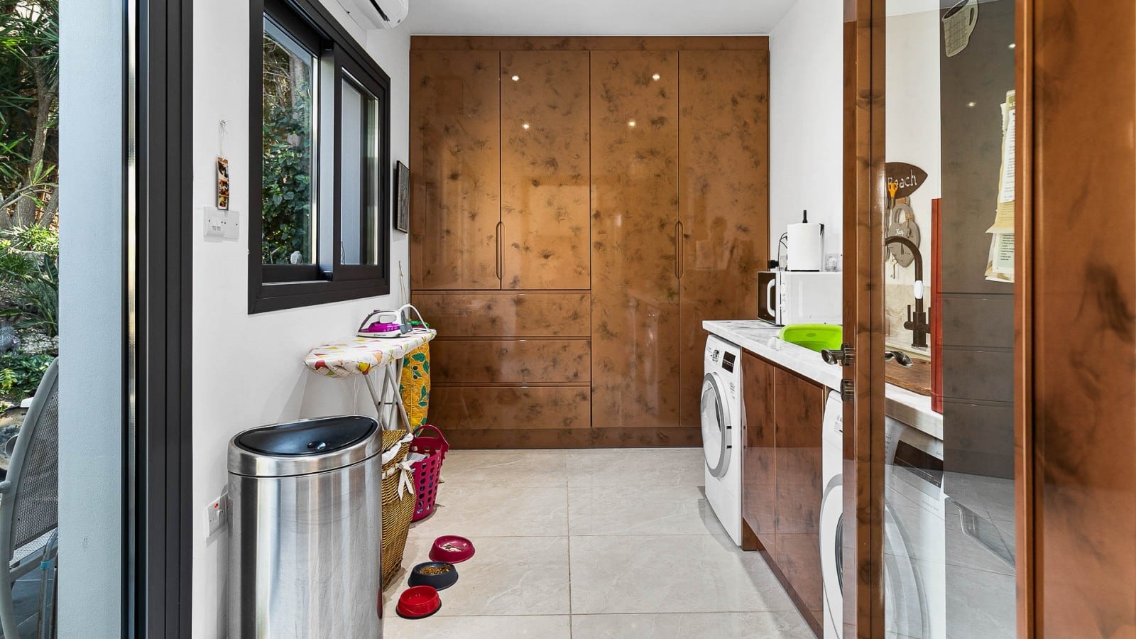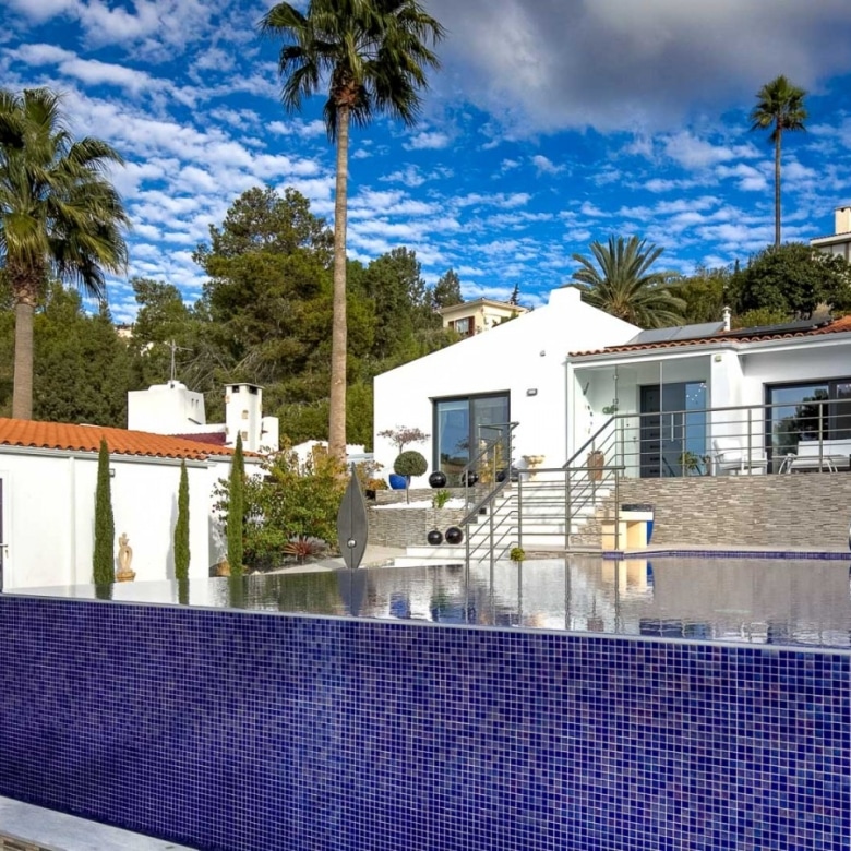 Situated in the prestigious Kamares Village in Tala, Paphos, this property epitomizes luxury, innovation, and impeccable design. Crafted by semi-retired developers with decades of expertise, no detail has been overlooked in the construction and styling of this residence. The property sits gracefully on an expansive plot, offering impressive curb appeal. A sweeping driveway leads to a double garage, while the elevated position of the home provides privacy and panoramic views. Adjacent to the driveway is the mosaic-tiled, heated, infinity, saltwater pool, designed and installed by one of Cyprus’ premier pool specialists just two years ago. The pool terrace offers breathtaking vistas over a lush, tree-lined valley to the shimmering Mediterranean Sea. Upon entering the home, you are welcomed by a light-filled glass hallway that transitions seamlessly into the spacious entrance area. The triple-aspect living room is a sanctuary of style and comfort, featuring expansive patio doors with state-of-the-art insulation technology to maintain year-round temperature control. For cooler evenings, a chic wood-burning stove adds warmth and ambiance. The adjacent dining area flows effortlessly into the state-of-the-art kitchen, a true chef’s dream. A stunning cappuccino marble island takes centre stage, complimented on one side by bespoke high-gloss cabinetry and fitted with premium appliances. A large utility room ensures that functionality matches the aesthetic appeal, offering abundant storage, great workspace and appliances washing, tumble dryer and dishwasher. The home’s thoughtful layout includes a third bedroom or office space, designed with a glass feature wall that allows natural light to cascade through the home. This space is ideal for remote work or creative pursuits. The two main bedrooms are equally impressive, each offering its own unique appeal. The master bedroom enjoys direct access to the front terrace and is serviced by a beautifully appointed luxurious shower room. The second bedroom opens onto the back garden and benefits from the use of the family bathroom with freestanding bath and handpicked tiles. Both bedrooms boast high ceilings, fitted wardrobes, and meticulous attention to design details.