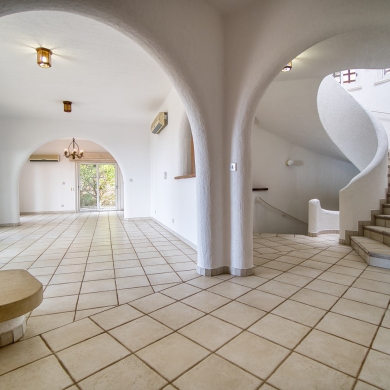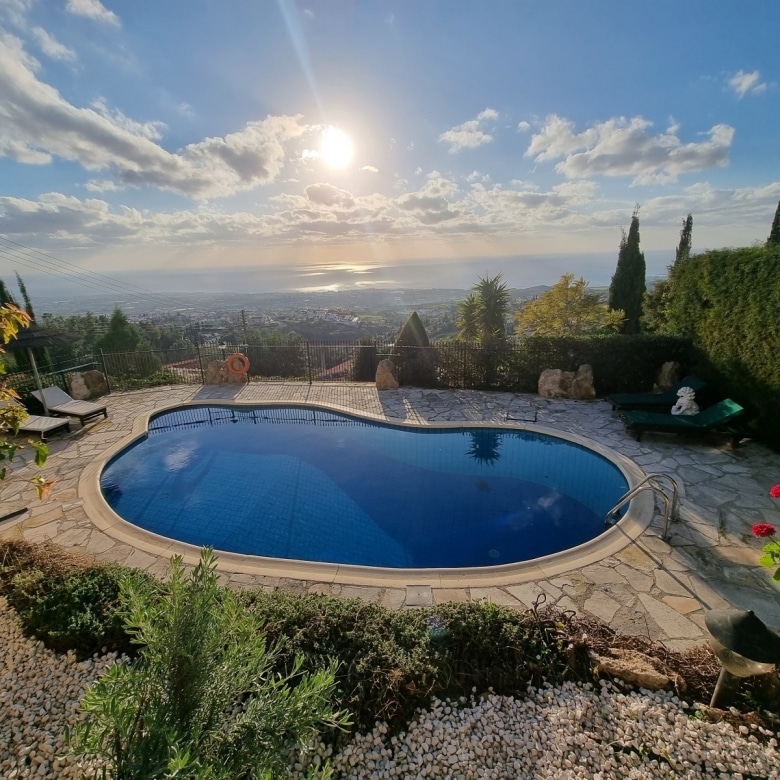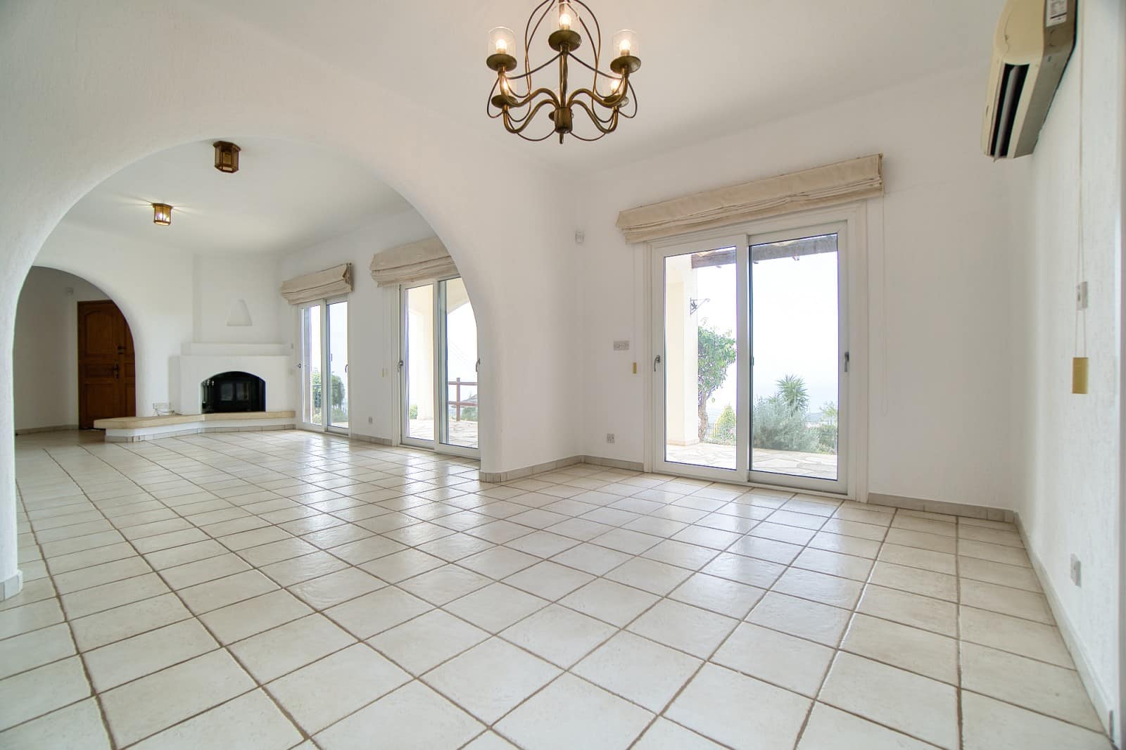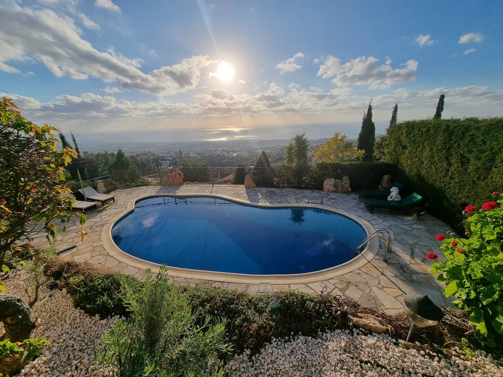 This enormous villa boasts majestic 180 degrees of the whole Paphos Coastline with incredible Mediterranean blue seas and breathtaking sunsets. Just walking distance from the Kamares Club House which offers all facilities – social club, concierge reception, restaurant, bar, events hall, swimming pool and medical centre. The quaintly pedestrianised Tala village square offers more entertainment, restaurants, pharmacy, supermarket and pubs which are only a short drive away. Located on the best road in Kamares – Kamares Avenue – the house is accessed by a private drive with turning circle for guests. Guests can enter through a private gate that takes them up a level to the pool area. Up another level is the front entrance and covered entertaining area. The lucky residents will enjoy a double electronic garage to safely protect their vehicles and they will use another internal staircase which was expertly crafted to look like a curved sea shell. The garage also offers a large storage area. The whole house is full of traditional arches in the classic Leptos style and is a masterpiece of the craftsmanship that propelled them to be one of the most successful developers in Cyprus. The architects designed every detail of the house to take advantage of the incredible views which can be enjoyed from every room with complete privacy! On the main level of the house there is a large open plan lounge with working fireplace to keep you warm and cozy. Central underfloor heating can be enjoyed during cold winter nights. Split level air conditioning units can change temperatures room by room to your comfort level. The open plan dining area leads out to a custom built BBQ designed by an Argentine expert. This connects to the large kitchen with a breakfast bar which is ideal for entertaining or large families. On the main level there is also a guest WC which is large enough to turn into another shower. Here there are 3 bedrooms. One was a music room, another an office and the 3rd was a guest room which has a large ensuite. The options are endless for a library, play area or gym. With all this space to play with, let your imagination run free and you can have everything that your heart desires. Upstairs on the top floor there are two further large bedrooms all with fitted cupboards and ensuites. Each bedroom also has a large uncovered balcony with fantastic panoramic sea views as a bonus. The house has a fully mature, irrigated garden with fruit and lemon trees for you to enjoy fresh lemons all year round! Please note that this house has been built on a DOUBLE plot and therefore the house is large and the grounds are extensive