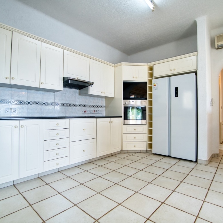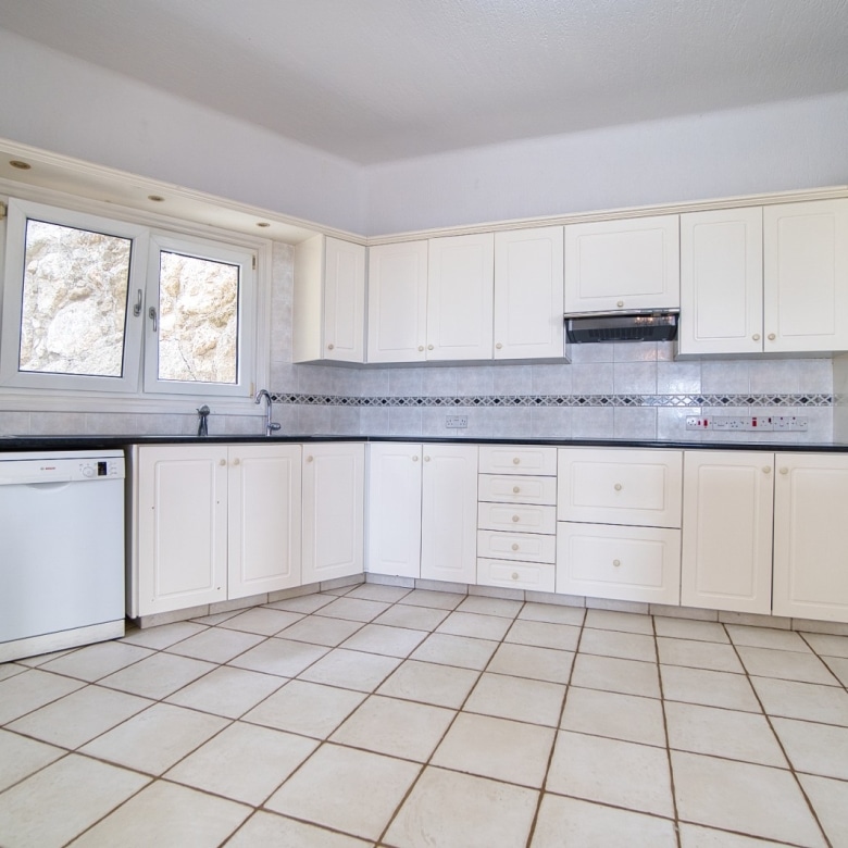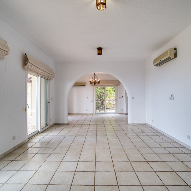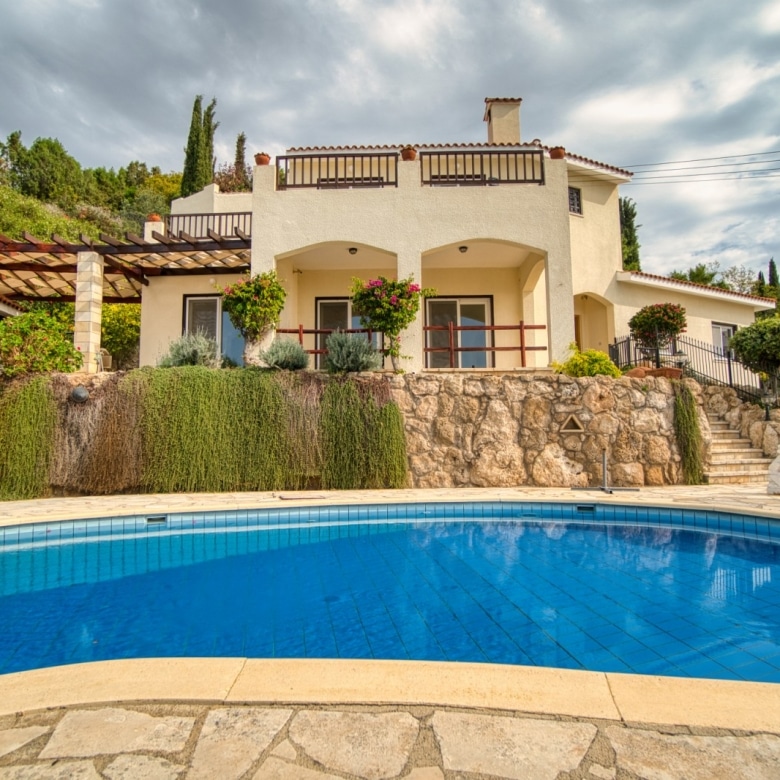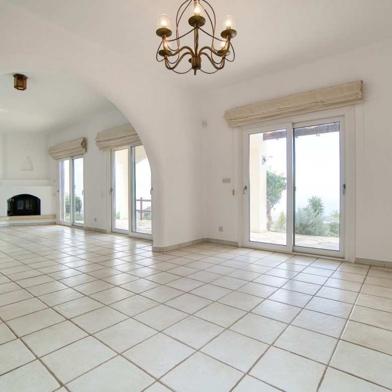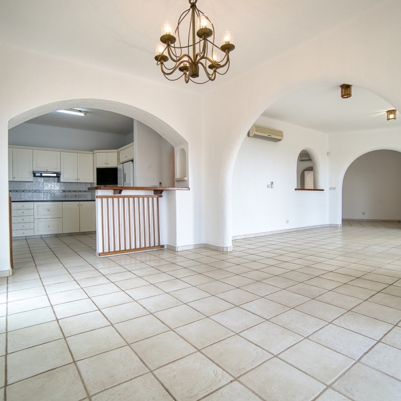 This enormous villa boasts majestic 180 degrees of the whole Paphos Coastline with incredible Mediterranean blue seas and breathtaking sunsets. Just walking distance from the Kamares Club House which offers all facilities – social club, concierge reception, restaurant, bar, events hall, swimming pool and medical centre. The quaintly pedestrianised Tala village square offers more entertainment, restaurants, pharmacy, supermarket and pubs which are only a short drive away. Located on the best road in Kamares – Kamares Avenue – the house is accessed by a private drive with turning circle for guests. Guests can enter through a private gate that takes them up a level to the pool area. Up another level is the front entrance and covered entertaining area. The lucky residents will enjoy a double electronic garage to safely protect their vehicles and they will use another internal staircase which was expertly crafted to look like a curved sea shell. The garage also offers a large storage area. The whole house is full of traditional arches in the classic Leptos style and is a masterpiece of the craftsmanship that propelled them to be one of the most successful developers in Cyprus. The architects designed every detail of the house to take advantage of the incredible views which can be enjoyed from every room with complete privacy! On the main level of the house there is a large open plan lounge with working fireplace to keep you warm and cozy. Central underfloor heating can be enjoyed during cold winter nights. Split level air conditioning units can change temperatures room by room to your comfort level. The open plan dining area leads out to a custom built BBQ designed by an Argentine expert. This connects to the large kitchen with a breakfast bar which is ideal for entertaining or large families. On the main level there is also a guest WC which is large enough to turn into another shower. Here there are 3 bedrooms. One was a music room, another an office and the 3rd was a guest room which has a large ensuite. The options are endless for a library, play area or gym. With all this space to play with, let your imagination run free and you can have everything that your heart desires. Upstairs on the top floor there are two further large bedrooms all with fitted cupboards and ensuites. Each bedroom also has a large uncovered balcony with fantastic panoramic sea views as a bonus. The house has a fully mature, irrigated garden with fruit and lemon trees for you to enjoy fresh lemons all year round! Please note that this house has been built on a DOUBLE plot and therefore the house is large and the grounds are extensive