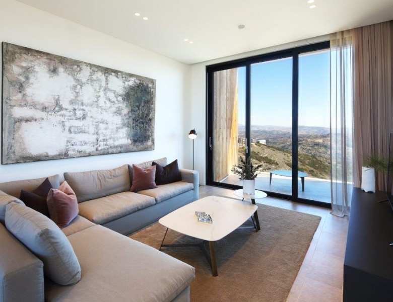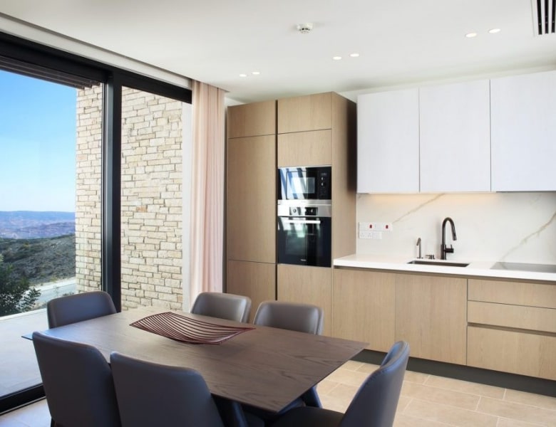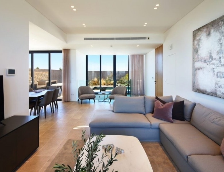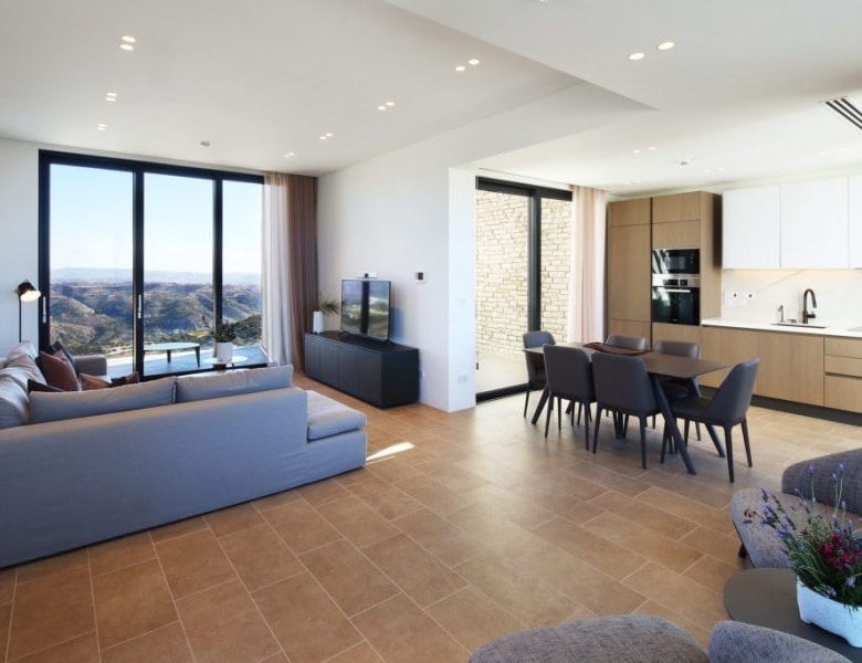 With a flowing open-plan three-bedroom layout, floor-to-ceiling windows and thoughtfully appointed courtyards, terraces and gardens – Aura provides the best of boundless living. The striking single pitched roof is typical of Cypriot vernacular, and the outdoor kitchen, stylish L-shaped seating area and plunge pool are designed for life al fresco. Open floor plans accommodate both entertaining and family life, with the perfect amount of privacy.