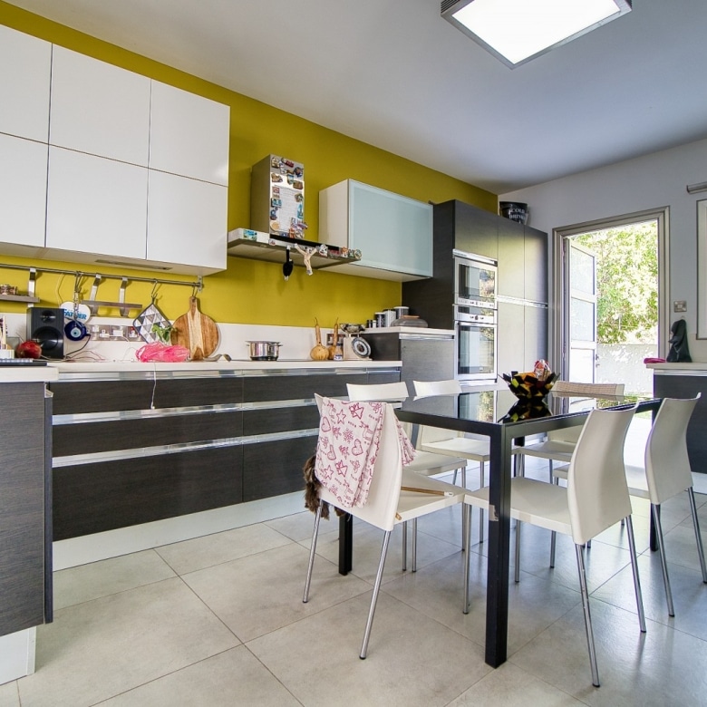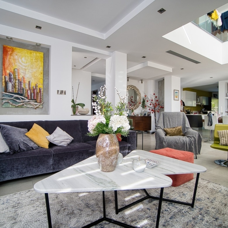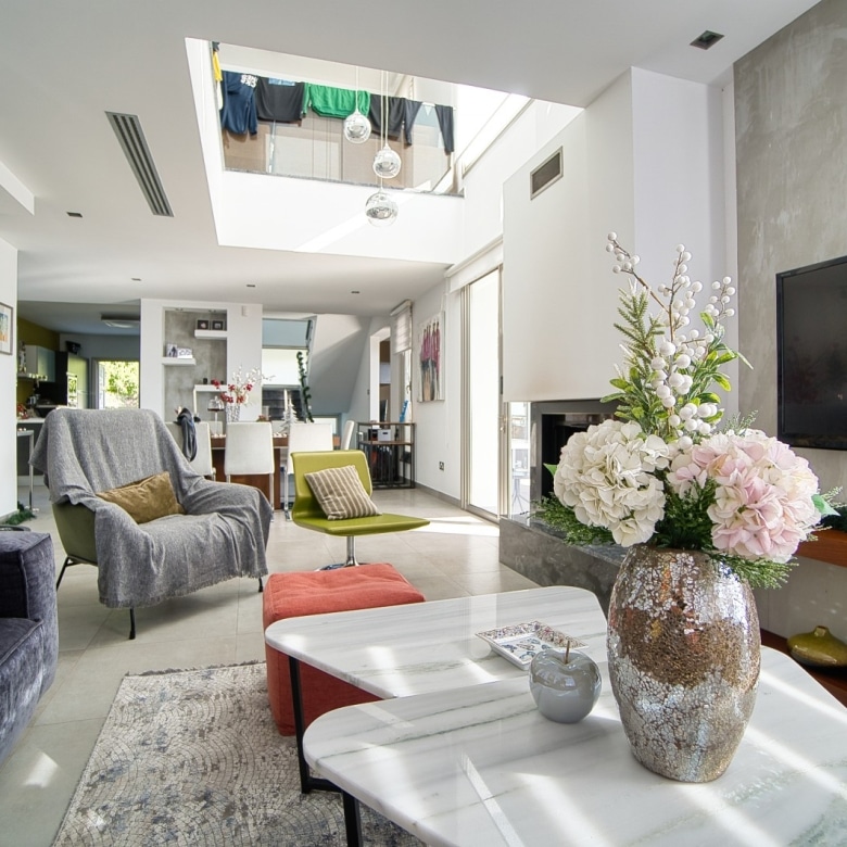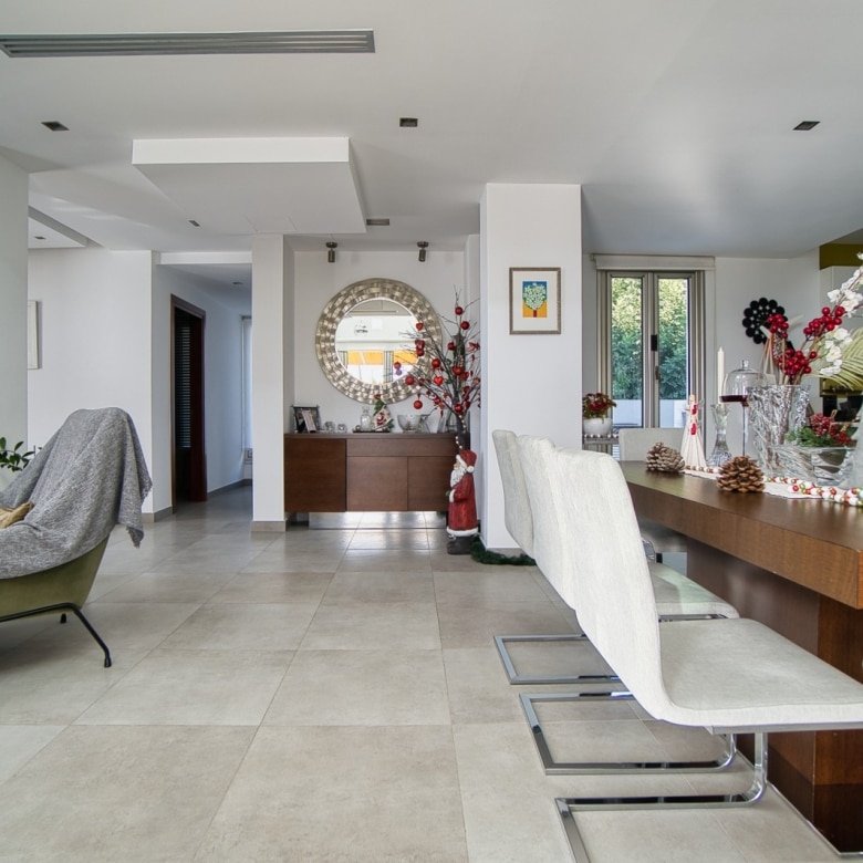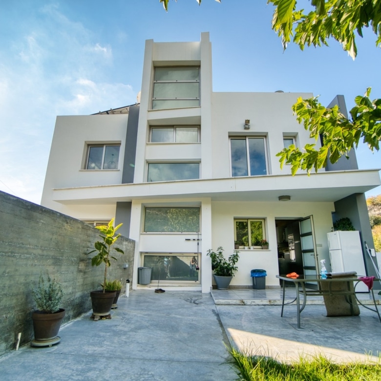 Modern design villa 248 sq.m (covered area) 315 sq. m. total premises area in Tsada, built in a plot of 1619 sq. m. It has stunning panoramic sea and mountain views. Located on the drive up to Tsada, set on a hillside (Olympus). The house is approximately 10 min. drive north of Paphos, 10 min. drive to Tsada Golf Club and 5 min drive to the International School. Its a 3 level property situated at the end of a private road, with a split driveway, one leading to the main entrance and the other to the lower basement area with two-car covered parking, which can be converted into a self-contained apartment. Entering (2nd level), the house has a spacious living/dining room and a second lounge (family room). On the same level there is a study room and a guest WC, plus a large covered balcony with amazing sea view and double access from the dining area and the living/family room. At the back of the house, outside the kitchen, there is a covered patio with al fresco dining and a large garden area and a built-in BBQ. Upstairs there are 3 double bedrooms, full family bathroom, en-suite bathroom in the master bedroom with a corner bath/jacuzzi and a feature cubical shower, walk-in wardrobe and access to another sea view balcony. On the same floor there is a laundry room. At the lower basement area behind the garage port and attached to the property, there is a service/maid or storage room with a WC. At the same level at the very rear of the house, there is a 200 sq.m. landscaped garden with grown up local trees/flowers. Features: Italian manufactured floors-granite worktops, full thermal insulation, underfloor gas central heating, water pressure system and water filter under kitchen cabinet, double glazing, fireplace, utility room, ac units, security system with alarm, photovoltaic system of 7.9 KW, bbq area at kitchen level, permission to construct a private swimming pool, borehole, irrigation system, title deeds. Furniture and electrical appliances are negotiable.