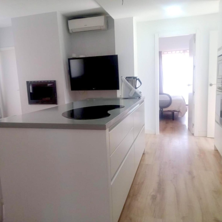 Open-concept living room and kitchen with a central island, bright and spacious.