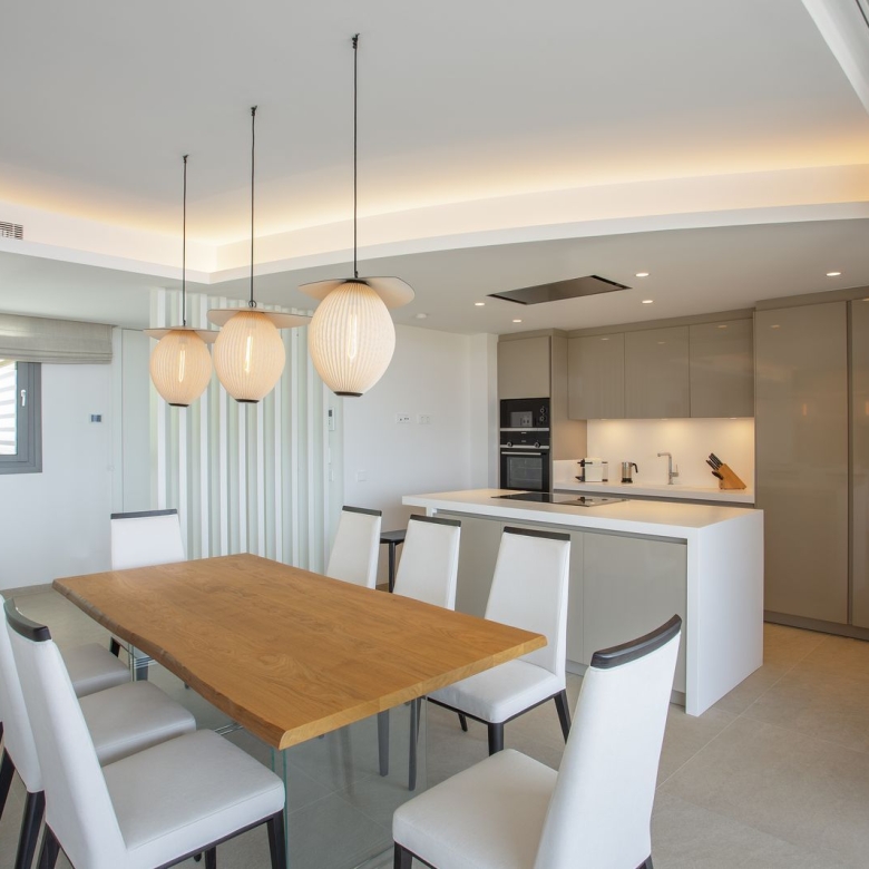 As you step into the living room, you are immediately struck by the grandeur of the space. The soaring ceilings, reaching an impressive height of 8-10 meters, create a sense of openness and airiness. Natural light floods the room from the huge windows that stretch from floor to ceiling, showcasing breathtaking panoramic views of the sea and the surrounding landscape. The living room seamlessly integrates with the terrace space, blurring the boundaries between indoor and outdoor living.
