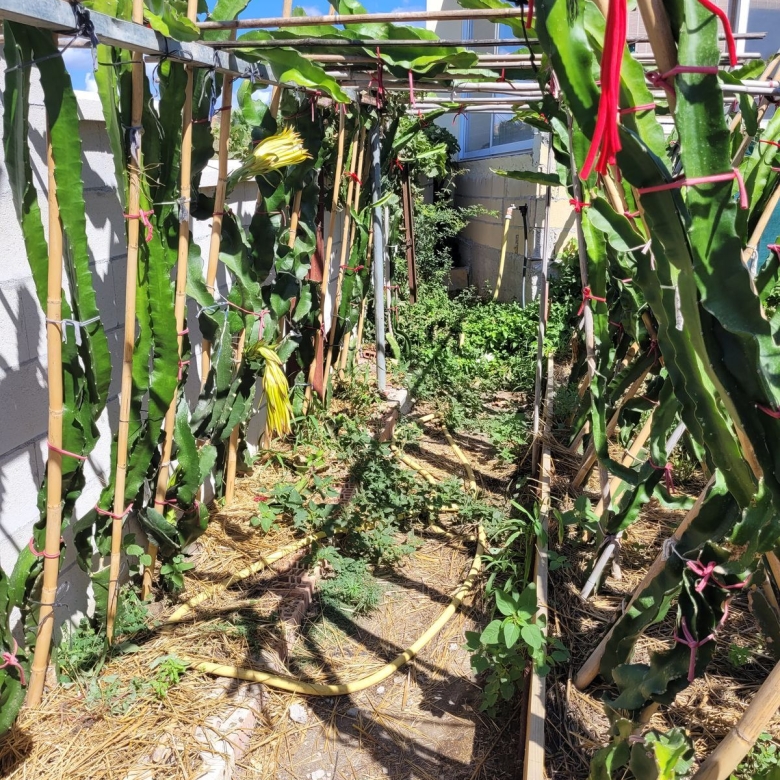 Parking area for three cars. Container and chicken coop. The orchard is about 200 square meters.