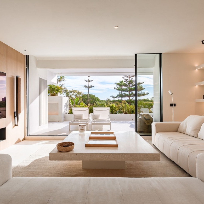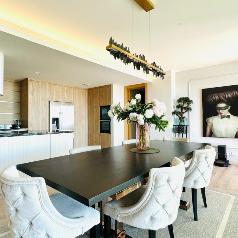 The villa is set in a prime location, offering convenience and access to world-class amenities, including renowned golf courses. The open-plan living room seamlessly connects with the dining area, creating an ideal space for both family gatherings and elegant entertaining. Large glass doors flood the interiors with natural light, enhancing the villa's bright, airy atmosphere.