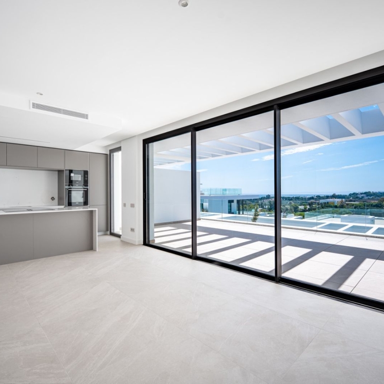 An open plan, fully equipped American kitchen and dining area with high wooden beamed ceilings and bifolding doors leading out to your private terrace for the perfect indoor/outdoor living experience that is so desired in Spain.