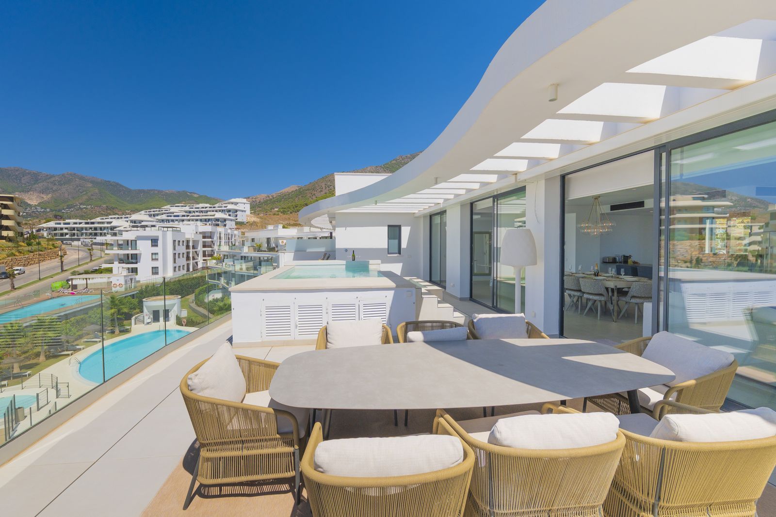 The villa’s exterior is equally impressive. The main covered terrace overlooks a heated swimming pool and beautifully manicured gardens. Adjacent to the pool is a fully equipped outdoor kitchen and BBQ area, perfect for relaxed alfresco dining. A chic, open-air pavilion provides the ideal setting for hosting stylish cocktail evenings or long summer lunches with friends and family.