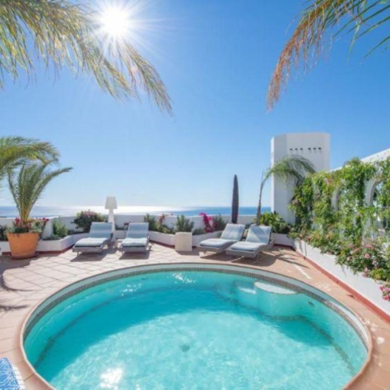 Wide-ranging windows effortlessly direct you towards the terraces and infinity pool surrounded by tropical trees and mature gardens. The Villa comes complete with 6 distinctive bedrooms; the elegant master suite compromises the entire first floor with large walk-in closets, an elegant marble bathroom with an rounded bathtub, an office room and access to the spacious private terrace offering beautiful sea views. Enjoy one of Marbellas most distinctive properties on the market, from its decked out rooftop terrace, complete spa and private gym, indoor pool, cinema room and its own putting green area. The villa includes an elevator, a garage fit for 2 cars and a carport fitting 2 further cars.