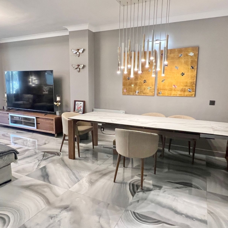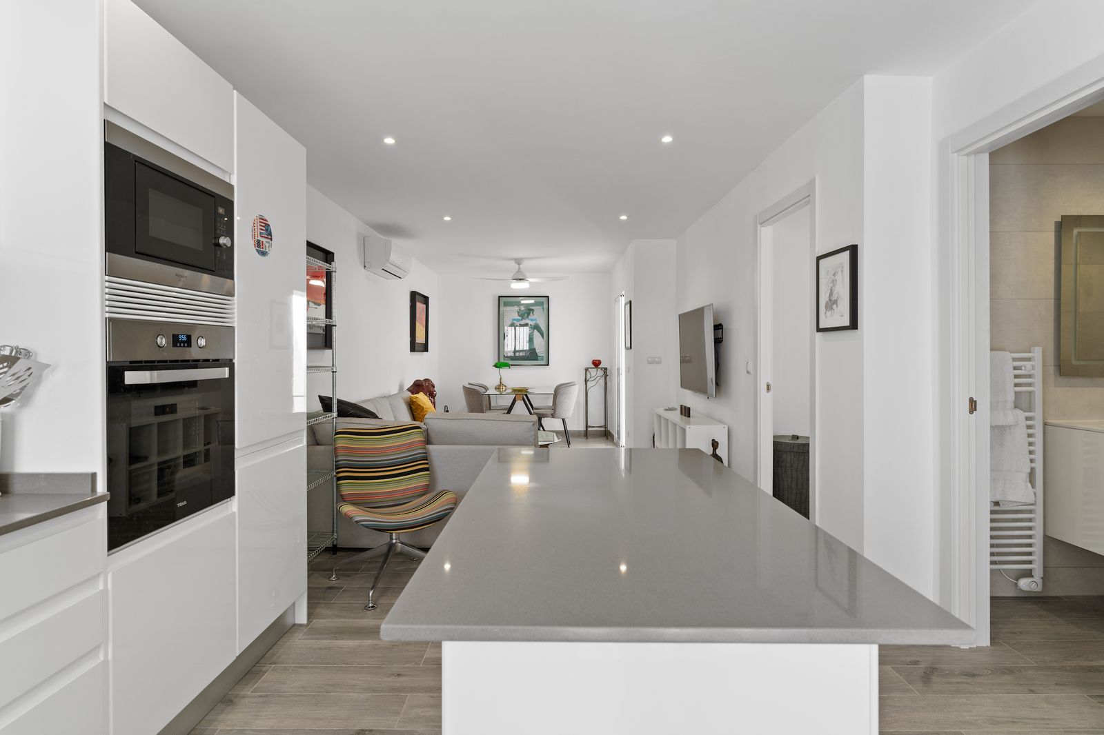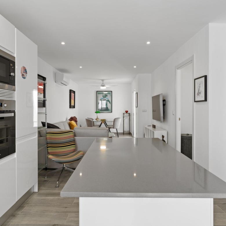 At the heart of the home is a beautifully tailored kitchen, marrying functionality with high-end design. The open-plan living and dining area is a masterclass in contemporary interior design, featuring curated furnishings, a soothing neutral palette, and warm wooden details. High ceilings and direct access to the terrace enhance the indoor-outdoor flow, infusing the space with natural light and an airy ambiance.