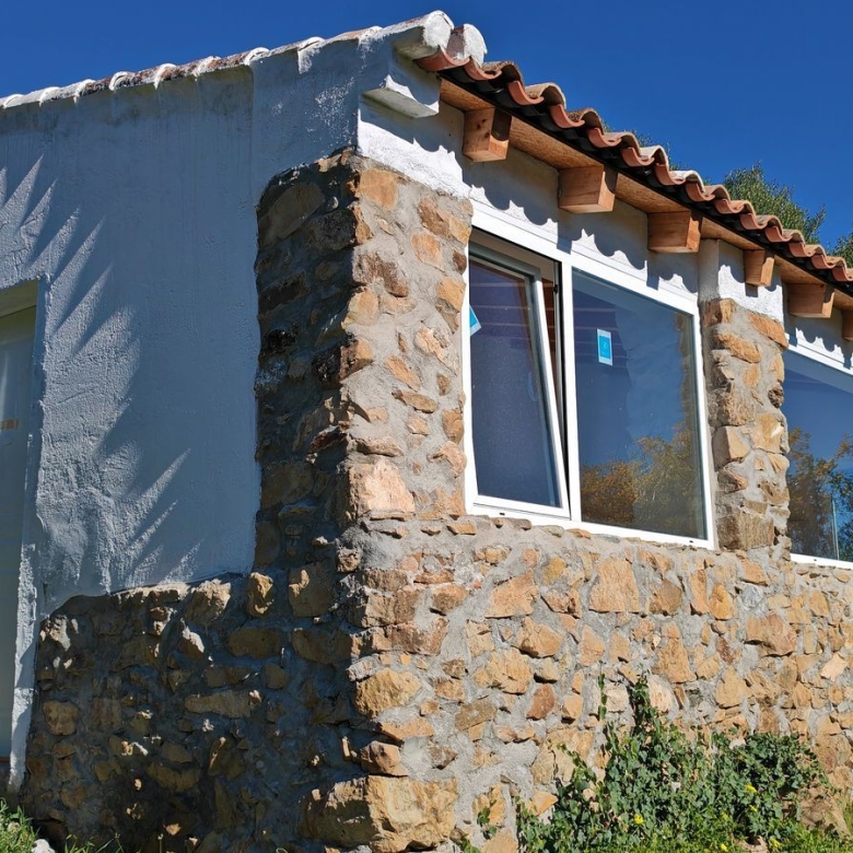One of these three additional buildings has already been completed and is ready for rental. The other two still need a bathroom and possibly a kitchenette/kitchen installed. The property is located in a natural setting with stunning views and borders a small river. An unpaved road winds from the main road across the 15,000m² plot to a spacious parking area.