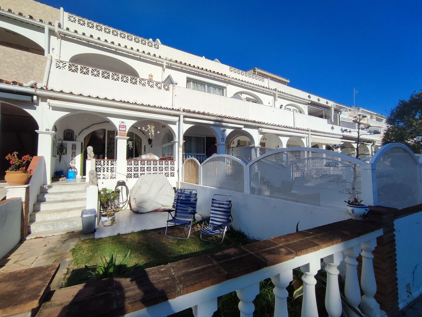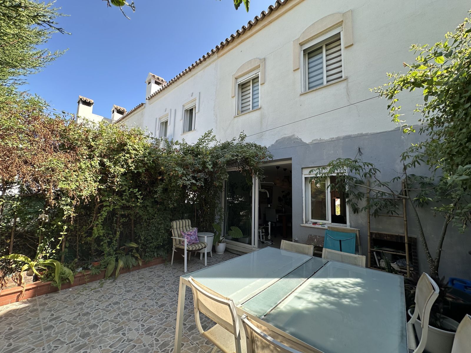Exterior: Large garden area with pool, porches, barbecue area, covered garage and parking area. There is also a tennis court.