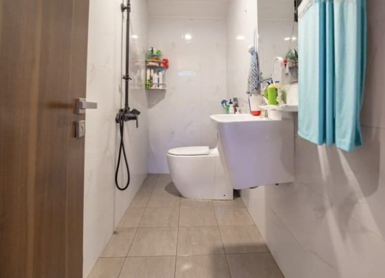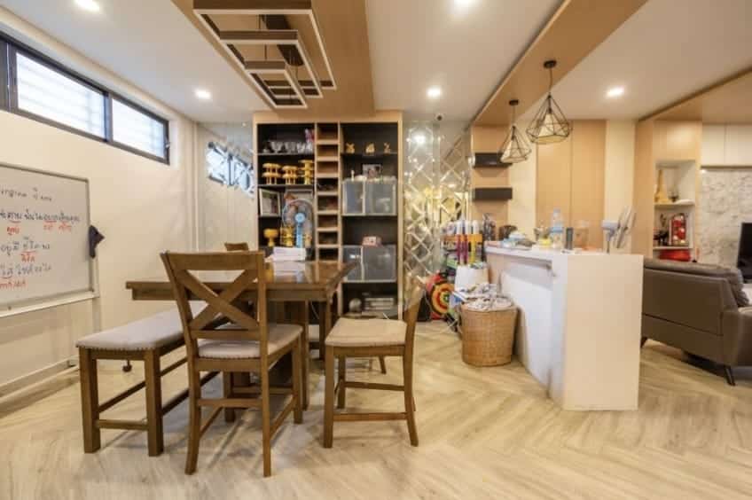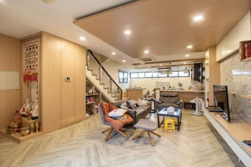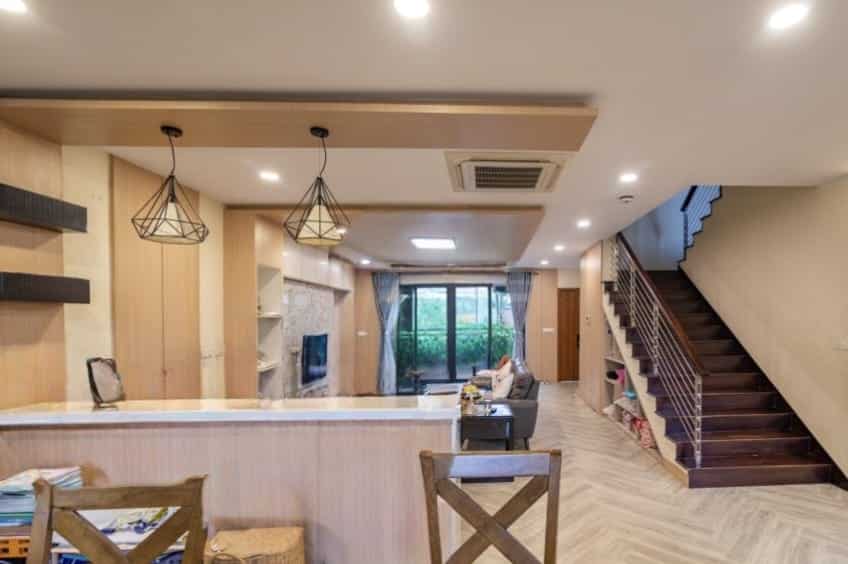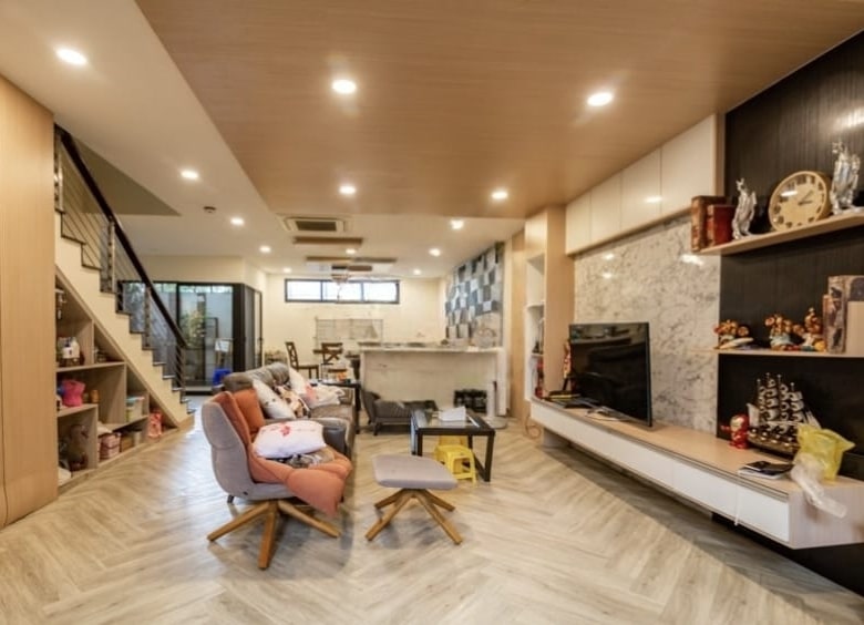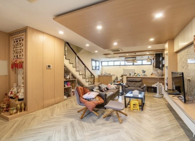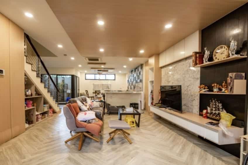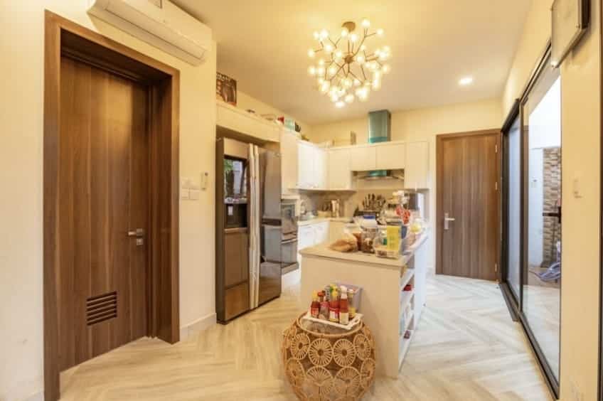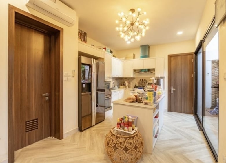 Inside, the villa welcomes you with a spacious receiving area fitted with centralized air conditioning, perfect for entertaining guests. The modern kitchen is thoughtfully designed with an island counter and has direct access to an atrium-style rear space—featuring potted greenery and a functional area for laundry. The kitchen comes fully equipped with a microwave, oven, cooker, range hood, sink, and pantry, all seamlessly built into the utility counter for convenience and efficiency.