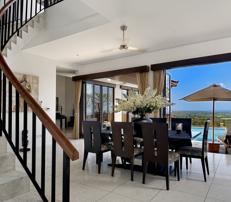 The villa faces north-west and consists of 4 spacious bedrooms with polished wooden floors along with a playroom with bunk beds. Two rooms can be found on the first floor, two rooms on the second floor and the fifth is located on the ground floor. The ensuite bathrooms are luxurious with double vanities. The master bedroom boasts a large Jacuzzi bath. The living room with its comfortable plush sofa also looks out to breathtaking views. The fully equipped kitchen is a delight to cook in with its large island. There is also staff quarters and parking for 2 cars. A beautiful feature of the villa is its curve stairway but the highlight of this property has got to be the 8 metre infinity pool. The villa comes fully furnished with exceptionally well-appointed designer furniture.