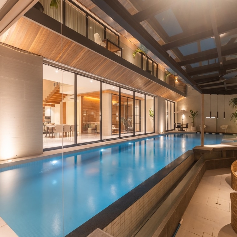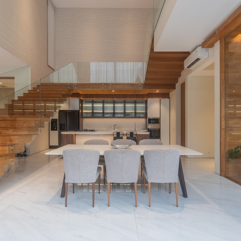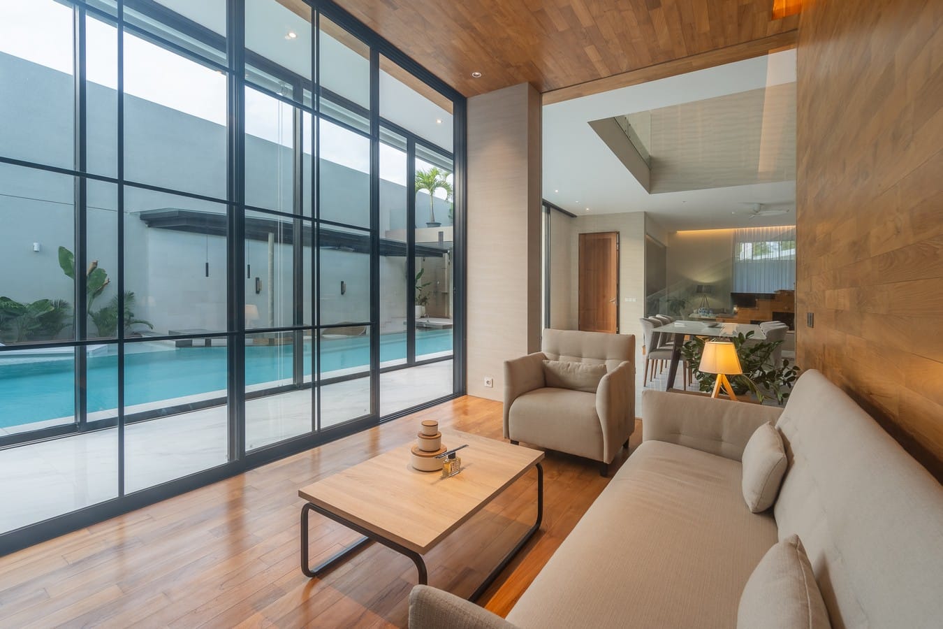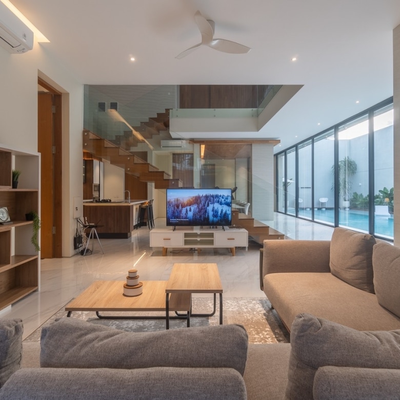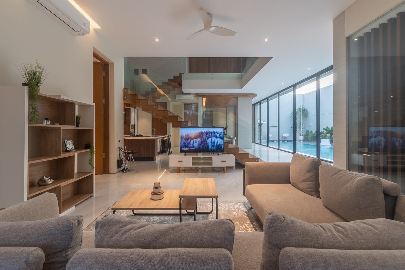 This two-level villa, spanning 477 square metres of land, boasts a contemporary design with high ceilings. It seamlessly integrates indoor and outdoor living, offering a total living space of 740 square metres. Ample natural light illuminates the interior, and natural materials, such as stone and wood, enhance the space’s aesthetic appeal.