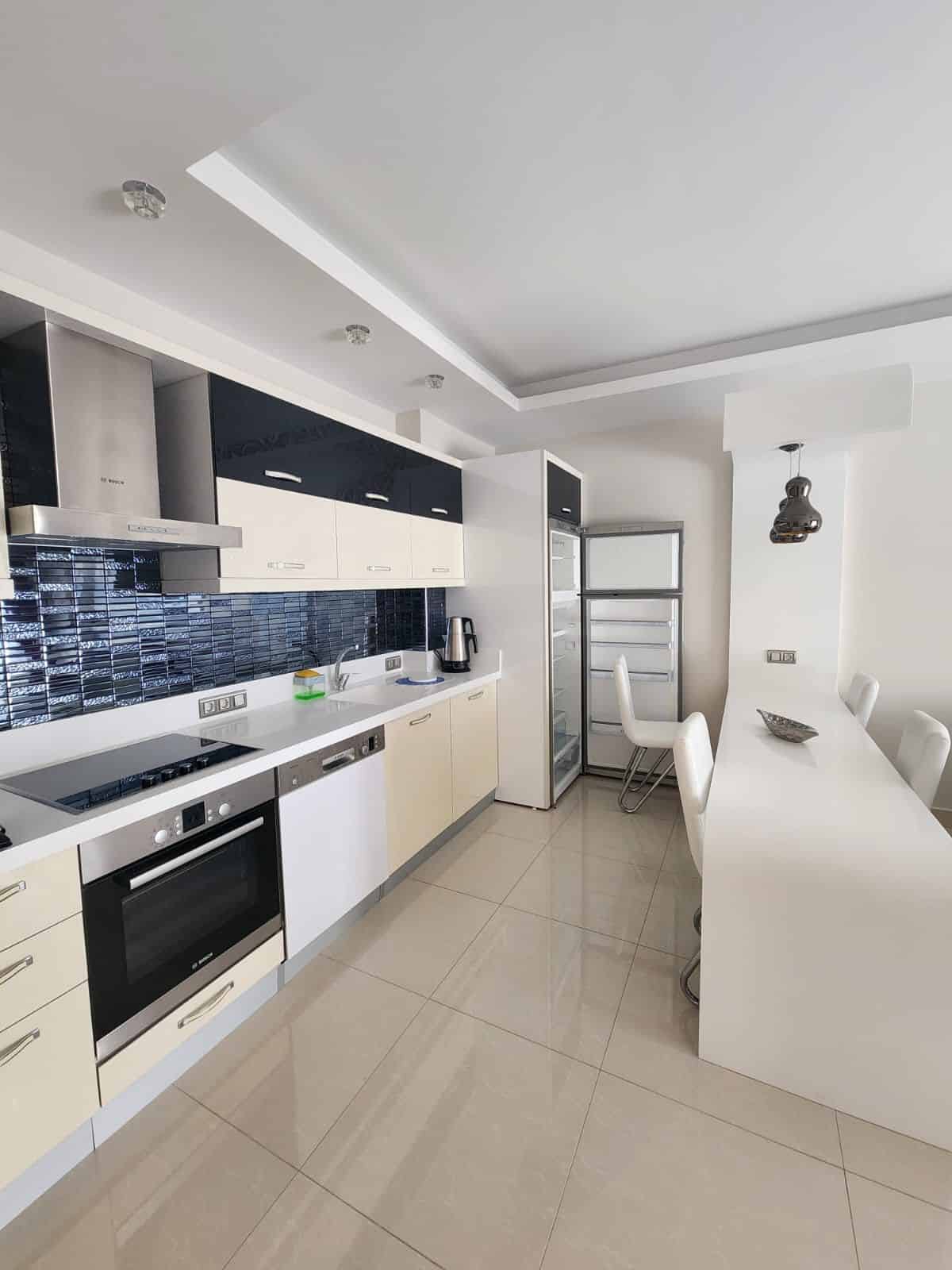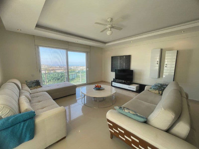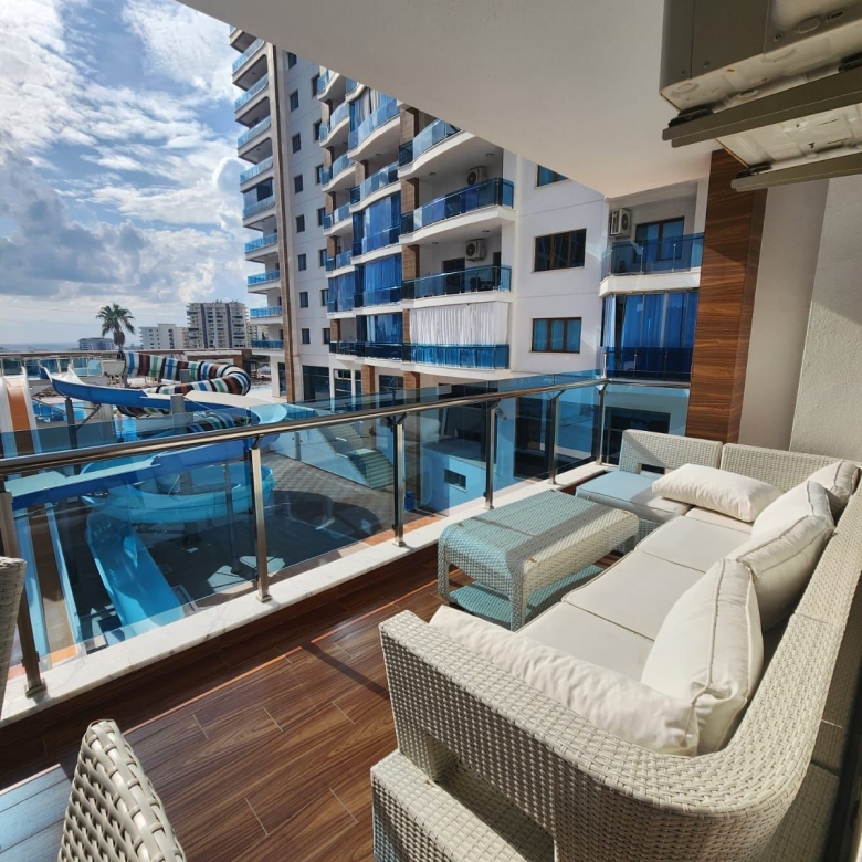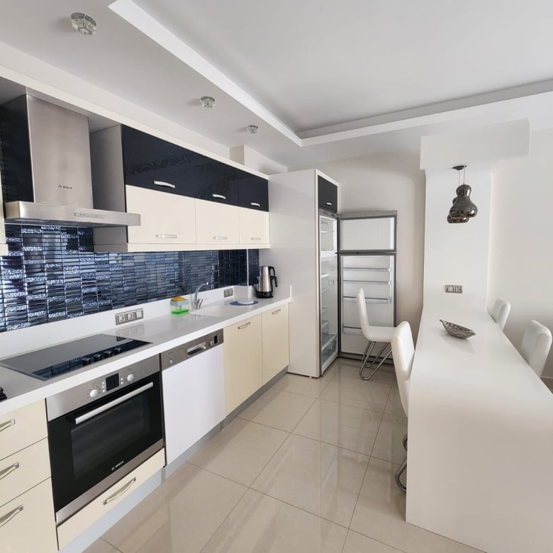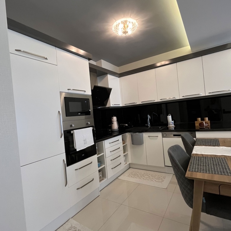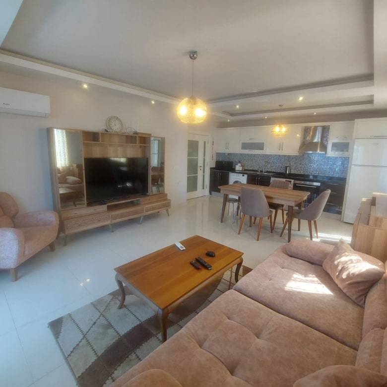 Thisfully furnished apartment in Alanya offerspool views from its private balcony, where you’ll find a comfortable lounge set and outdoor dining table. The interiors are tastefully decorated with modern finishes, creating a bright and comfortable living space.