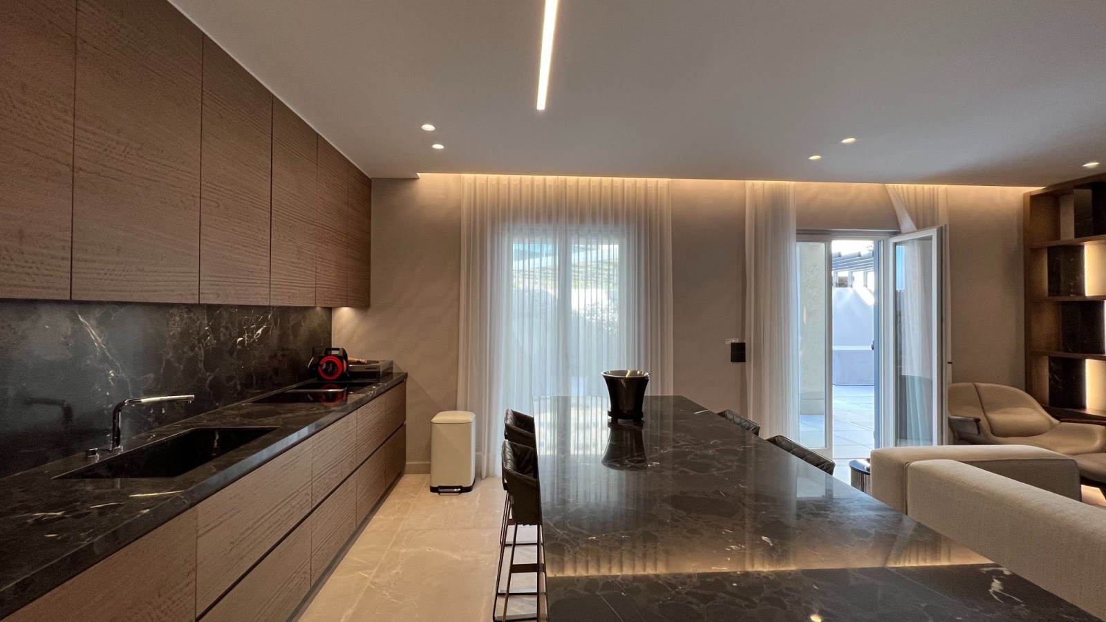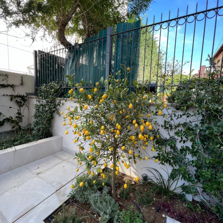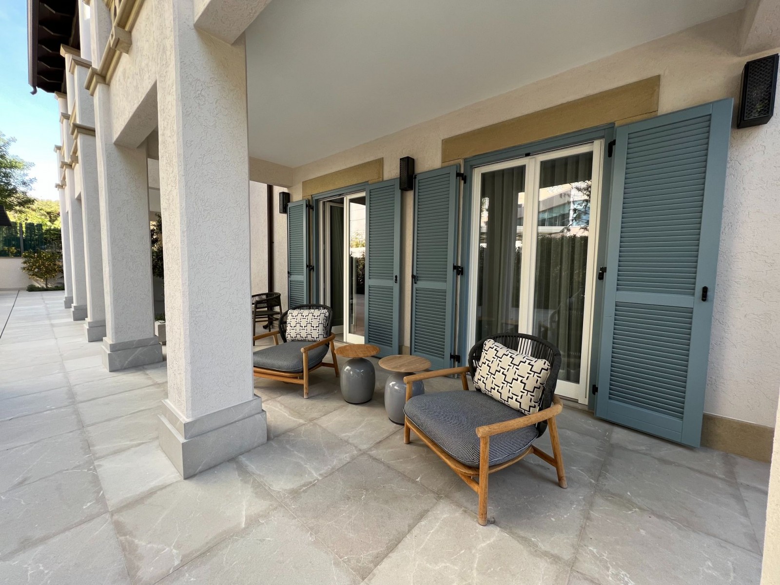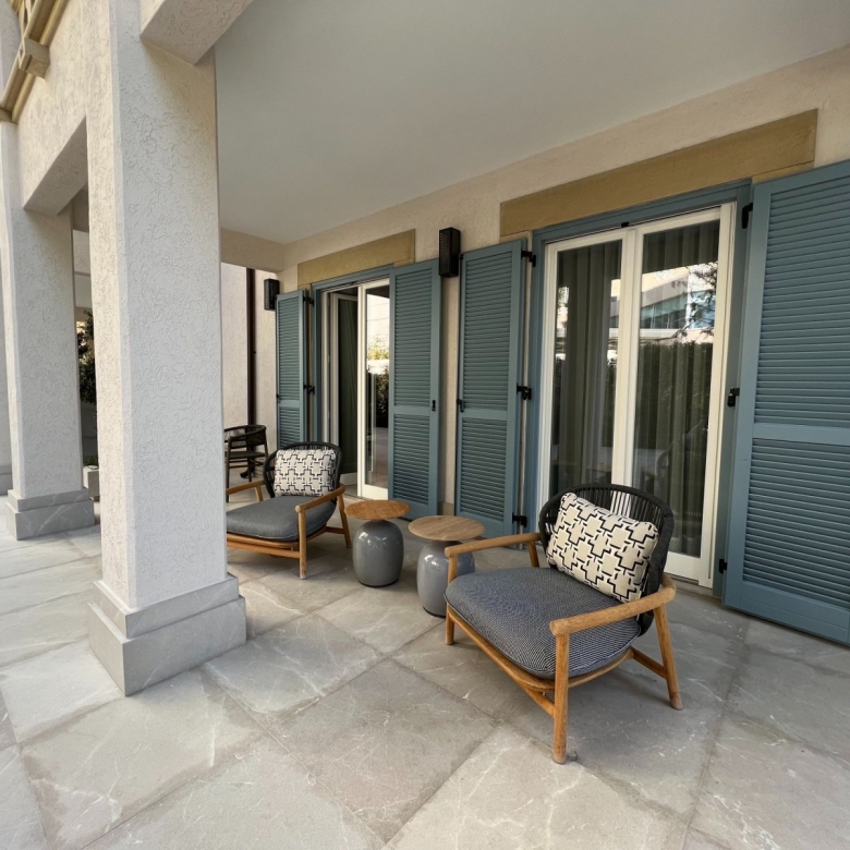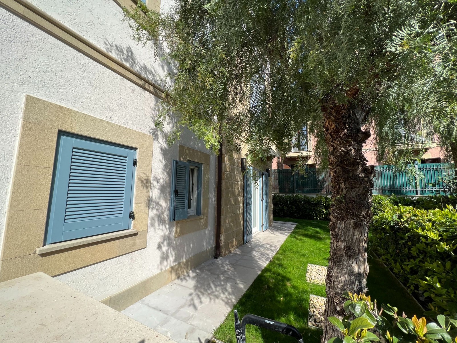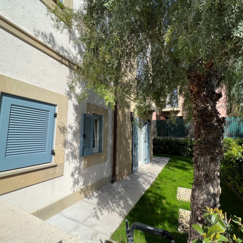 The first line, fully renovated to the highest standard 2-bedroom ground floor apartment, is located in the most impressive gated complex near the beach. The complex has security 24/7, a large swimming pool, a gym area, private access to the beach, and beautiful, well-maintained mature gardens. The apartment is located 100 meters from the Mediterranean Sea. The covered area is 102sq.m, covered veranda is 16sq.m and plot 185sq.m. The property is fully furnished and equipped with electrical appliances. It has 2 bathrooms (showers), 2 spacious bedrooms with built-in wardrobes, a living room and dining areas, a laundry room, an open-plan kitchen, and windows (manual) shutters. Water pressure system, photovoltaic, underfloor heating(water), and VRV air-conditioning system (hot/cold). Title deeds are available. All the essential amenities are nearby and within walking distance, such as supermarkets, kiosks, pharmacies, and restaurants. The access to the highway is a 2-minute drive. The area is popular for its stunning and the most luxurious 5-star hotels with the best restaurants. Very decent neighbourhood.