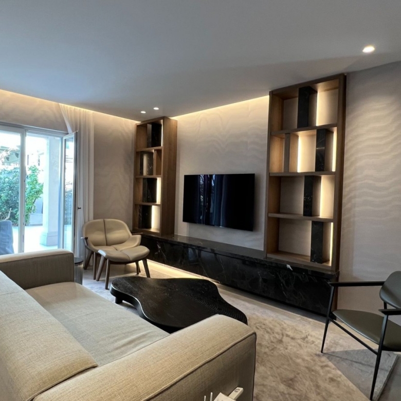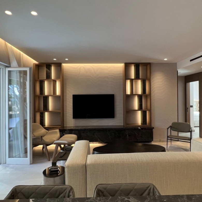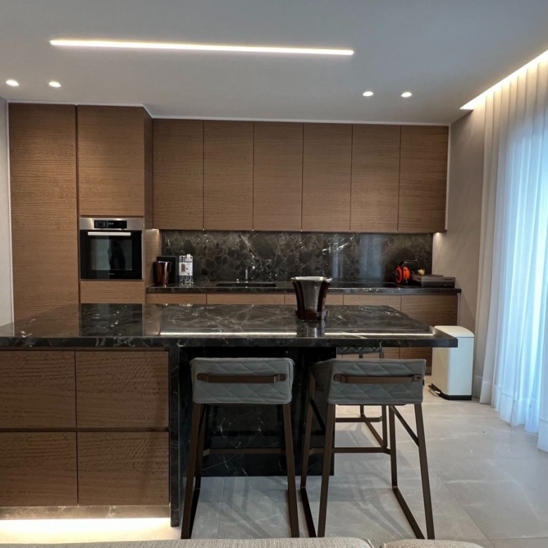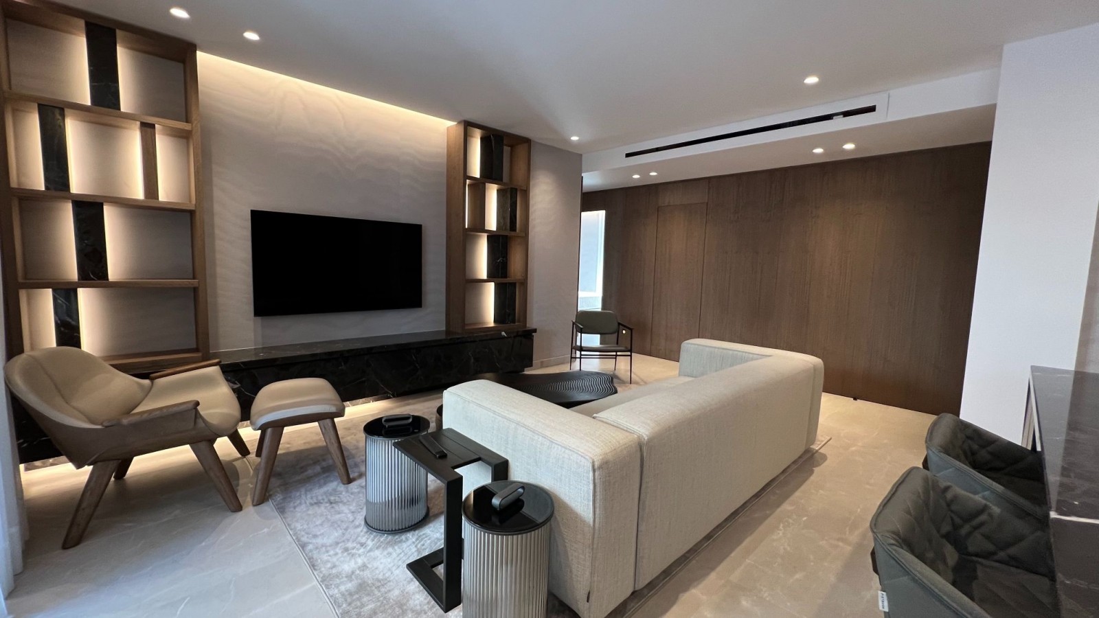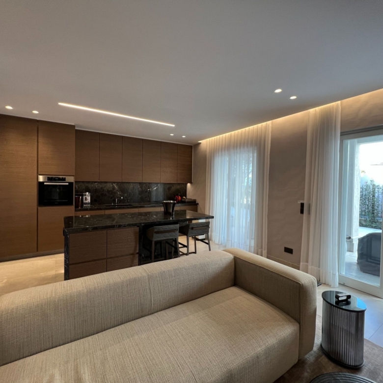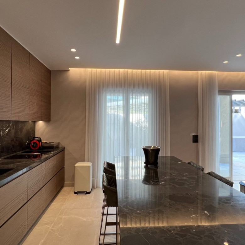 The first line, fully renovated to the highest standard 2-bedroom ground floor apartment, is located in the most impressive gated complex near the beach. The complex has security 24/7, a large swimming pool, a gym area, private access to the beach, and beautiful, well-maintained mature gardens. The apartment is located 100 meters from the Mediterranean Sea. The covered area is 102sq.m, covered veranda is 16sq.m and plot 185sq.m. The property is fully furnished and equipped with electrical appliances. It has 2 bathrooms (showers), 2 spacious bedrooms with built-in wardrobes, a living room and dining areas, a laundry room, an open-plan kitchen, and windows (manual) shutters. Water pressure system, photovoltaic, underfloor heating(water), and VRV air-conditioning system (hot/cold). Title deeds are available. All the essential amenities are nearby and within walking distance, such as supermarkets, kiosks, pharmacies, and restaurants. The access to the highway is a 2-minute drive. The area is popular for its stunning and the most luxurious 5-star hotels with the best restaurants. Very decent neighbourhood.