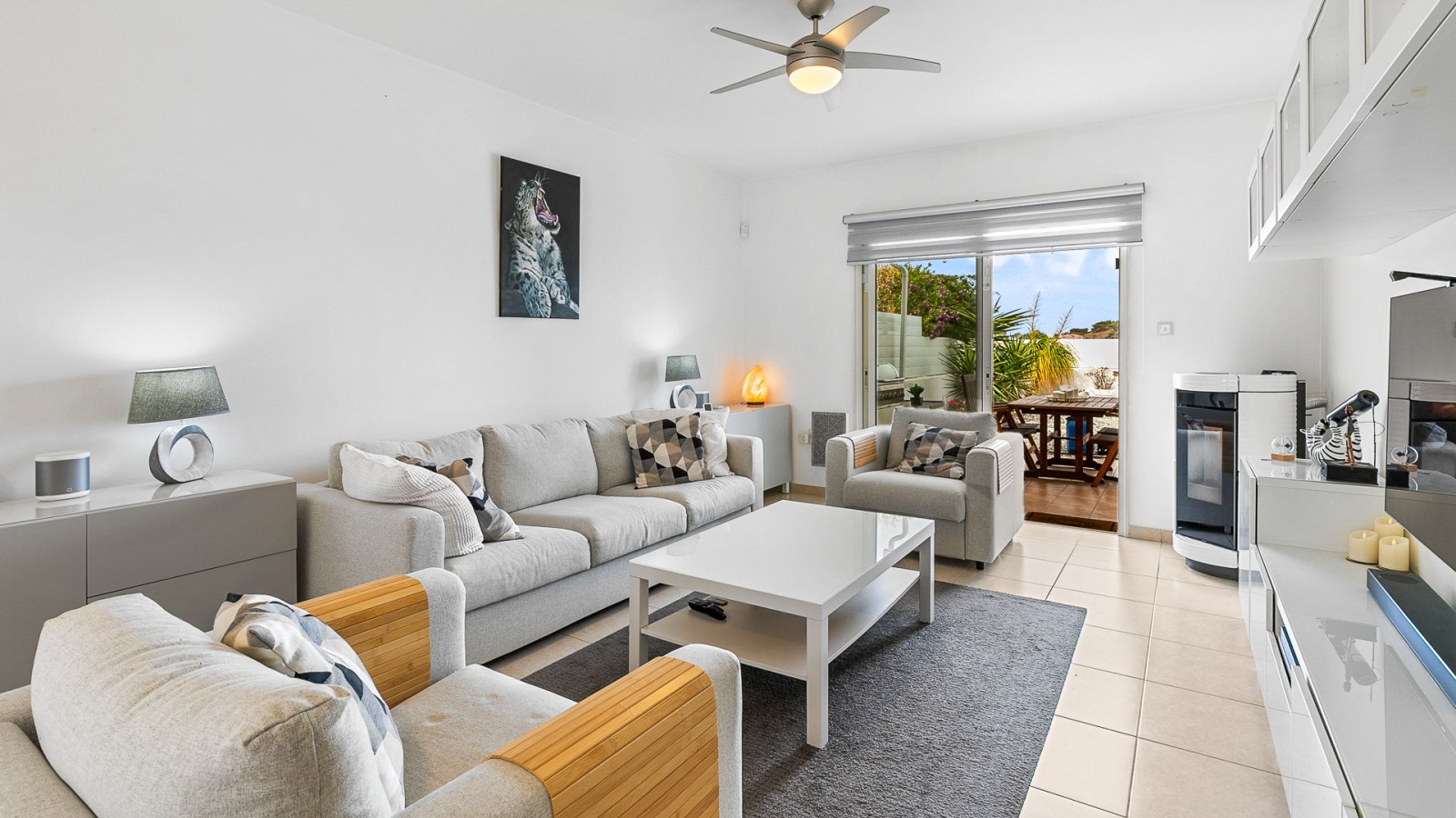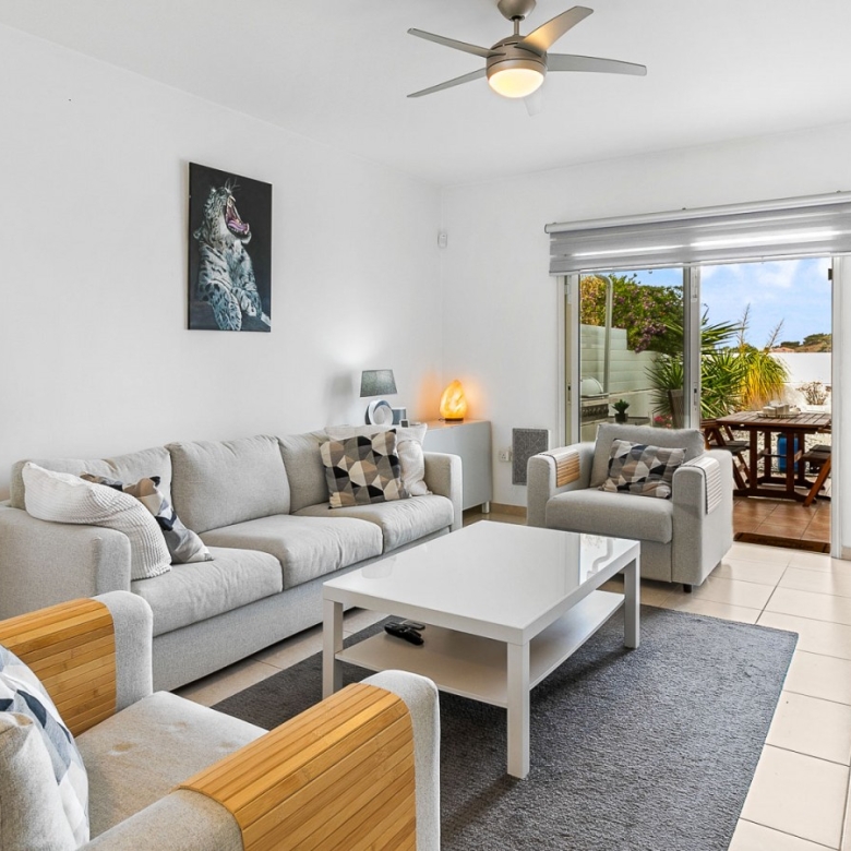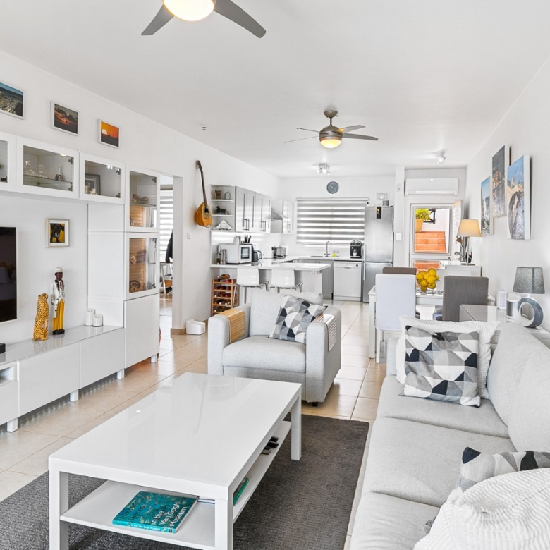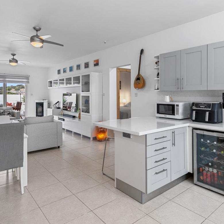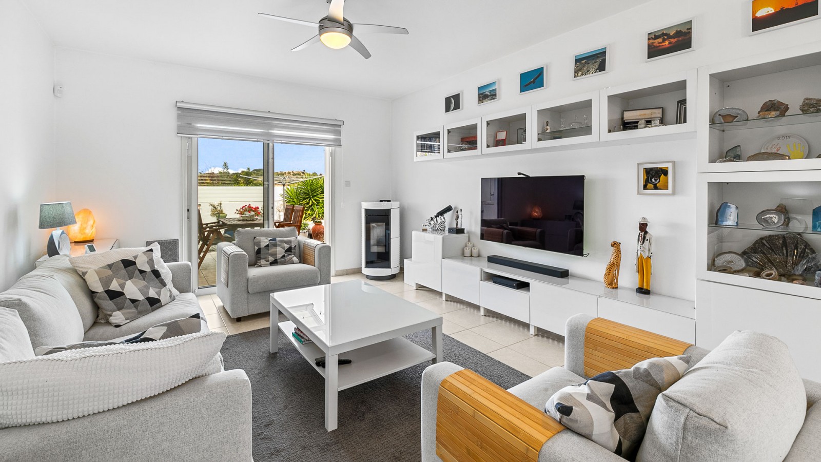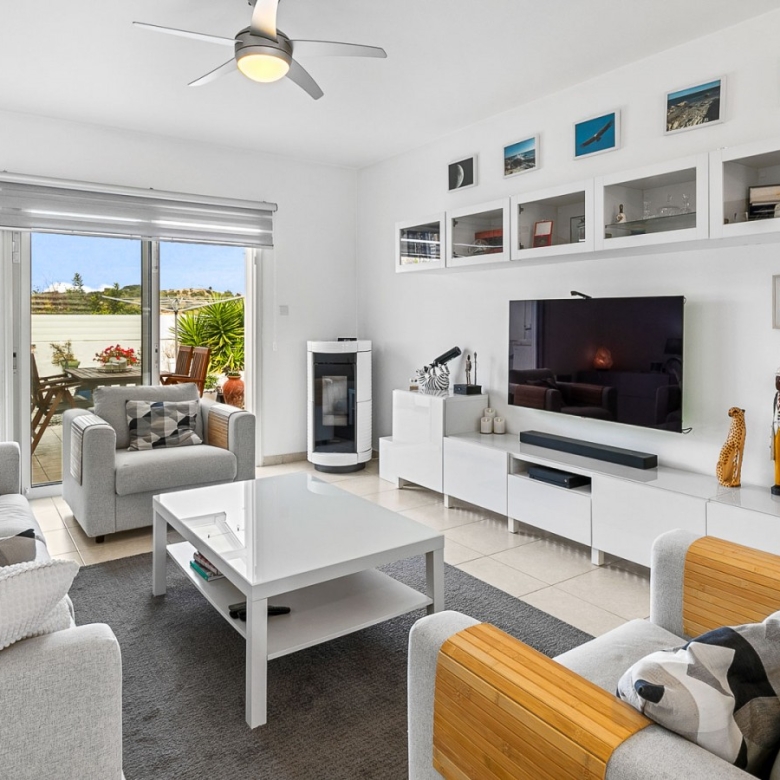 This stunning 2 bedroom ground floor apartment located on a quiet street at the top of Pissouri Village. Pissouri Heights is a smart development of well maintained, high quality, spacious homes with allocated parking and large private gardens for the ground floor apartments. This home has been especially well presented by its discerning Owners. You enter into a small hall space which then expands into the large open plan living area. A fully fitted, modern kitchen with breakfast bar, is located to your right with all fitted, modern appliances for today’s modern home. Through your large living space, you access the garden via patio doors out to a covered area and a low maintenance garden space. The two bedrooms are sleek and smart with sliding wardrobe doors and modern zebra blinds and the newly renovated family bathroom is a good size serving both bedrooms. From the main bedroom a covered terrace has been closed in to create a suite. This useful space can be utilised as an office, gym space or, as now, a cosy relaxing, reading space to unwind.