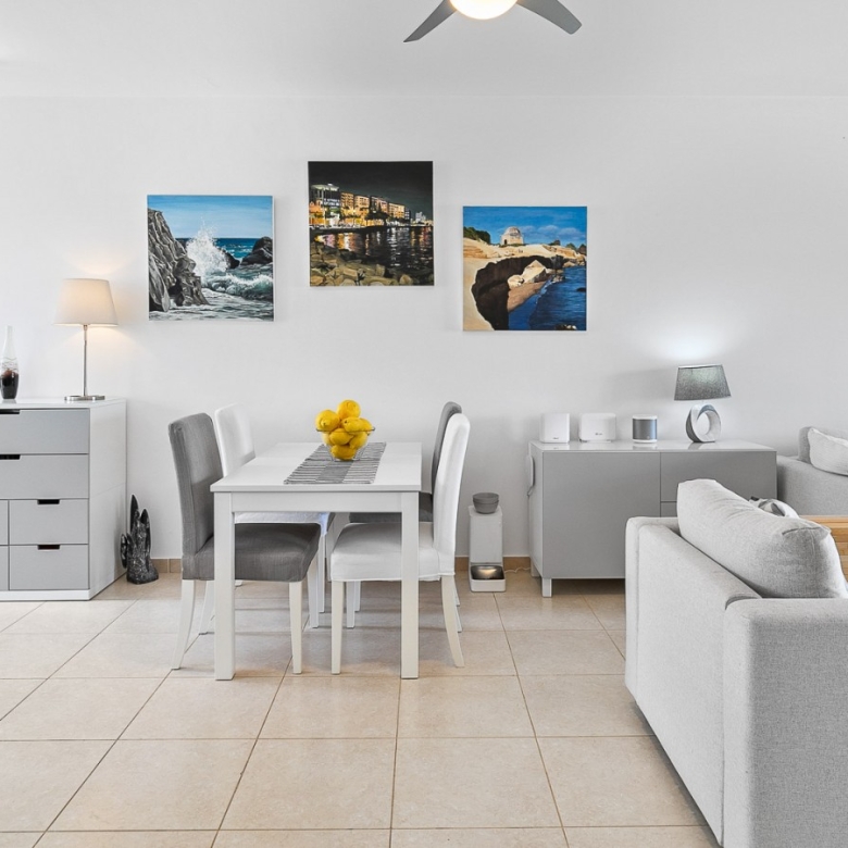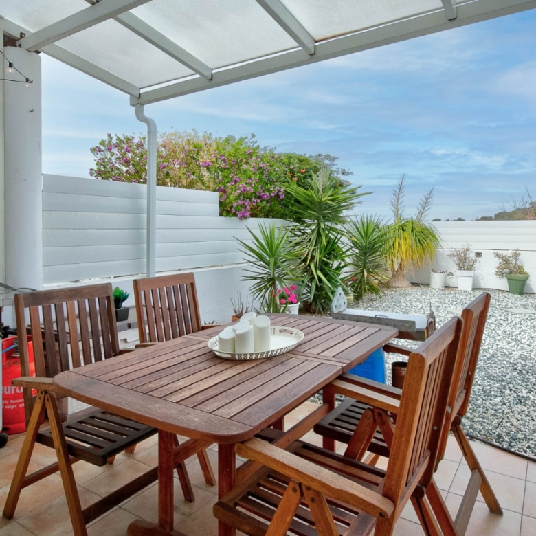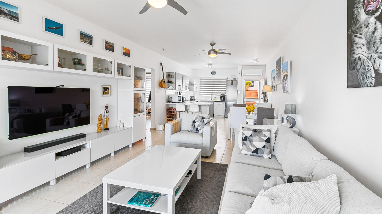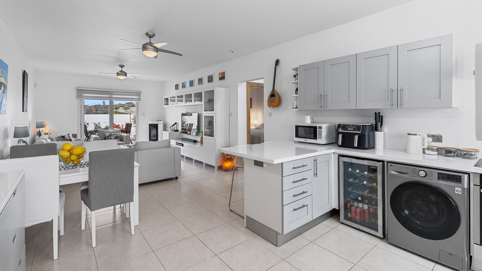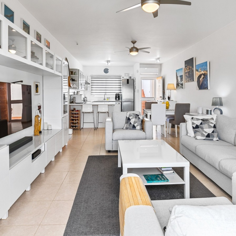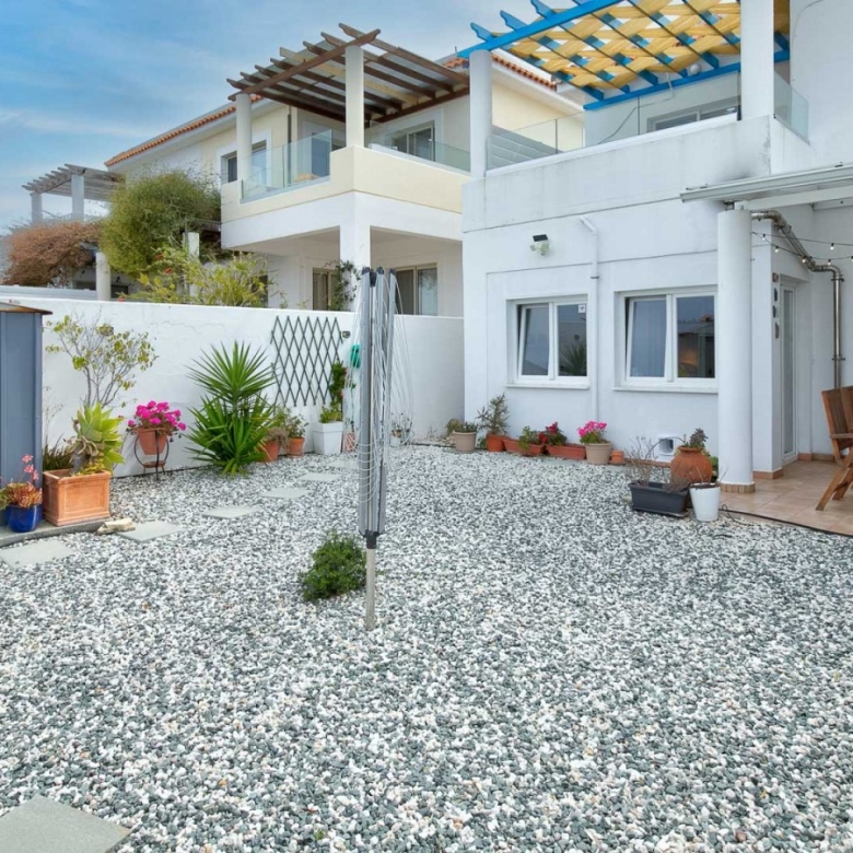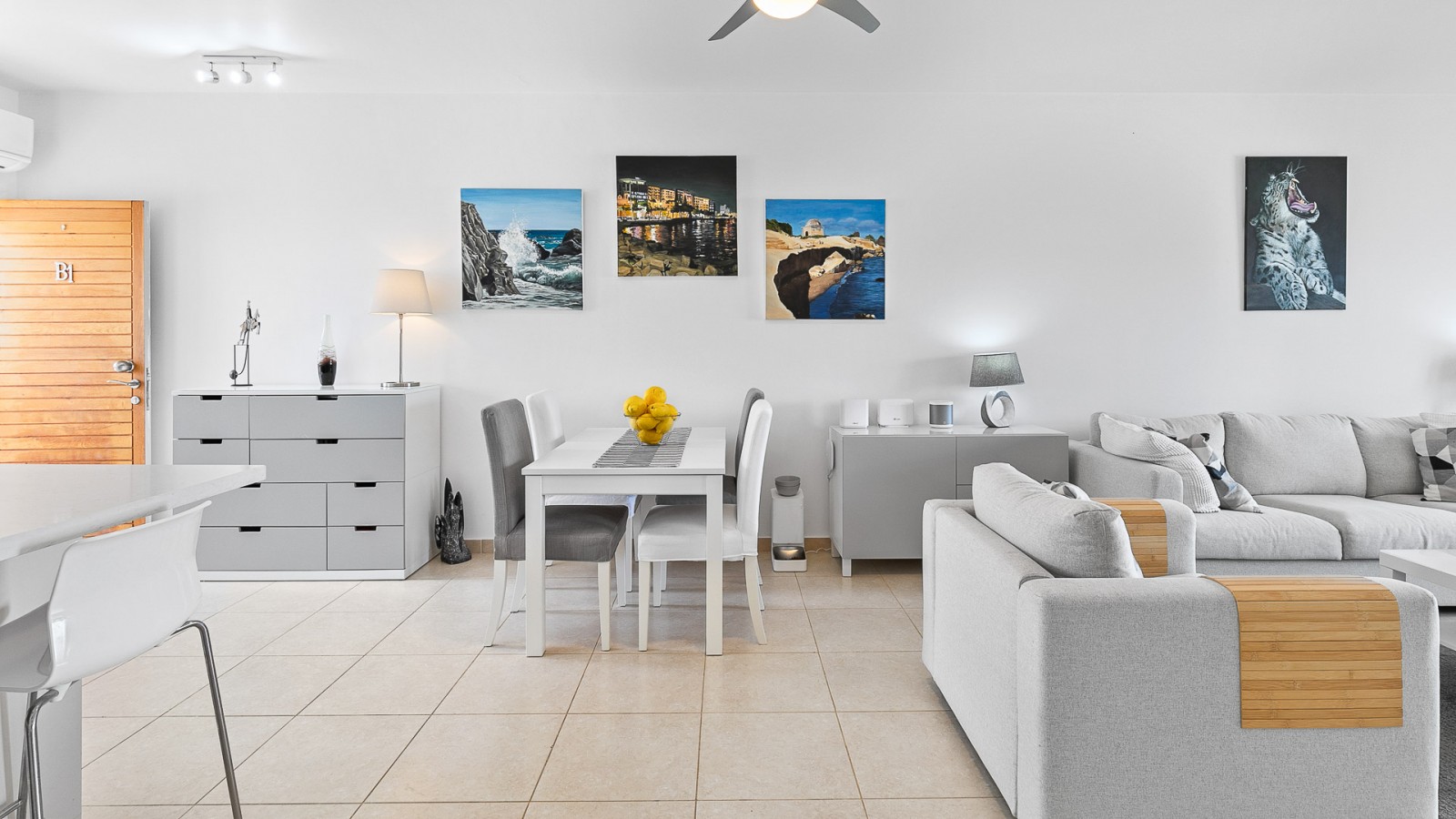 This stunning 2 bedroom ground floor apartment located on a quiet street at the top of Pissouri Village. Pissouri Heights is a smart development of well maintained, high quality, spacious homes with allocated parking and large private gardens for the ground floor apartments. This home has been especially well presented by its discerning Owners. You enter into a small hall space which then expands into the large open plan living area. A fully fitted, modern kitchen with breakfast bar, is located to your right with all fitted, modern appliances for today’s modern home. Through your large living space, you access the garden via patio doors out to a covered area and a low maintenance garden space. The two bedrooms are sleek and smart with sliding wardrobe doors and modern zebra blinds and the newly renovated family bathroom is a good size serving both bedrooms. From the main bedroom a covered terrace has been closed in to create a suite. This useful space can be utilised as an office, gym space or, as now, a cosy relaxing, reading space to unwind.