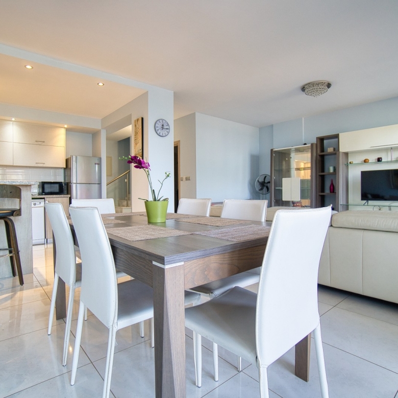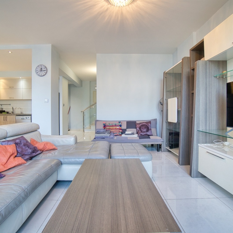Spacious bright and warm apartment with an amazing direct sea views.  On the ground floor there is an entrance hall, a pantry, a kitchen, a dining / living room and a guest toilet. Exit to a huge terrace of 67 sq.m. (25 sq.m. covered, 42 sq.m. open).On the first floor there are 3 double bedrooms, one of which is a master bedroom, and another family bathroom with a bathtub. Air conditioning in all rooms, LCD TV, internet, and more. Built-in wardrobes in each bedroom. 2 parking places in title.