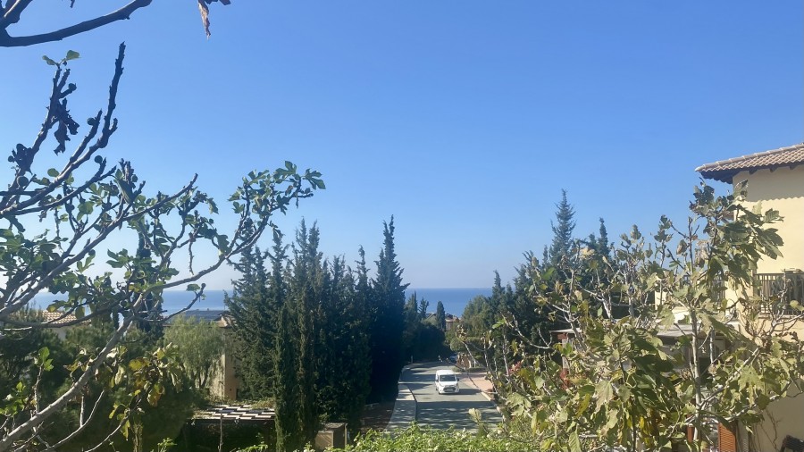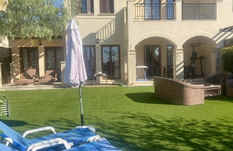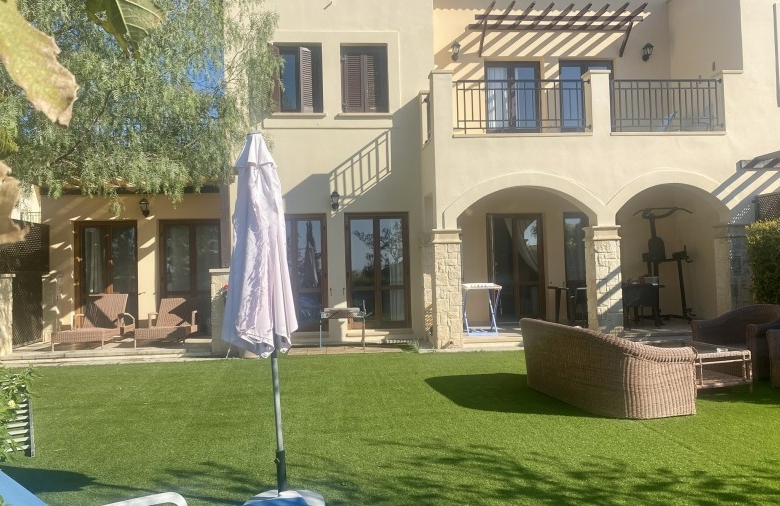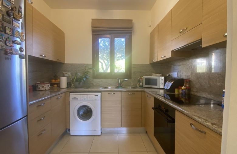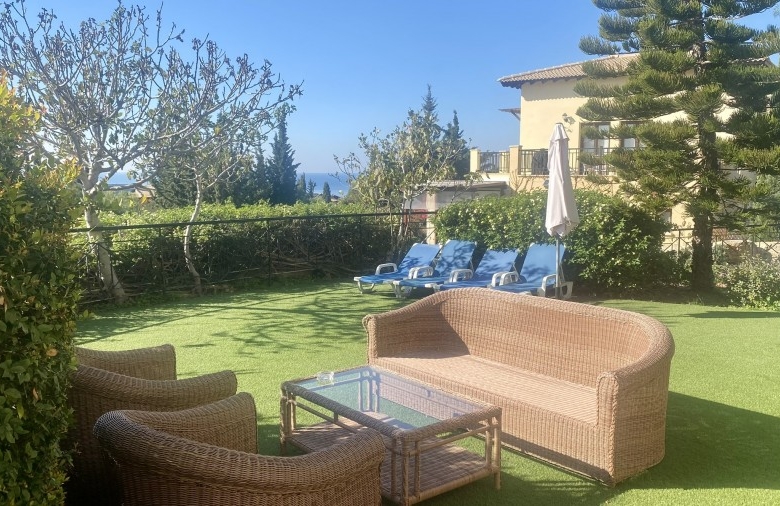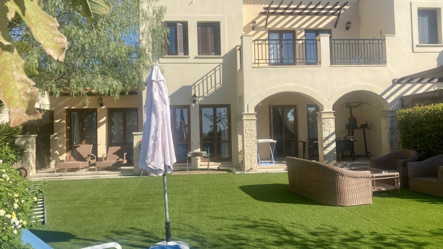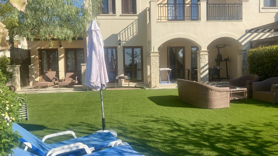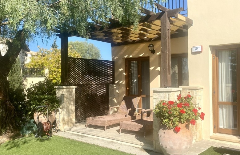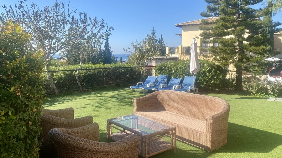 This lovely 2 bedroom garden apartment is located in the heart of Theseus Village within walking distance of all the amenities of the Aphrodite Hills Golf Resort. There is no doubt that its garden is a huge draw, being well maintained and with lovely sea views over the neighbouring villas. The property is located on a corner plot with two double bedrooms which open out onto the garden and two bathrooms. There are nice covered pergolas in the garden which is very well screened from its only neighbour and the apartment is well fitted throughout with marble floors and worktops with quality appliances and air conditioning and ceiling fans throughout. All in all this makes a perfect holiday home for the discerning purchaser who wishes to have the choice of two superb swimming pools on the doorstep, the peace and calmness of their own fabulous garden, lovely views and just a short walk to all the recreational and social facilities of the Resort.