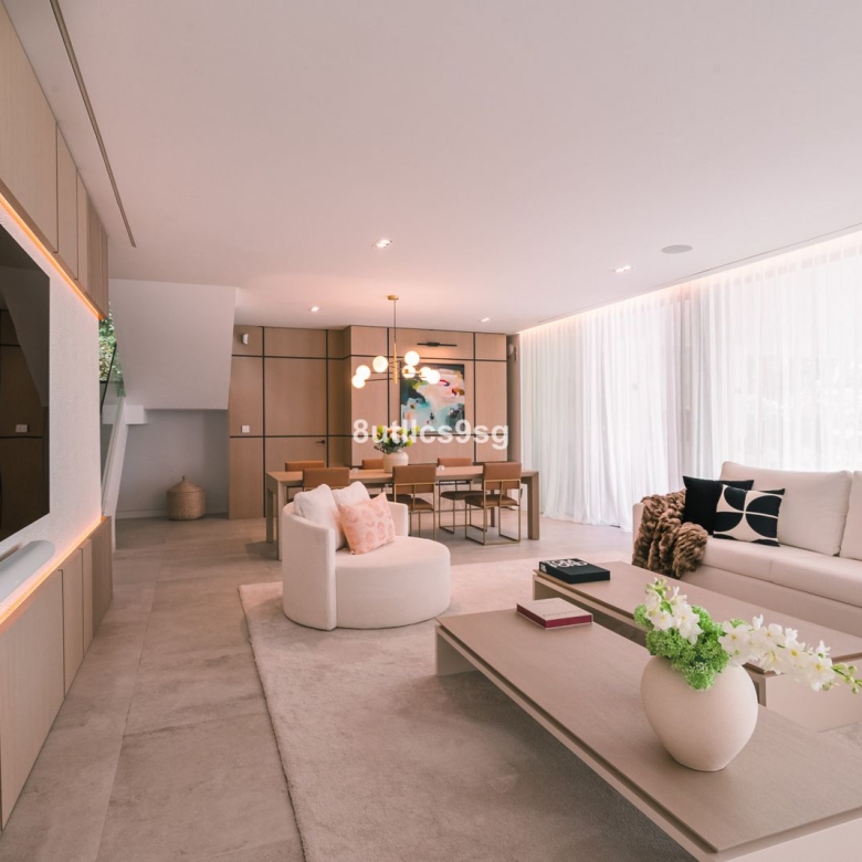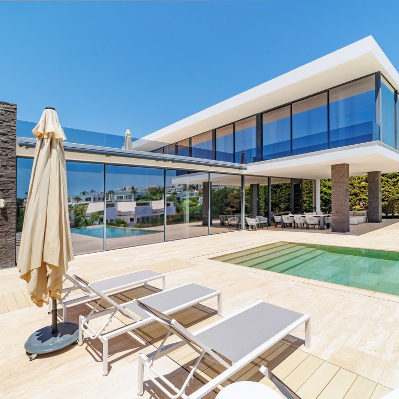Luxurious property for sale in this exclusive seafront resort offers a contemporary design, ample interior spaces with views out into the Mediterranean through enormous windows, and extensive terraces with private pools. The use of high-quality materials and cutting-edge technology make this development a real gem. All the homes come with at least two large garage spaces and one storeroom.
