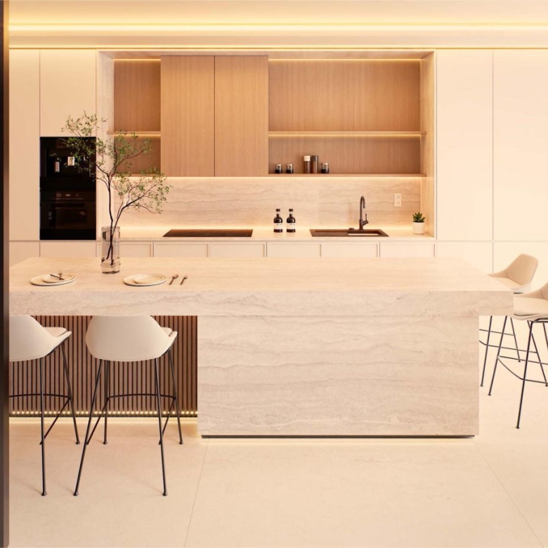 It comprises two spacious bedrooms with built-in wardrobes, two modern bathrooms, a bright living room opening onto a 25 m² terrace, and a fully equipped, contemporary kitchen.