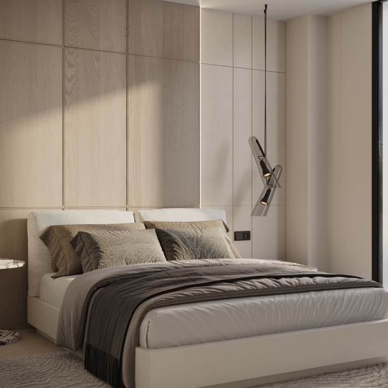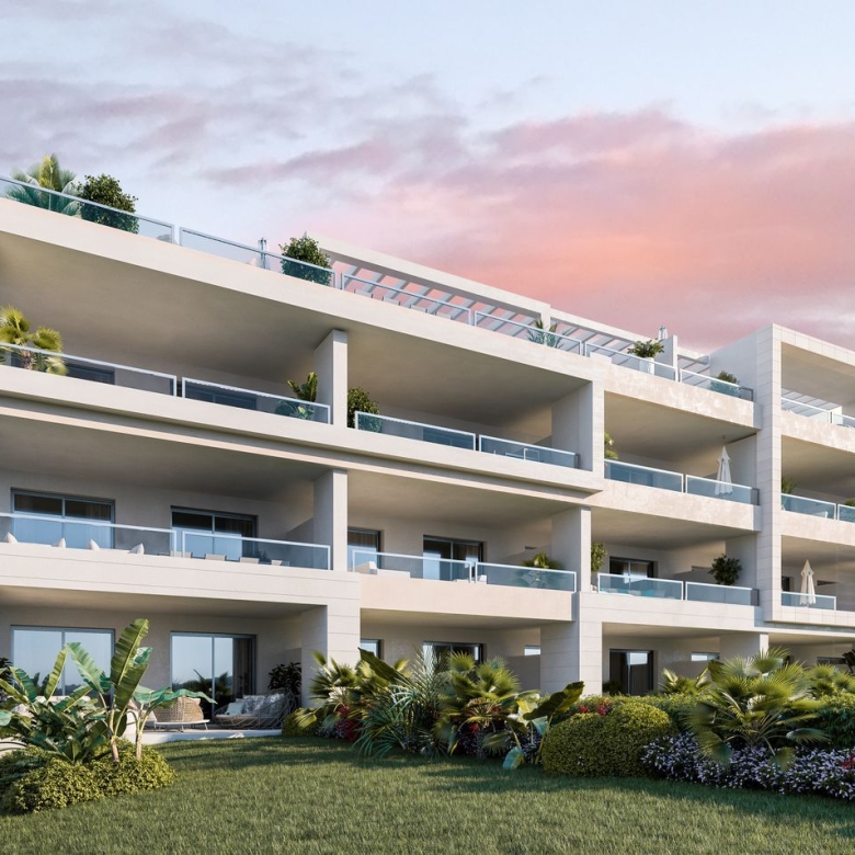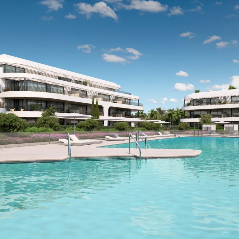 The apartment itself is set within a secure, gated development that includes four communal swimming pools distributed throughout the complex, ensuring a quieter, more relaxed atmosphere. These pools are surrounded by lush, landscaped gardens with walking paths, tropical planting, and shaded seating areas. The apartment also includes private underground parking for added convenience.