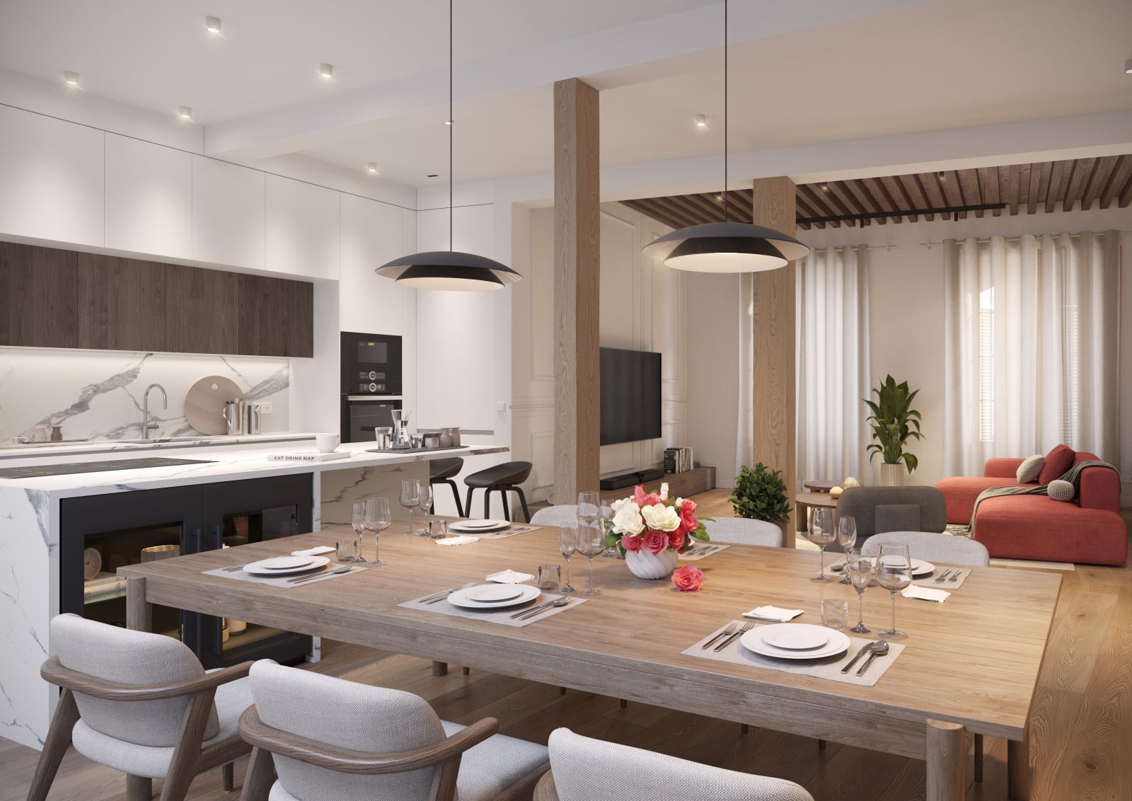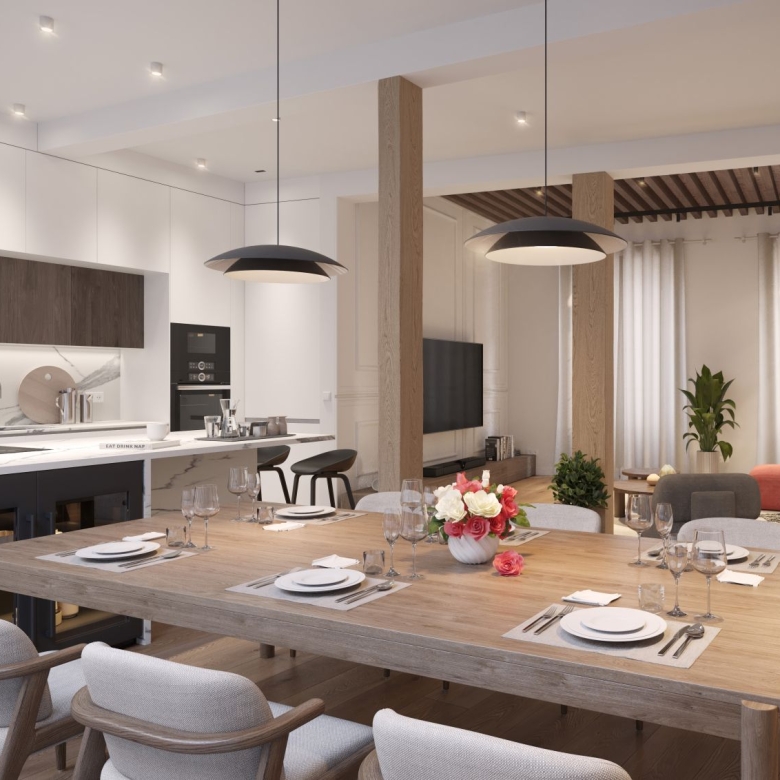 The entrance lobby in this raised ground floor apartment leads to a bright, generous living room. There are french doors onto the private terrace. The lobby also leads to the fully fitted and equipped kitchen which also overlooks the living room.