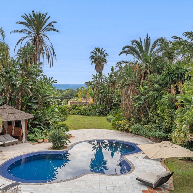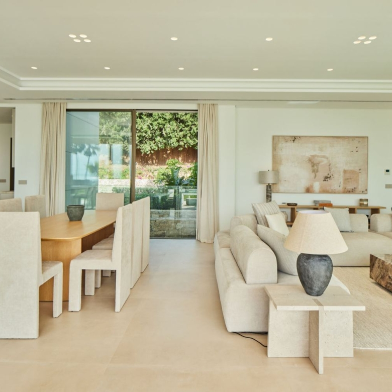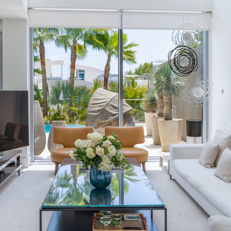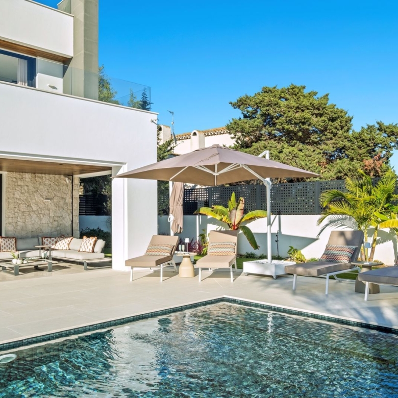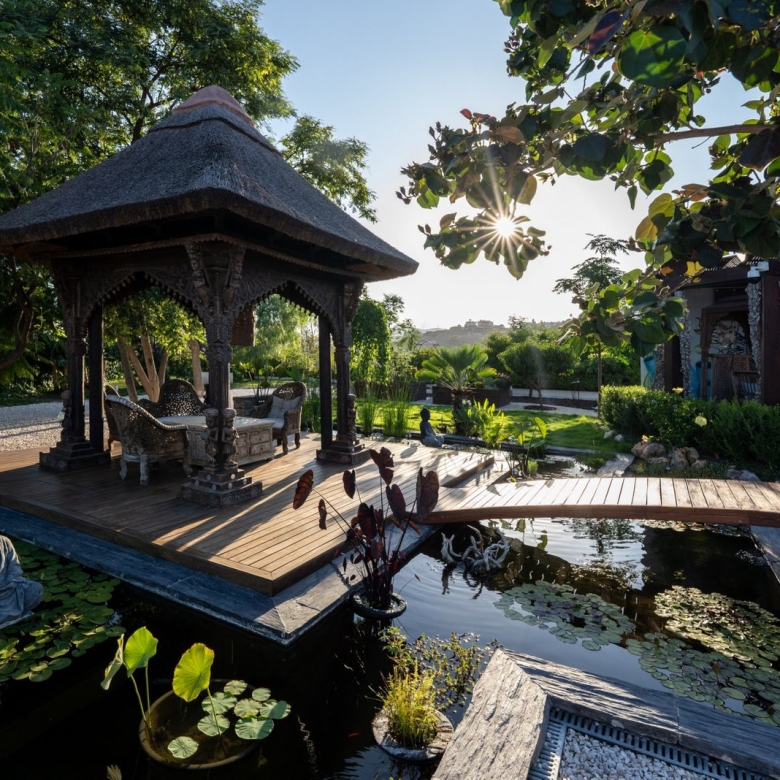 The very private front terrace has been set up for outdoor living, featuring a dining table, sunbeds, and an awning to provide shade during hot summer days. From here, you can also access the community garden area.