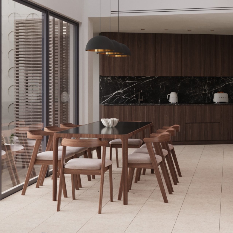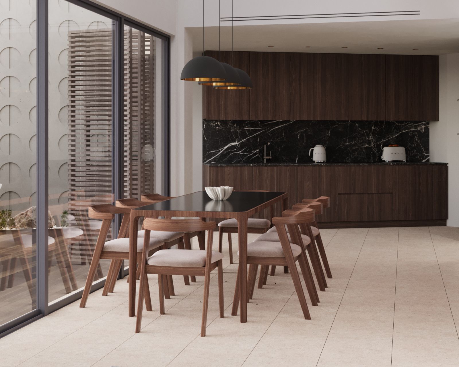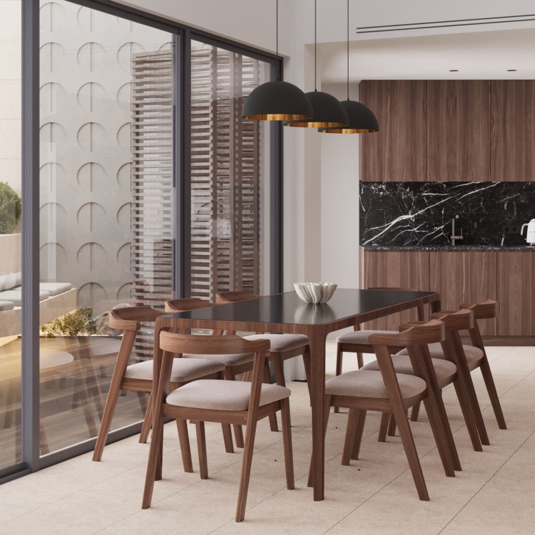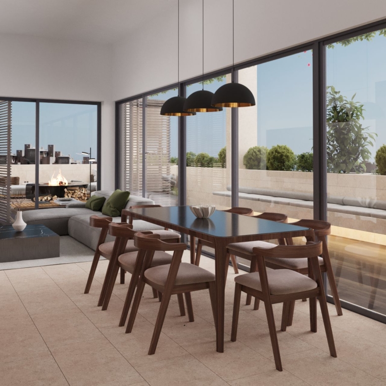 The open-plan living and dining area retains a warm, inviting atmosphere, enhanced by traditional finishes and natural light. The living room leads on to a small terrace, with enough space for a small table and chairs to enjoy the evening breeze.