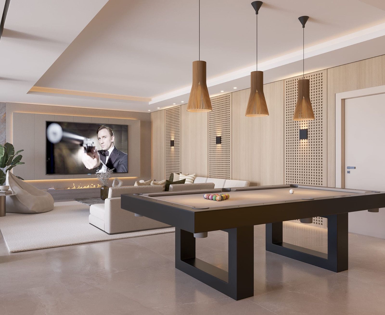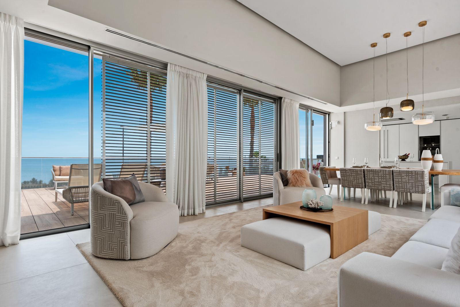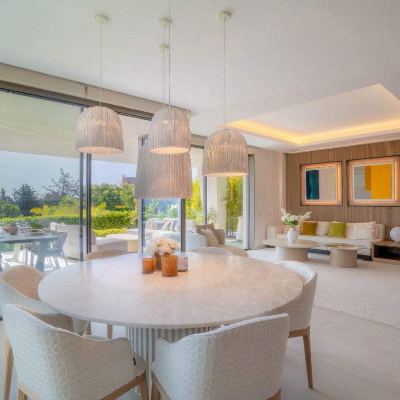 With 186 m² of beautifully designed interior space, this four-bedroom, three-bathroom apartment has been meticulously upgraded to the highest standards. The open-plan layout centres around a designer kitchen equipped with top-tier German appliances, an invisible induction hob and a built-in wine fridge. A second kitchen offers added practicality, ideal for hosting or private catering. Sleek flooring flows throughout, leading to a spacious living area with a contemporary electric fireplace and integrated Bang & Olufsen sound system, perfect for both relaxation and entertaining.