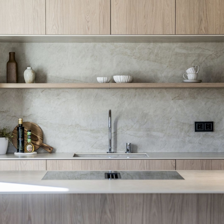 Entering the living area, you are greeted by a bespoke kitchen that exudes both elegance and functionality. It features stunning deep wooden accents on the island and cupboards, complemented by a soothing ‘Taj Mahal’ marble countertop. With ample storage, generous counter space, and a wine cooler, it is a modern kitchen that is incredibly functional for those who enjoy cooking and gatherings. The living room area is warm and inviting, featuring a majestic TV-wall with a spacious bench that offers ample storage.