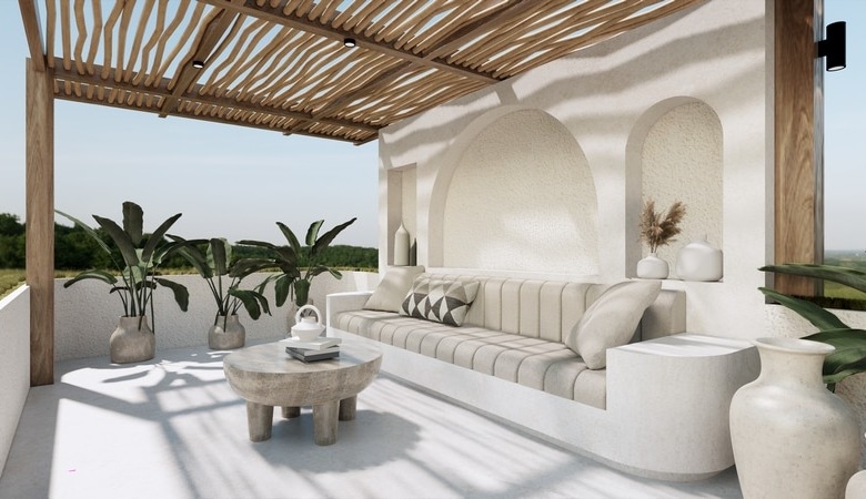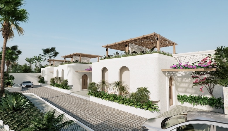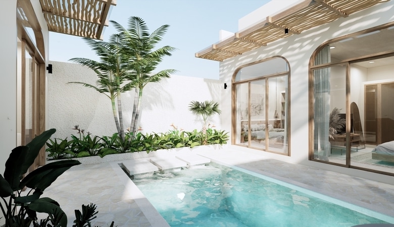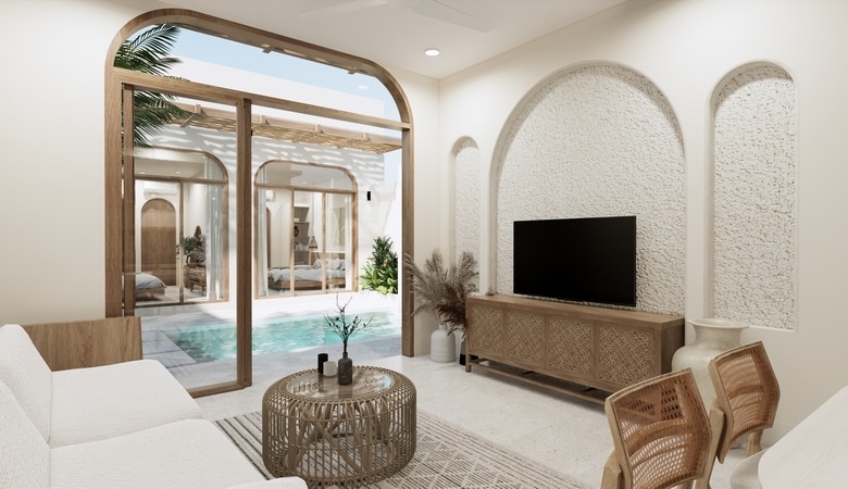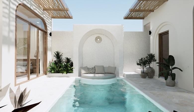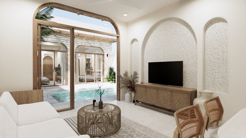 Each villa is thoughtfully designed with an open-plan living area that seamlessly connects to a private swimming pool, creating the perfect space for relaxation and entertaining. Both bedrooms are positioned on the ground floor, offering pool views and ensuite bathrooms equipped with luxurious bathtubs and rain showers. Upstairs, the rooftop terrace provides a versatile space for dining under the stars or enjoying panoramic sunset views.