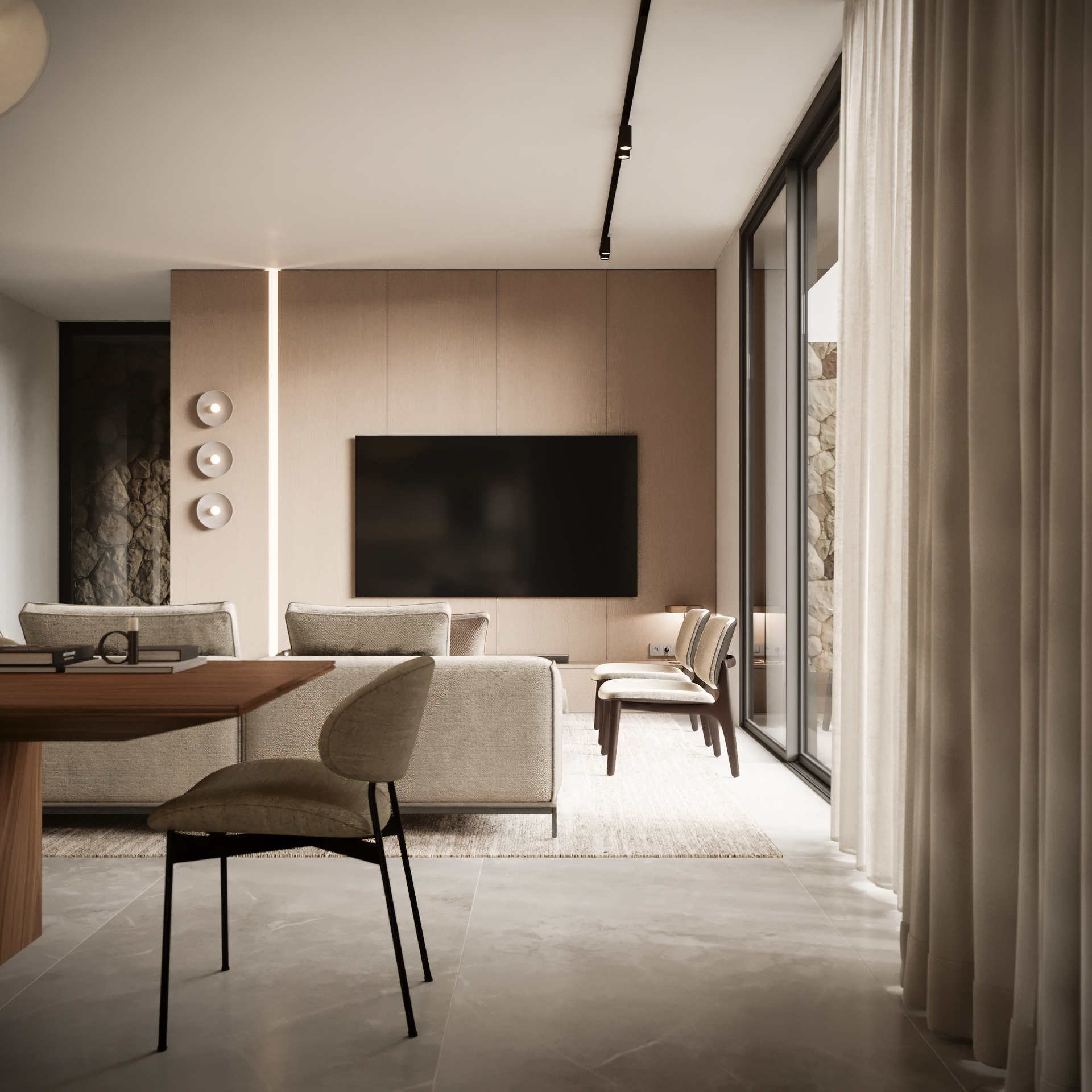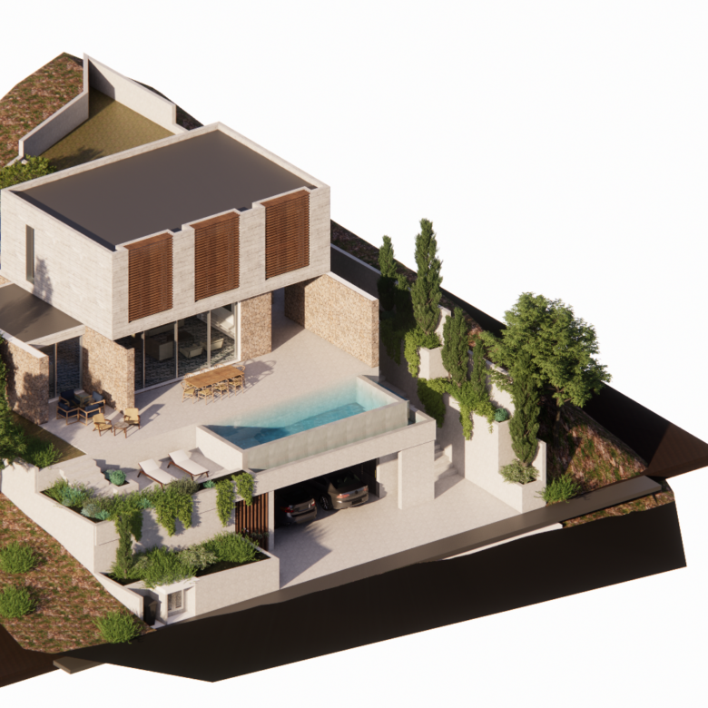 This Hilltop villa features four spacious bedrooms, three bathrooms and an additional guest toilet. Distinguished by the use of high-quality materials, it’s a testament to sophistication. Fairfaced concrete, stone walls, and wood cladding are employed to create a captivating aesthetic, ensuring a unique character.