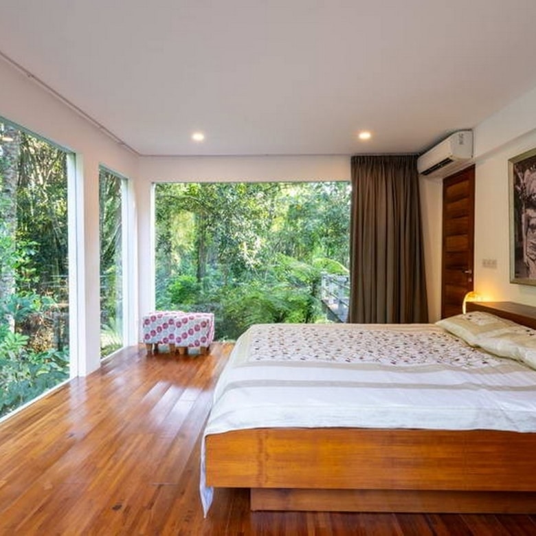 The second, a two story one-bedroom en-suite villa, offers a unique experience with large glass windows that frame the mesmerizing forest, illuminated at night by carefully placed forest lights.