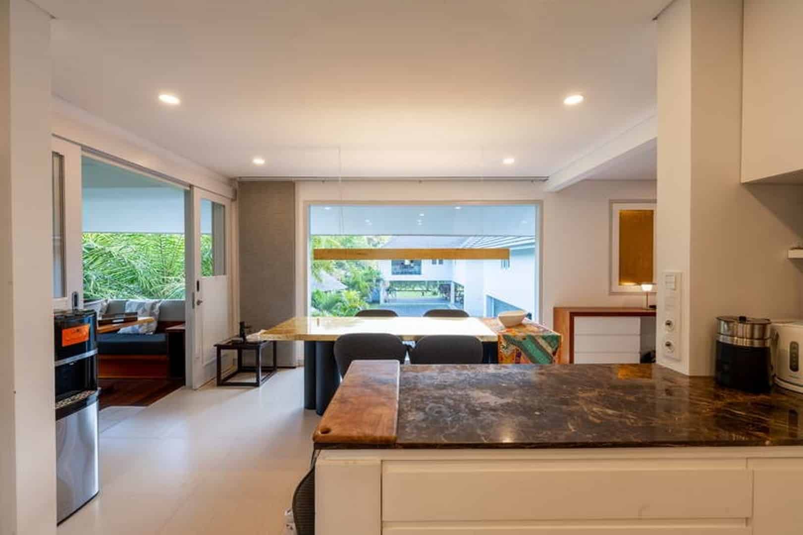 The open-plan kitchen, dining room, and lounge areas feature high ceilings and glass stacking doors that seamlessly blend the indoor and outdoor spaces.
